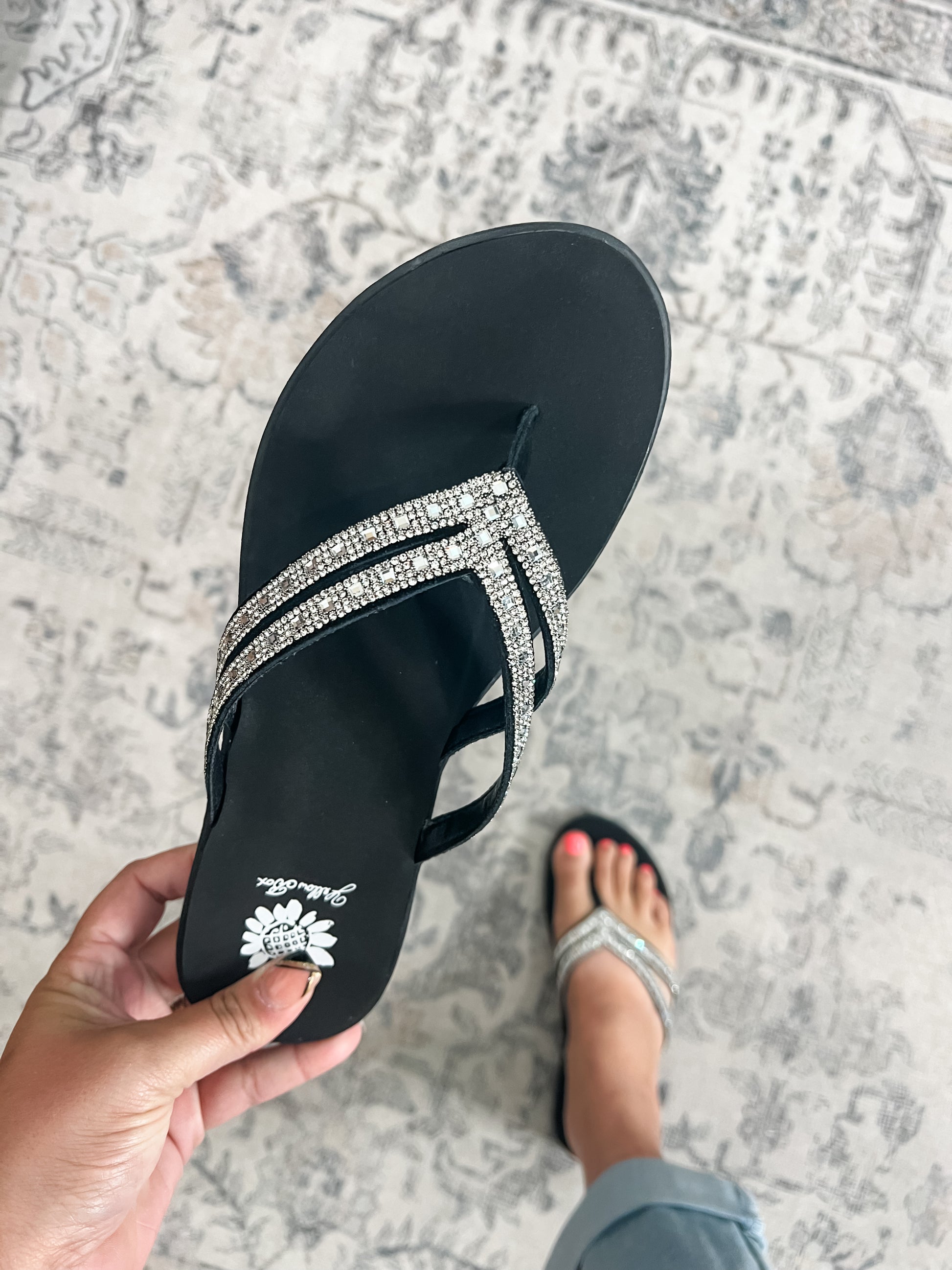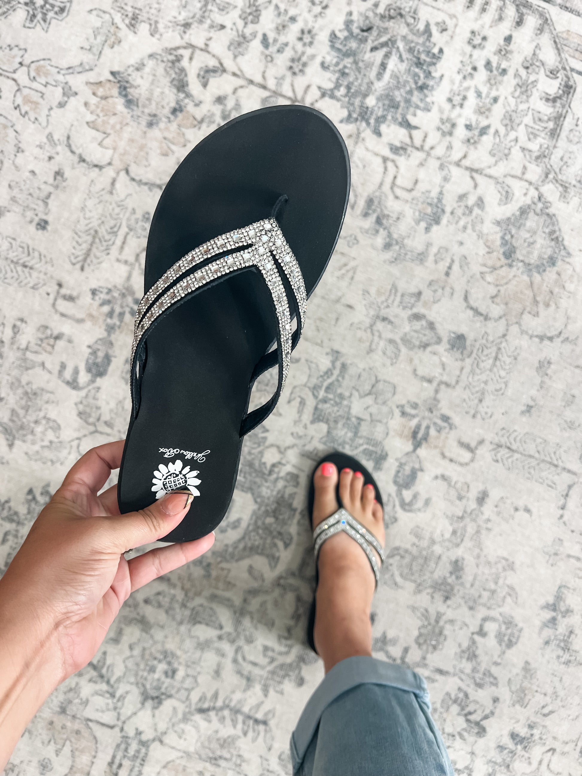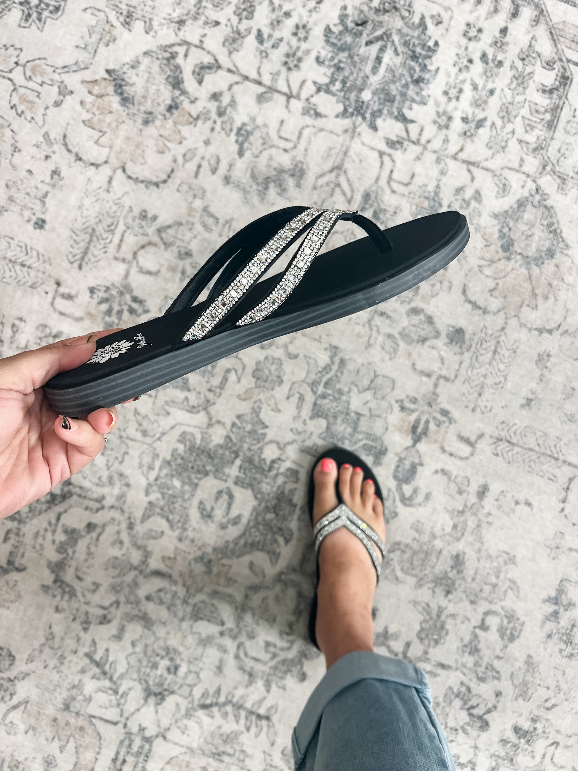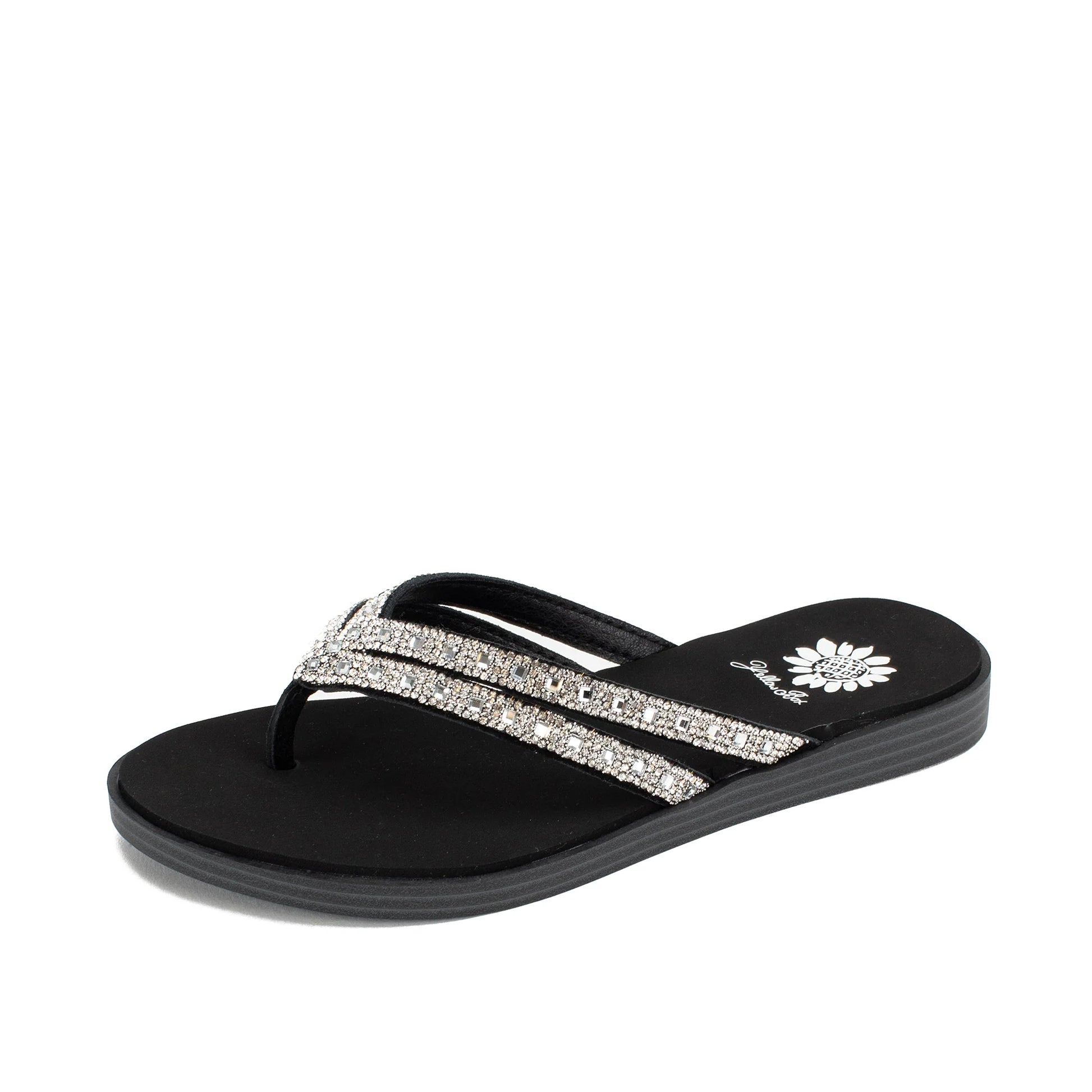 The "Dalia" Double Strap Rhinestone Flip Flop by Yellowbox offers the best of both worlds with its combination of yoga mat comfort and durable bottom sole. Its comfortable straps are designed to not rub against your feet, making it suitable for all-day wear. Plus, the roomy straps makes it friendly for those with high arches.