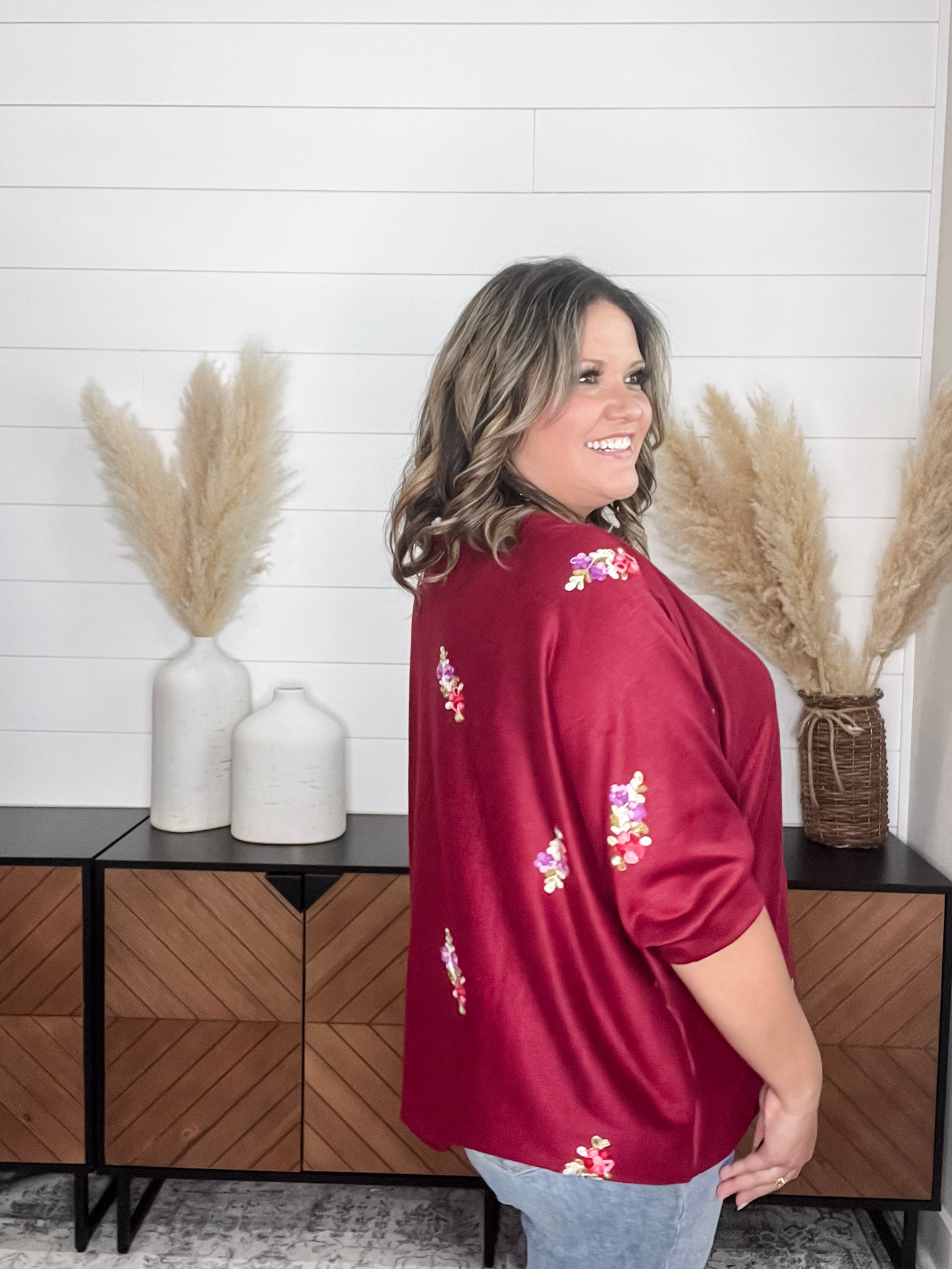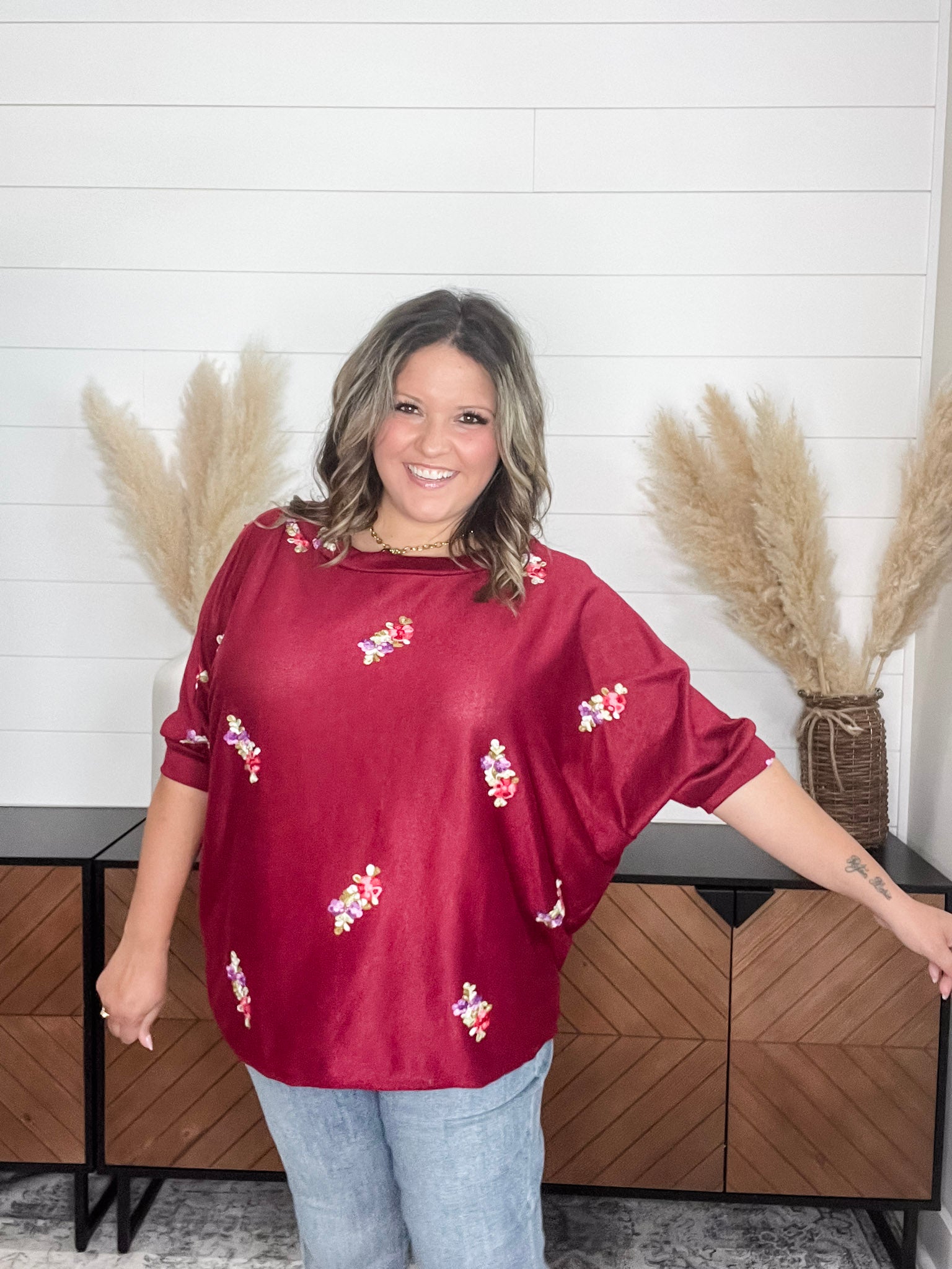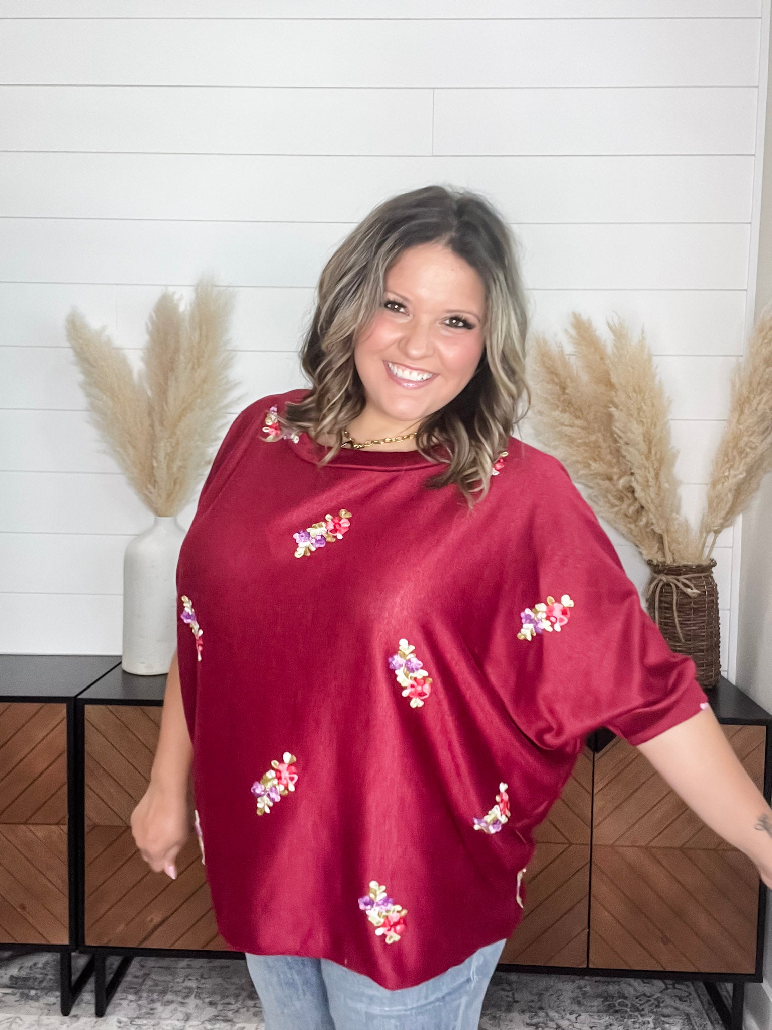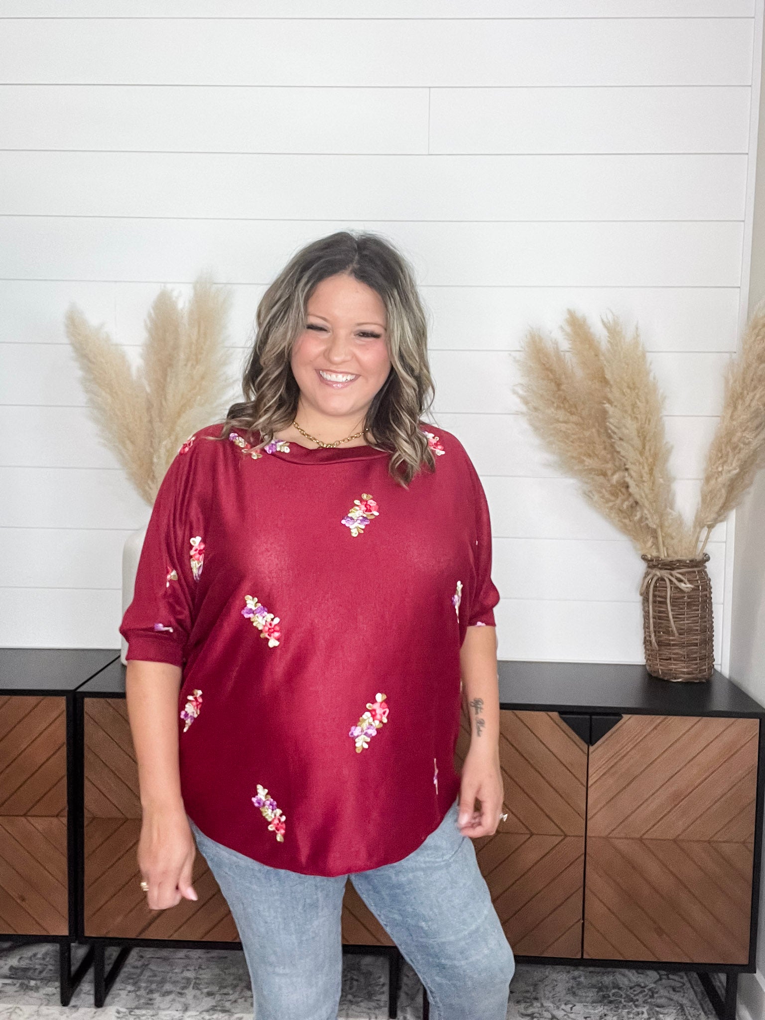 Embrace effortless charm with the "Deceptive" Floral Embroidered Short Sleeve Dolman in rich wine. Crafted from soft knit fabric, this playful top features delicate embroidered flowers and a roomy dolman fit that’s true to size. The cuff and collar add a touch of polished flair, making it perfect for days when comfort meets style.