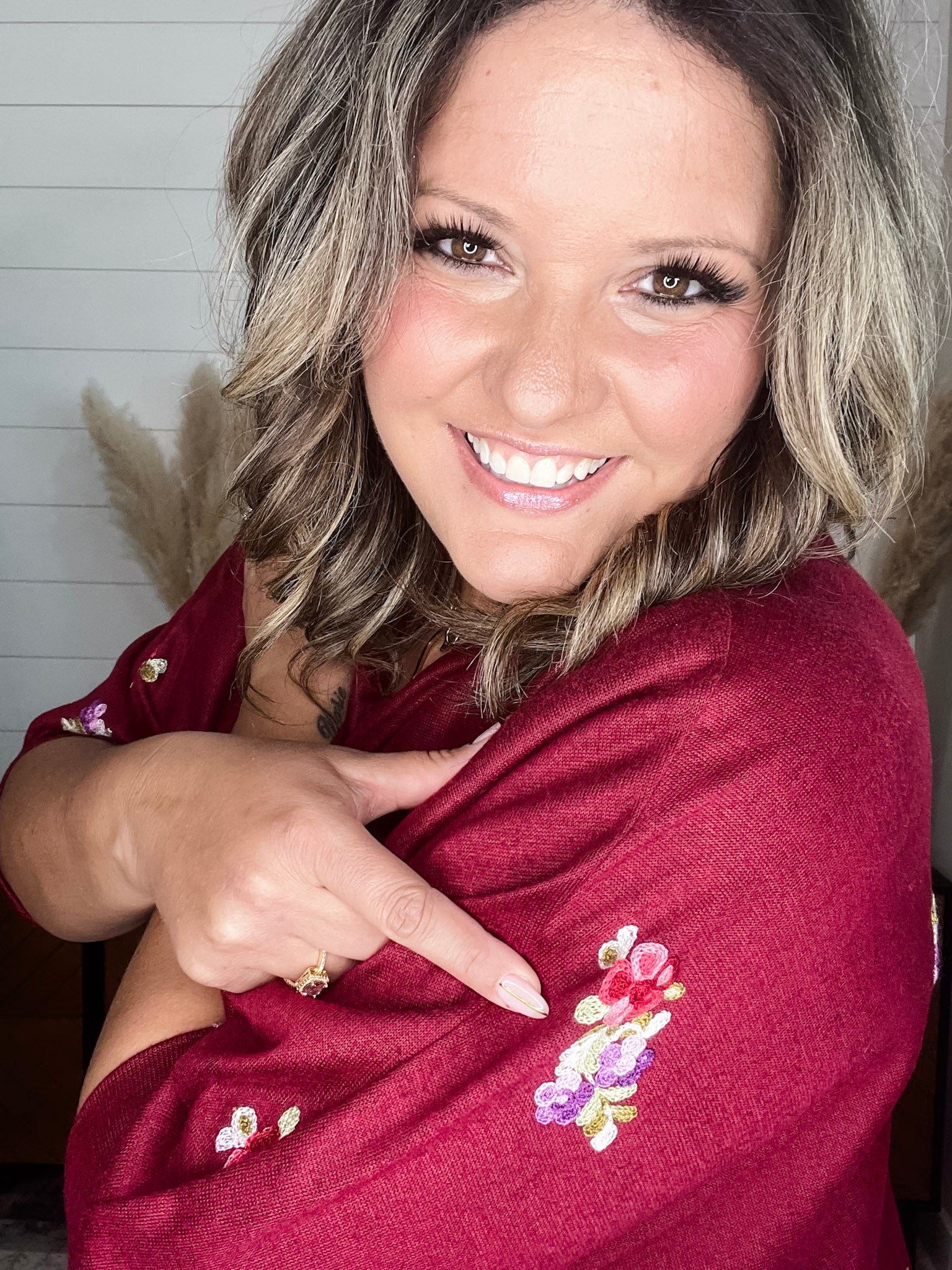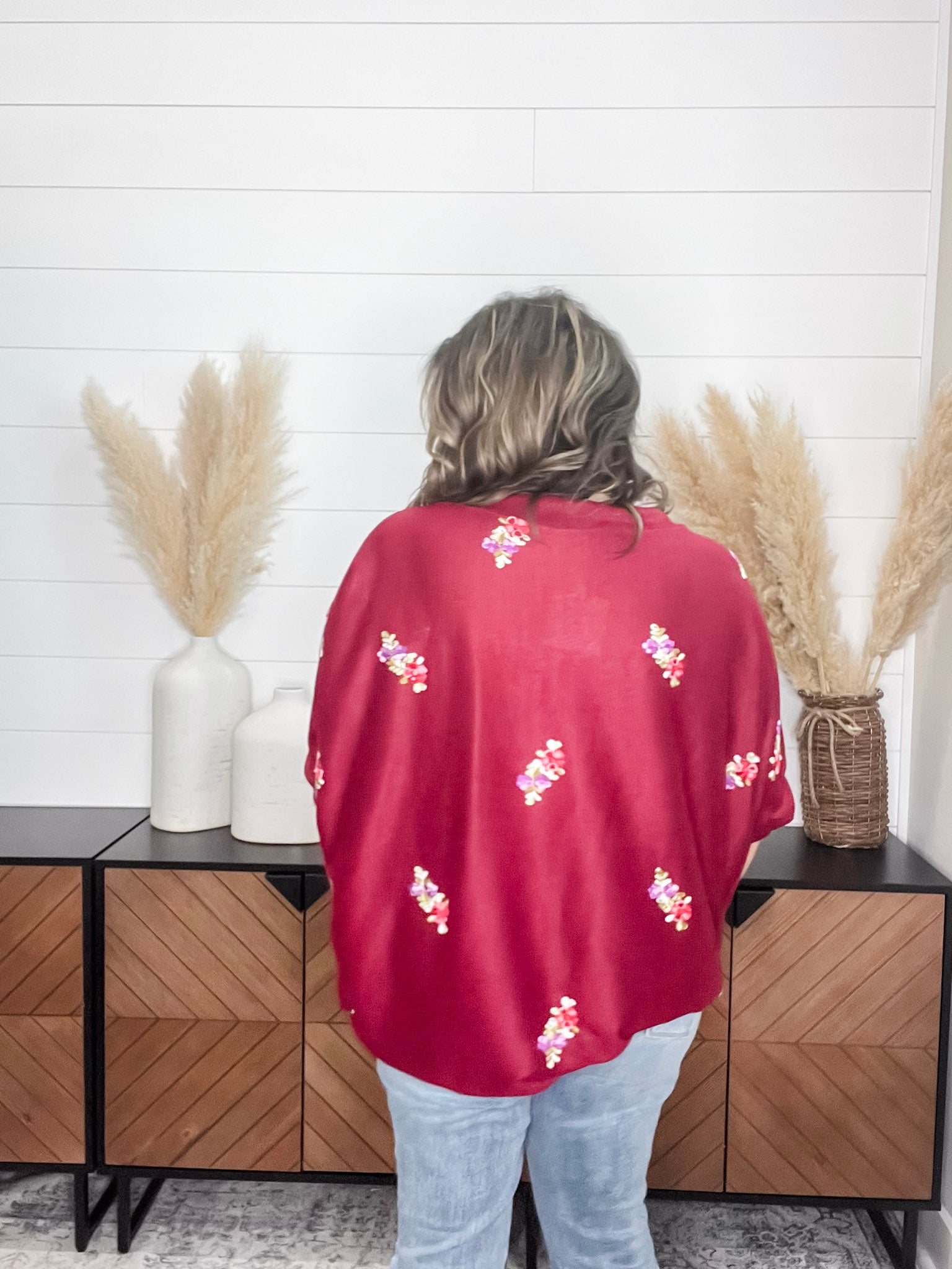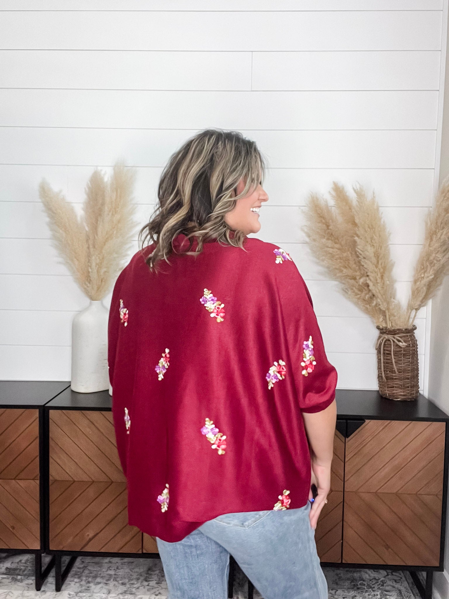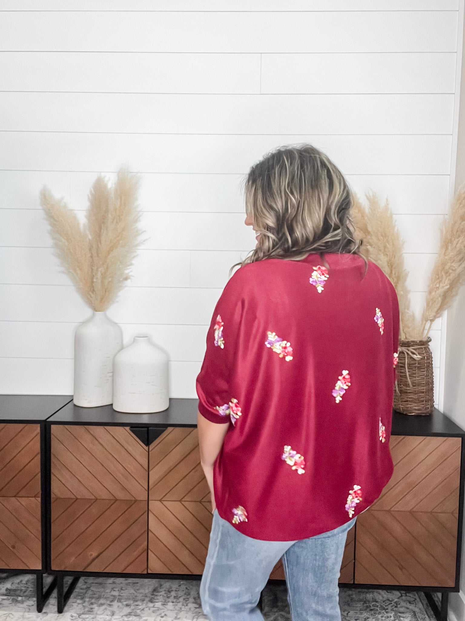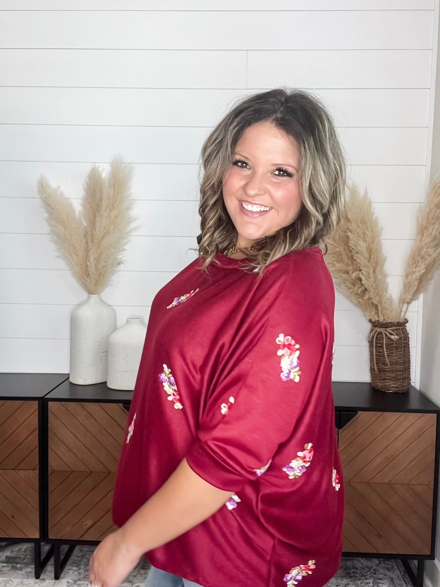 Embrace effortless charm with the "Deceptive" Floral Embroidered Short Sleeve Dolman in rich wine. Crafted from soft knit fabric, this playful top features delicate embroidered flowers and a roomy dolman fit that’s true to size. The cuff and collar add a touch of polished flair, making it perfect for days when comfort meets style.