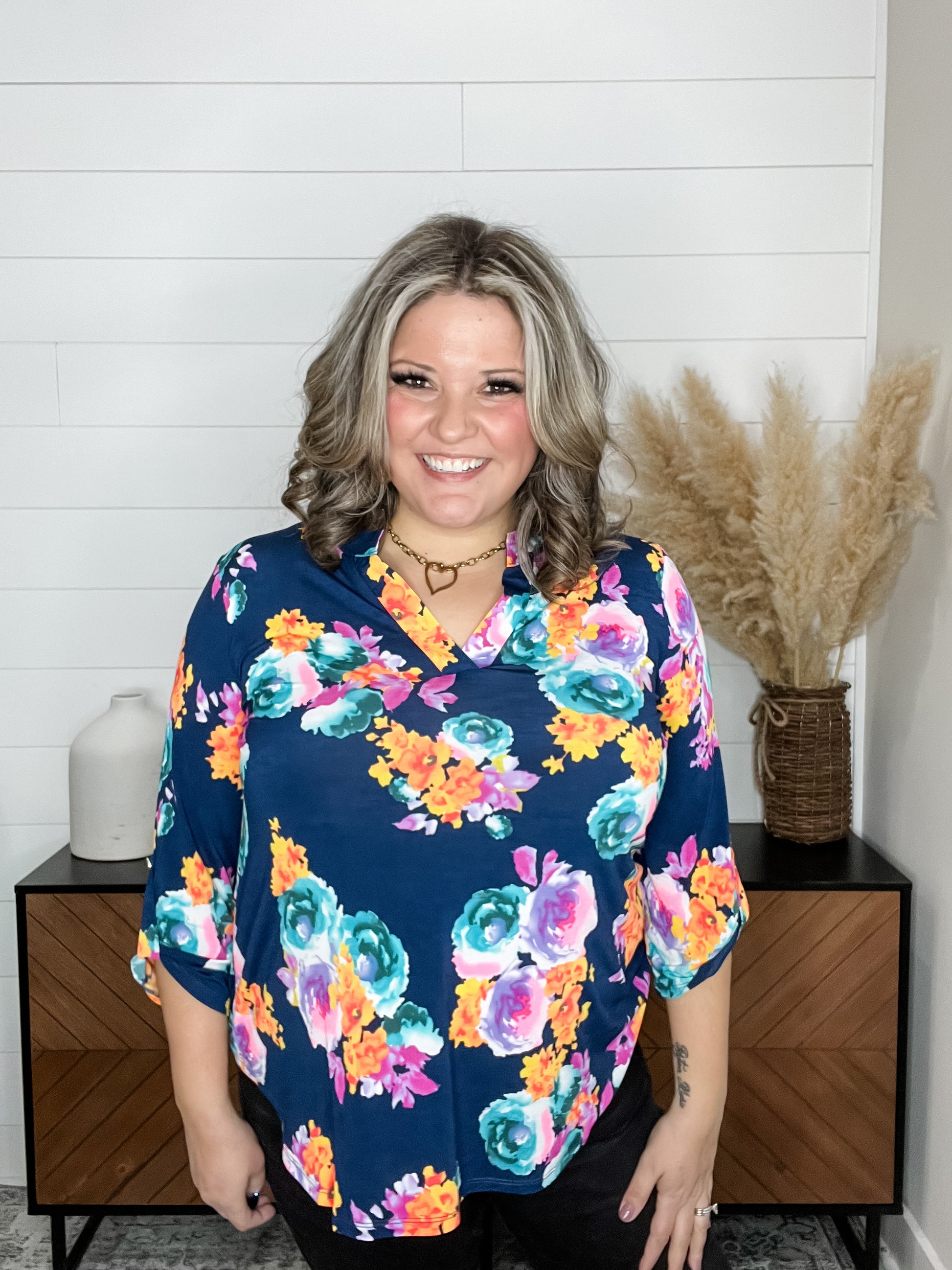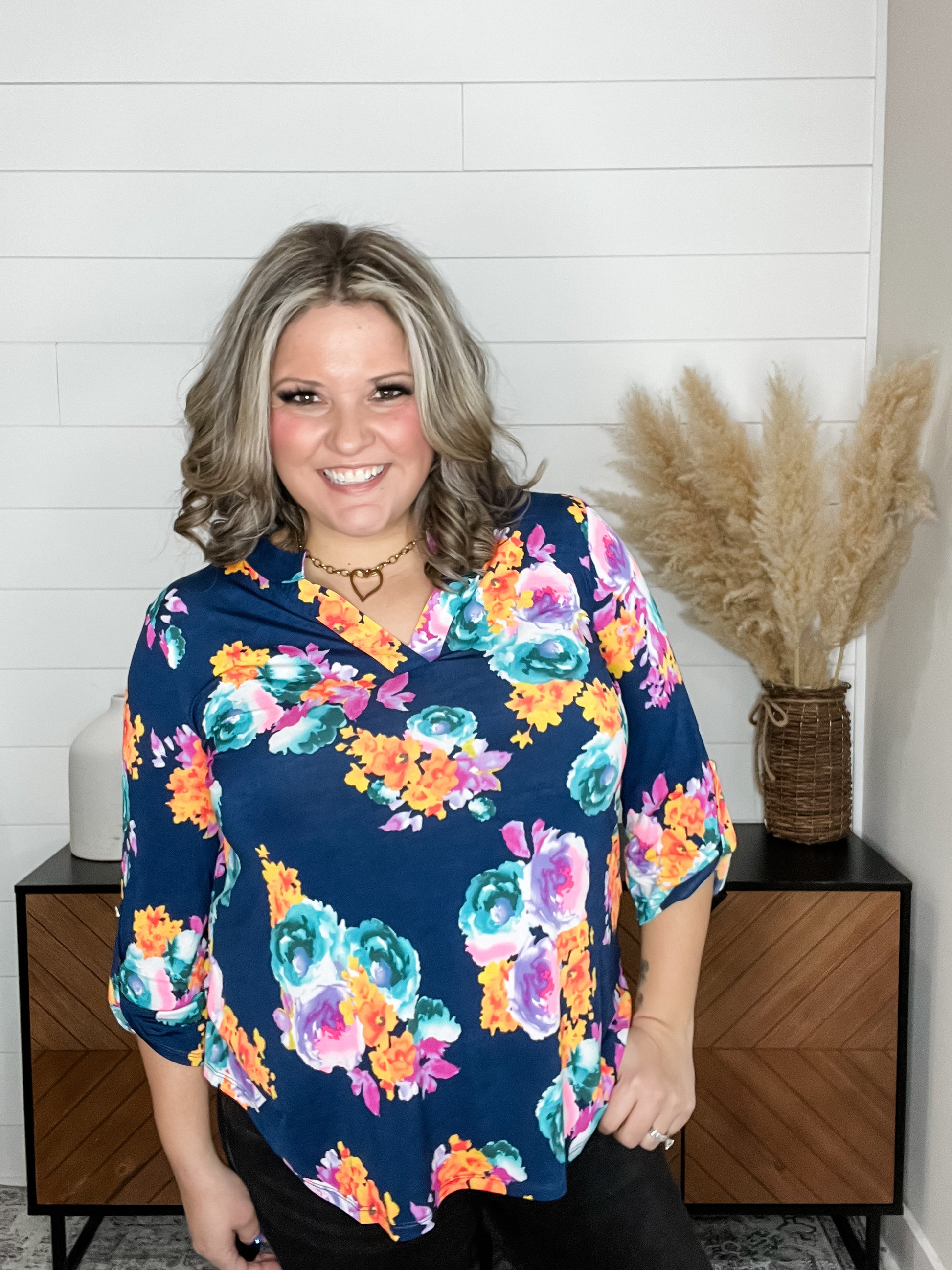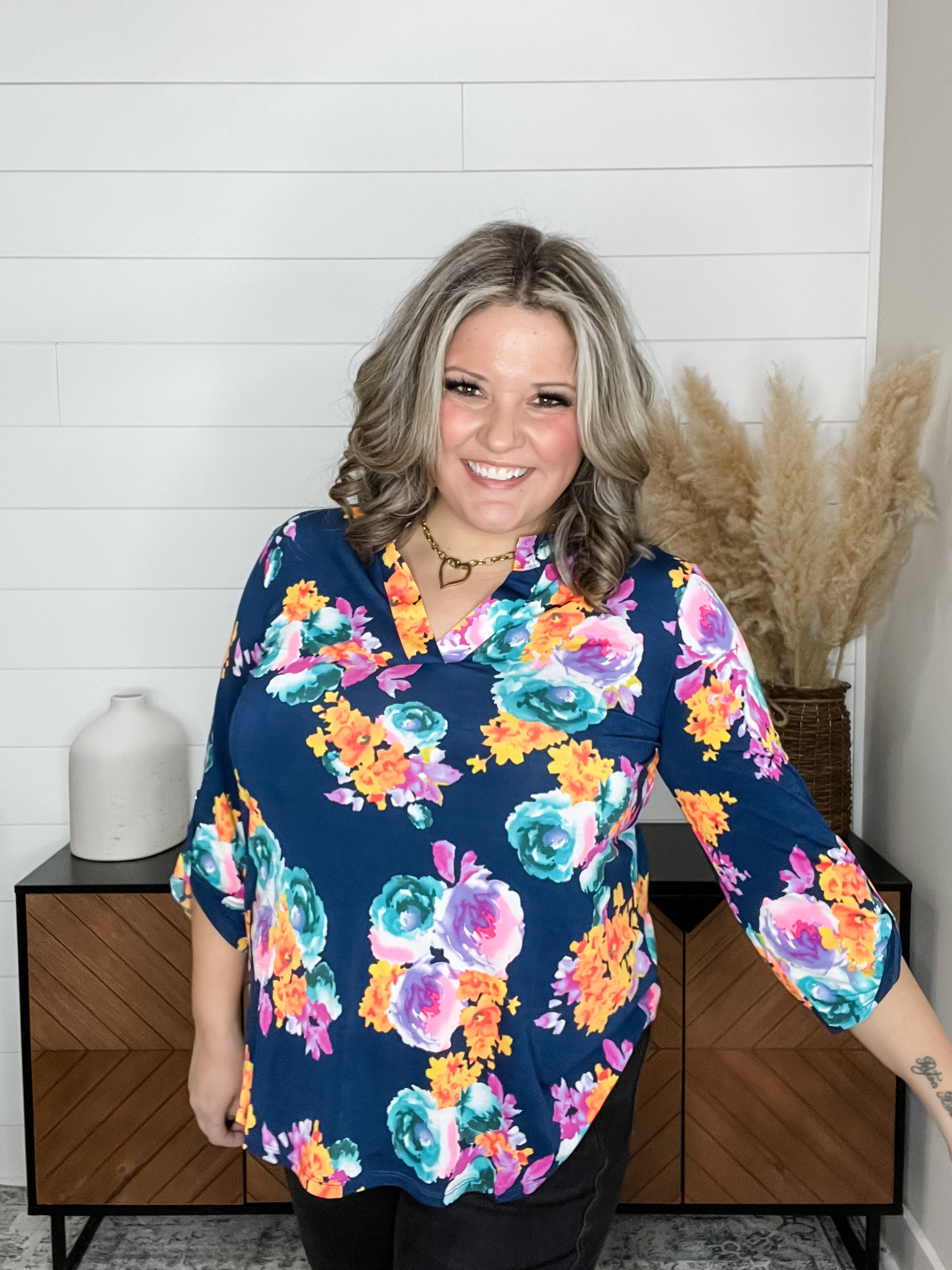 Step into vibrant style with the "Dion" Dear Scarlett 3/4 Sleeve Split Neck top. Featuring a bold, bright floral pattern and a slinky, stretchy fabric, this playful piece hugs your curves with ease. For the best fit, be sure to size down one. Perfect for adding a splash of fun and flair to your wardrobe!