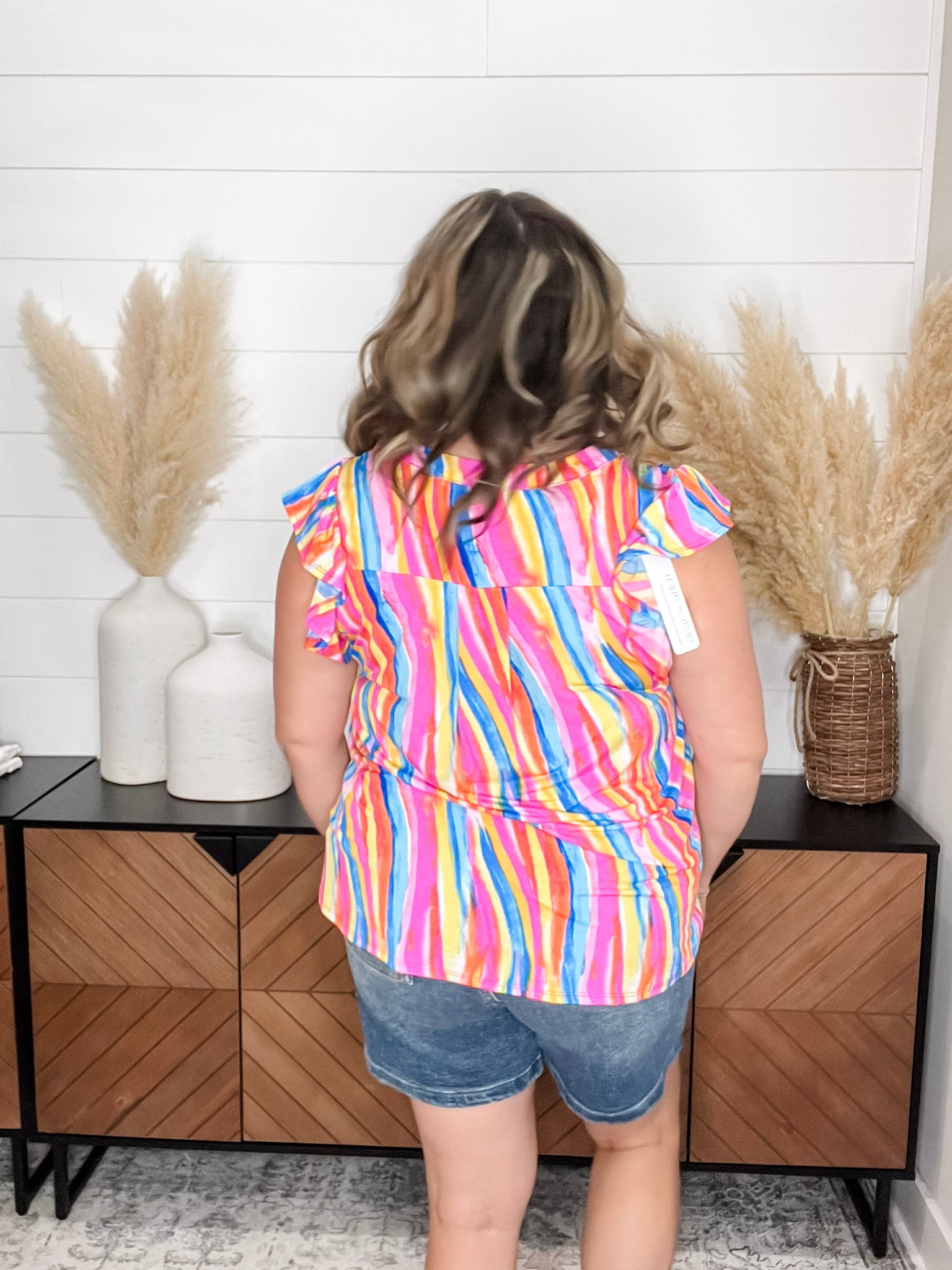Introducing "Discover" by Dear Scarlett. This vibrant rainbow zebra stripe pattern blouse boasts flutter sleeves for a touch of elegance. Its slinky, stretchy fabric provides a wrinkle-free finish, making it perfect for all-day wear. Plus, its true-to-size fit ensures a comfortable and flattering silhouette.