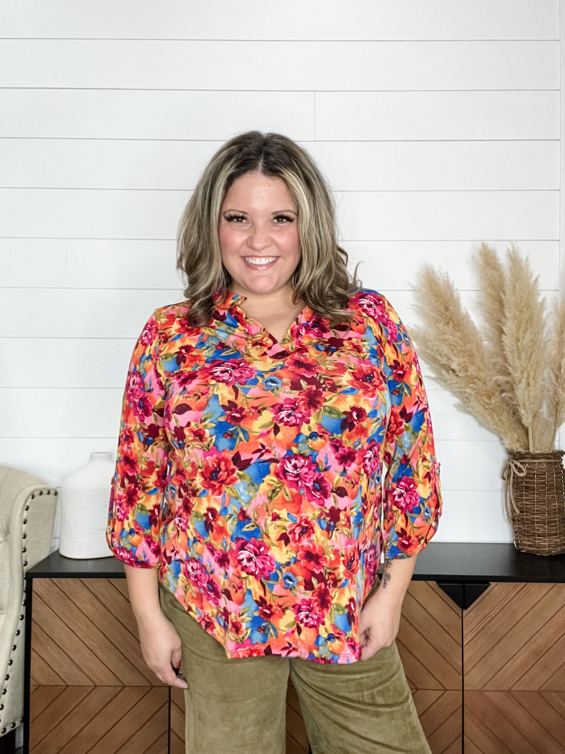 Embrace effortless comfort with the "Fox" 3/4 Sleeve Split Neck top. Crafted from slinky stretchy fabric, it hugs your curves in all the right places—just remember to size down one for the perfect fit. The jewel-toned floral print adds a vibrant, playful pop to your wardrobe, making it ideal for both casual days and lively nights out.