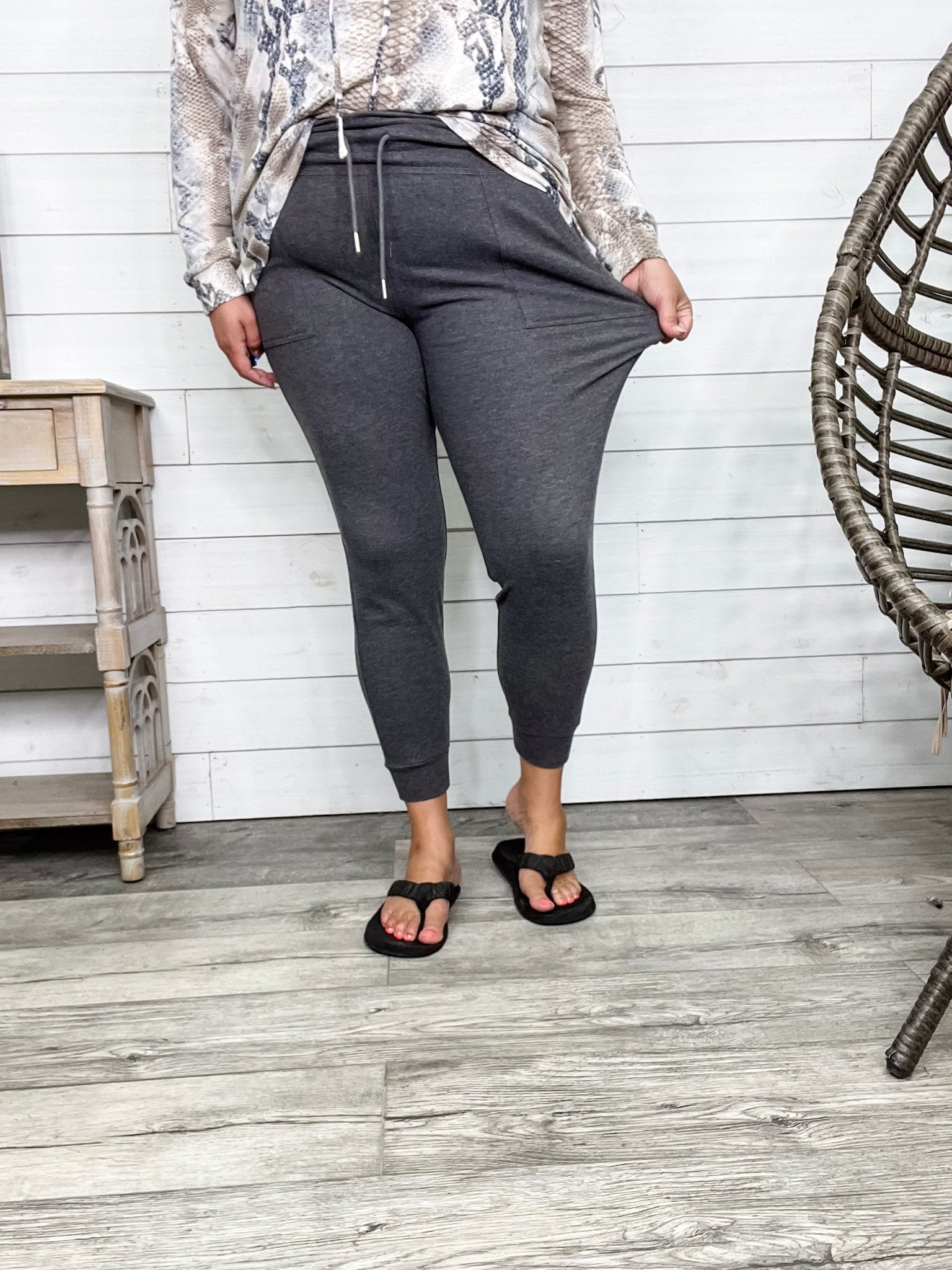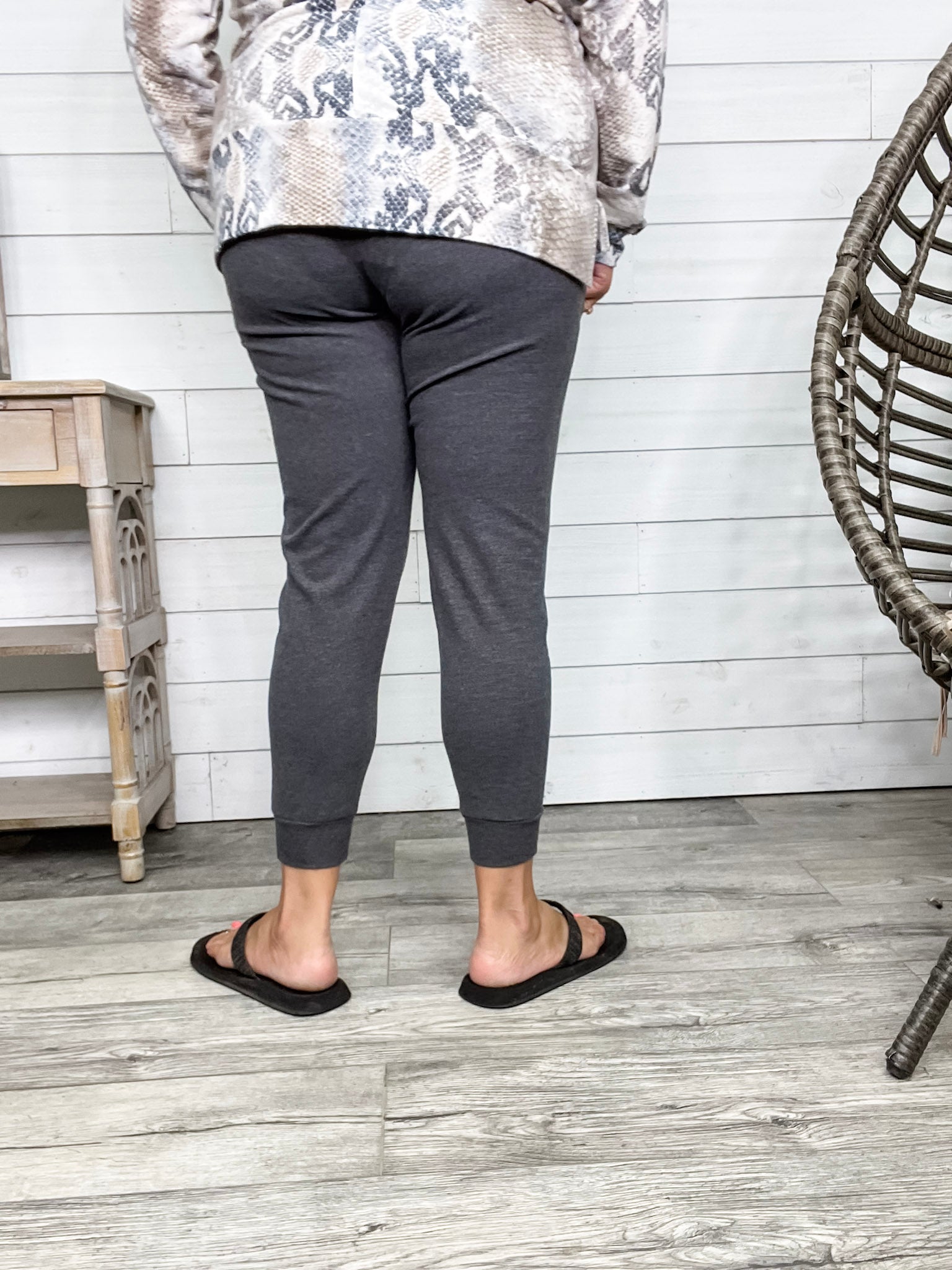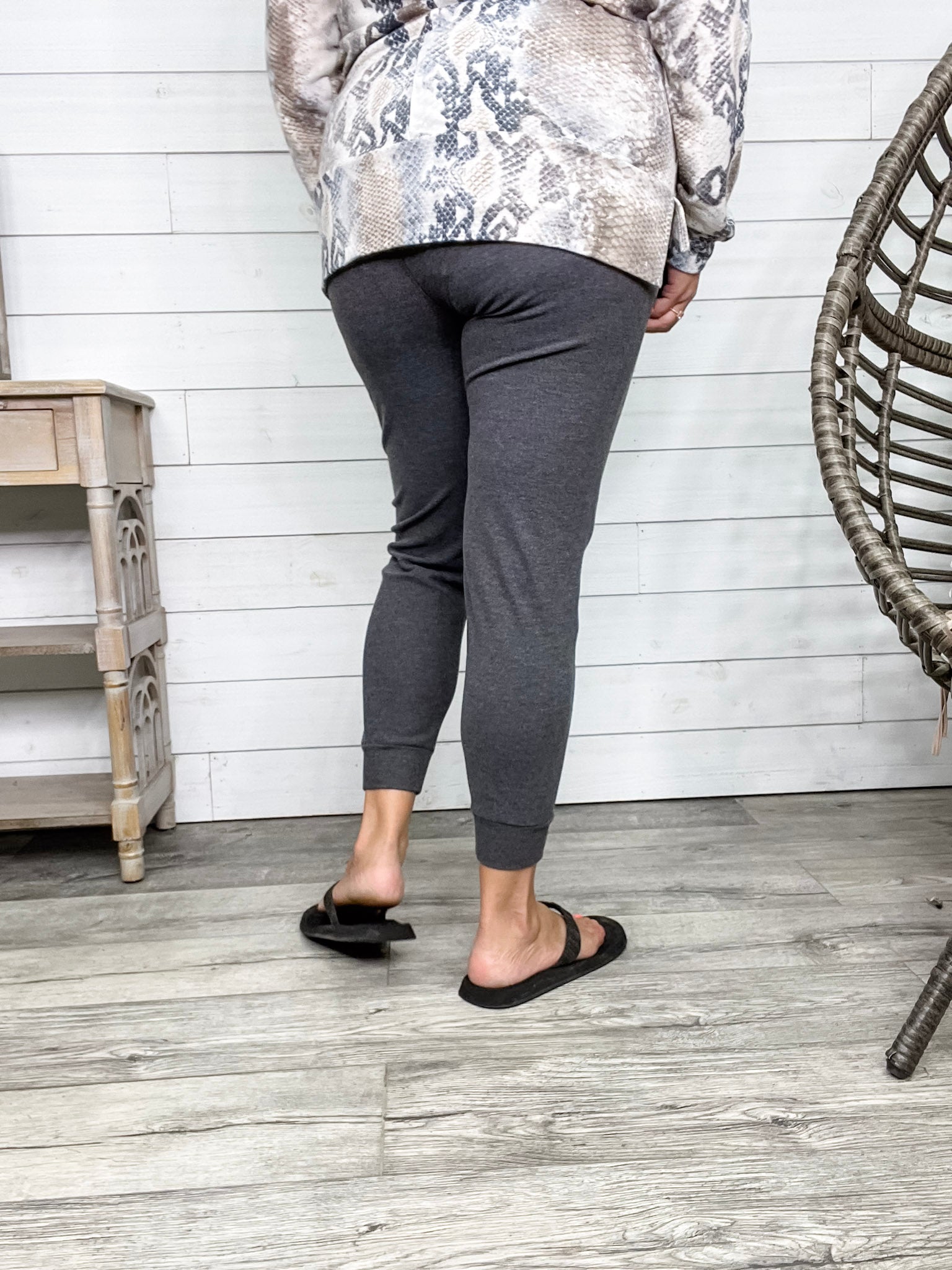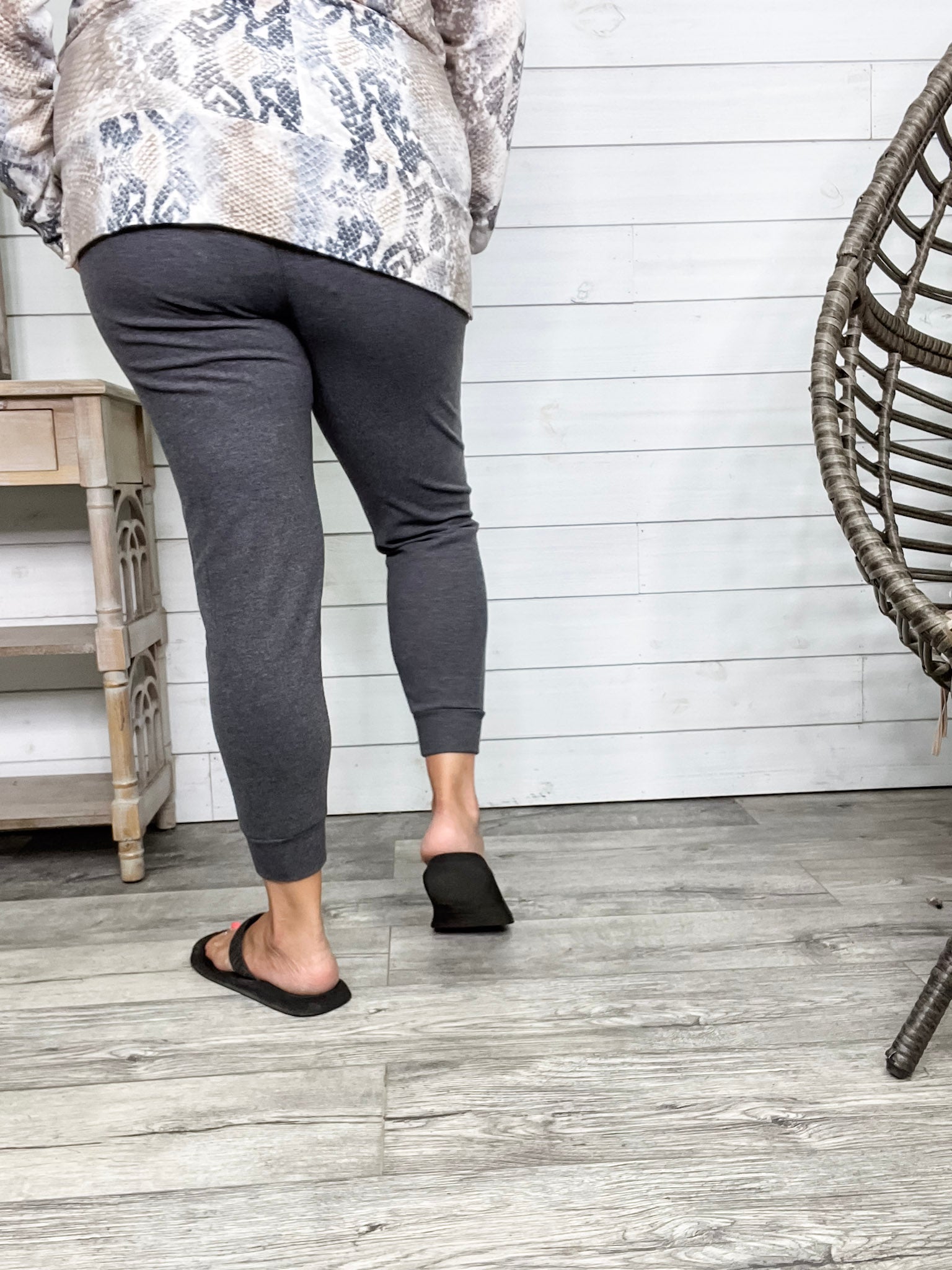 These "Gold Medal" High-Waisted Jogger Leggings in Charcoal are your new go-to for cozy style! Thick and super soft, they fit true to size with a snug, flattering cut—no oversized bagginess here. Want a little extra wiggle room? Just size up one. Heads up, if you have slimmer legs like an apple shape, these might not be your perfect match. Ready to lounge or run errands in comfort and style? These joggers have got you covered!