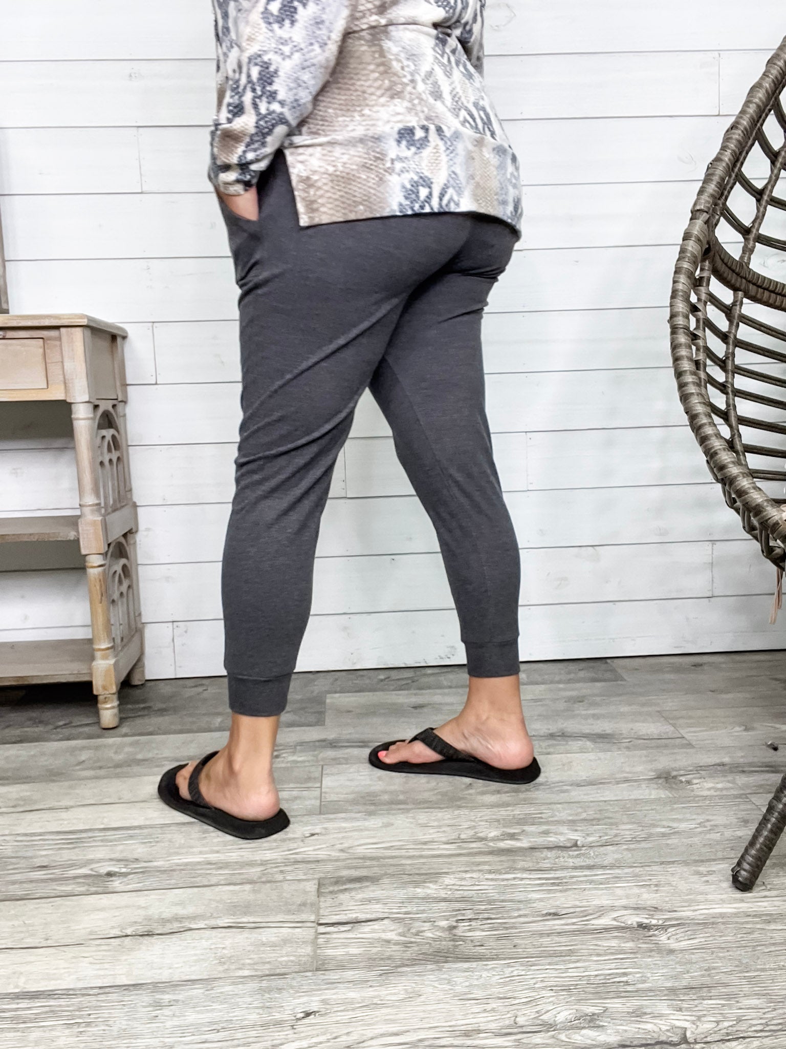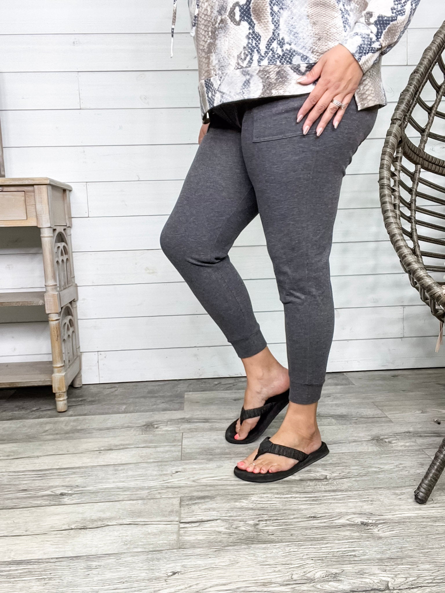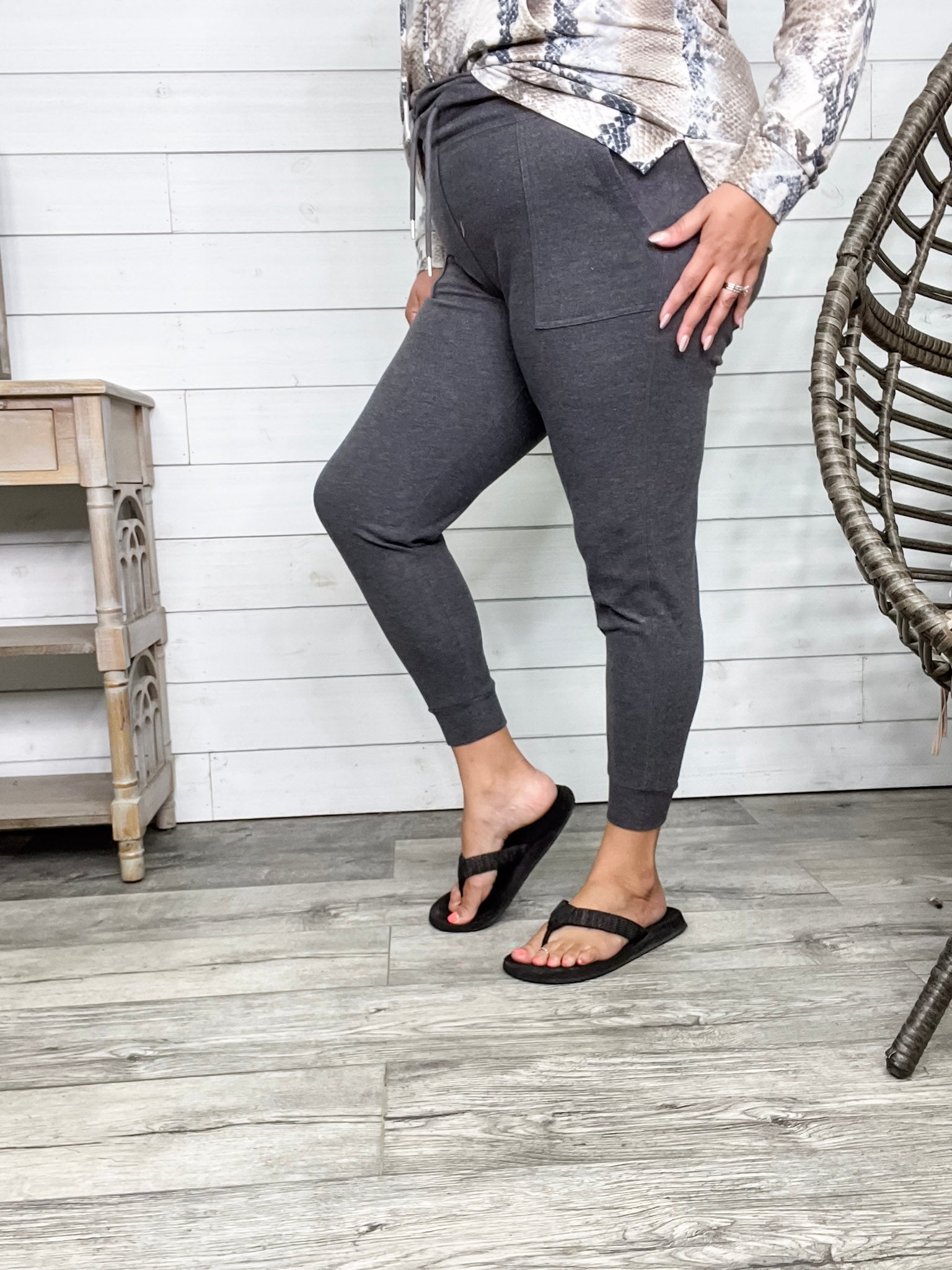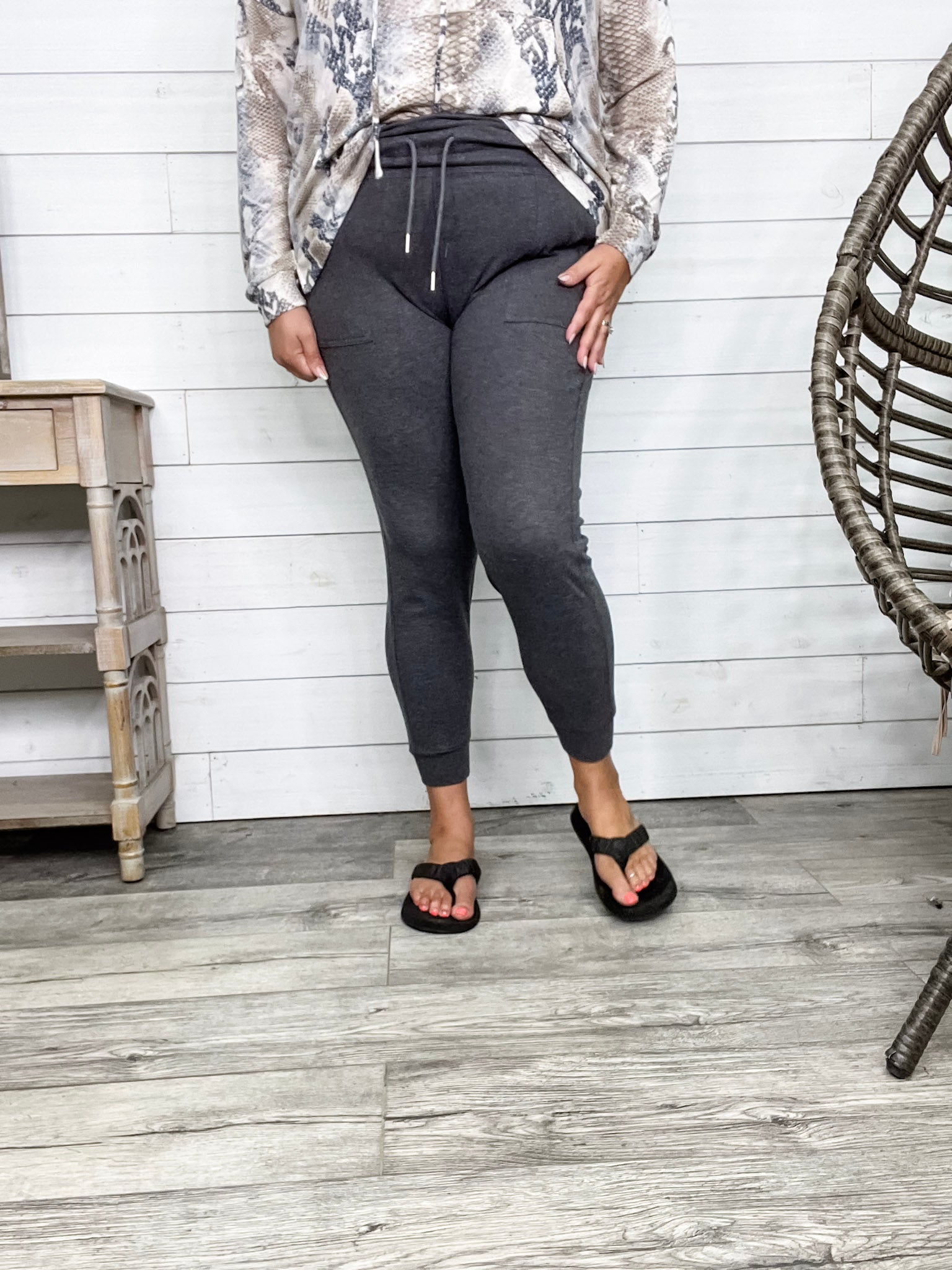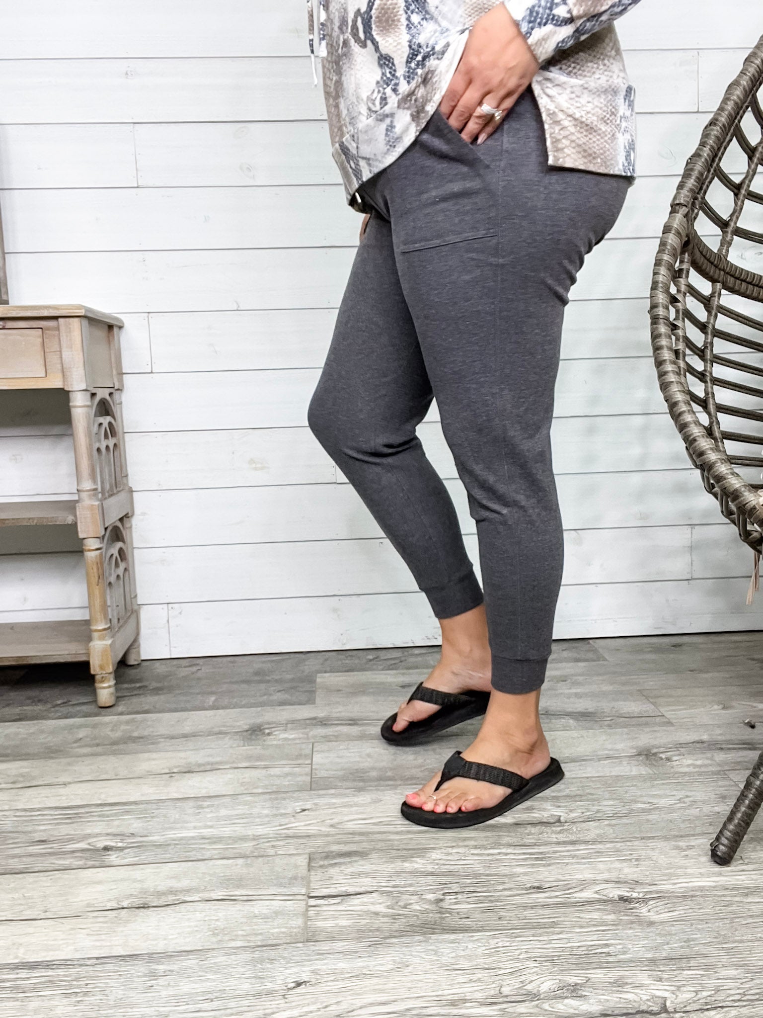 These "Gold Medal" High-Waisted Jogger Leggings in Charcoal are your new go-to for cozy style! Thick and super soft, they fit true to size with a snug, flattering cut—no oversized bagginess here. Want a little extra wiggle room? Just size up one. Heads up, if you have slimmer legs like an apple shape, these might not be your perfect match. Ready to lounge or run errands in comfort and style? These joggers have got you covered!