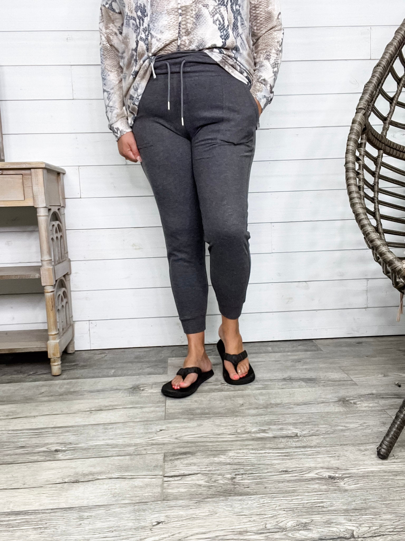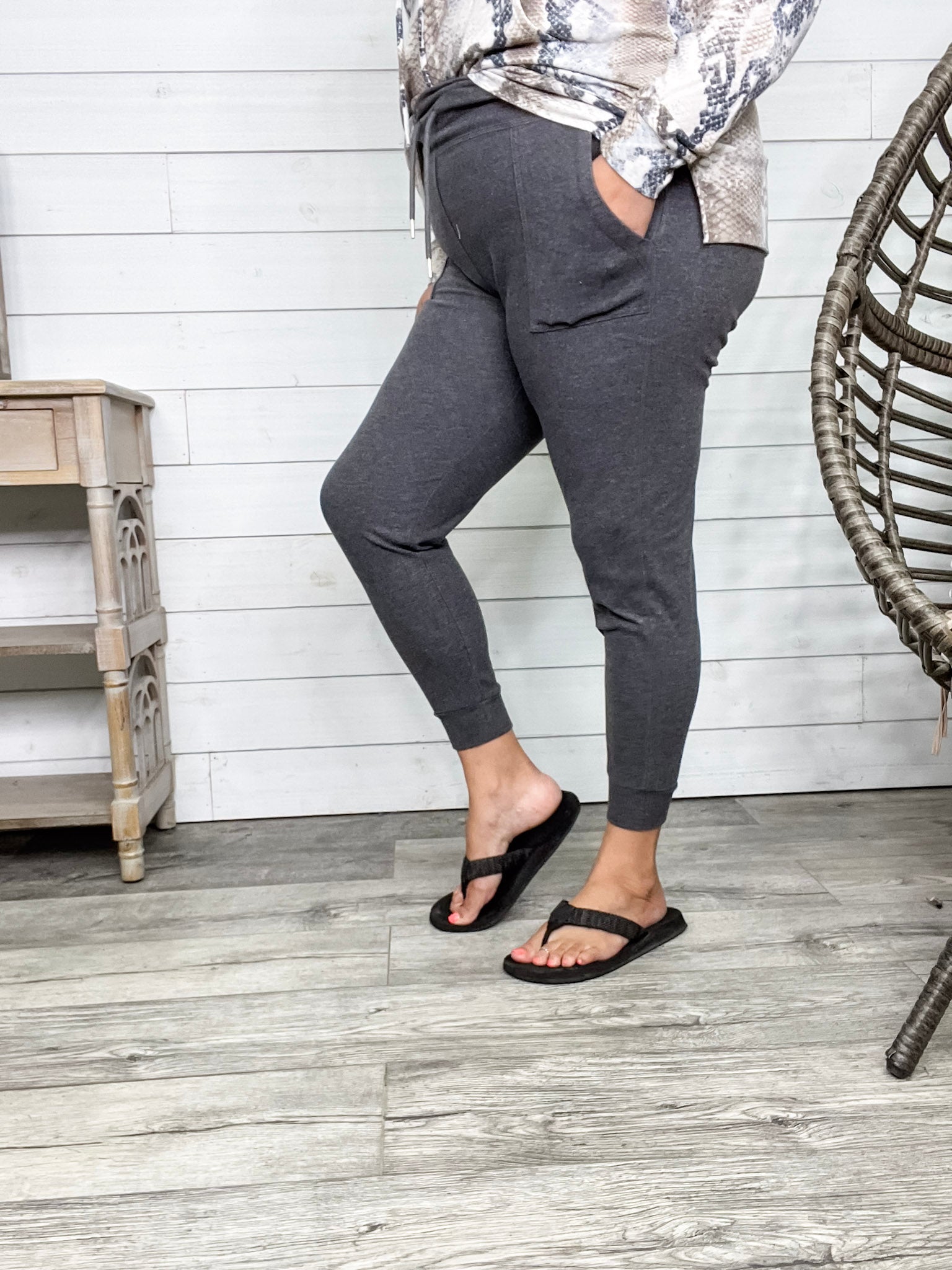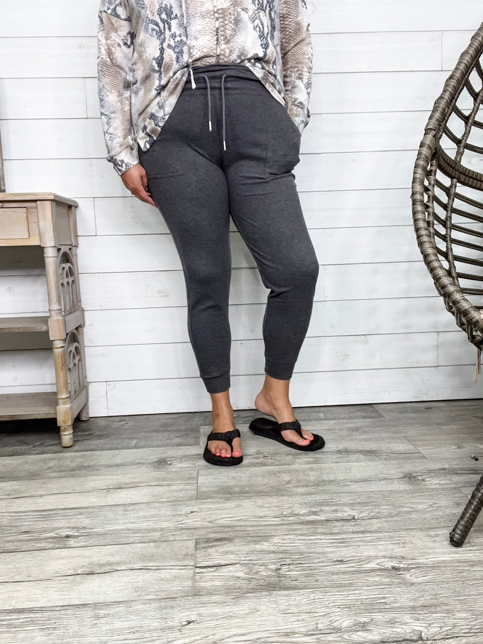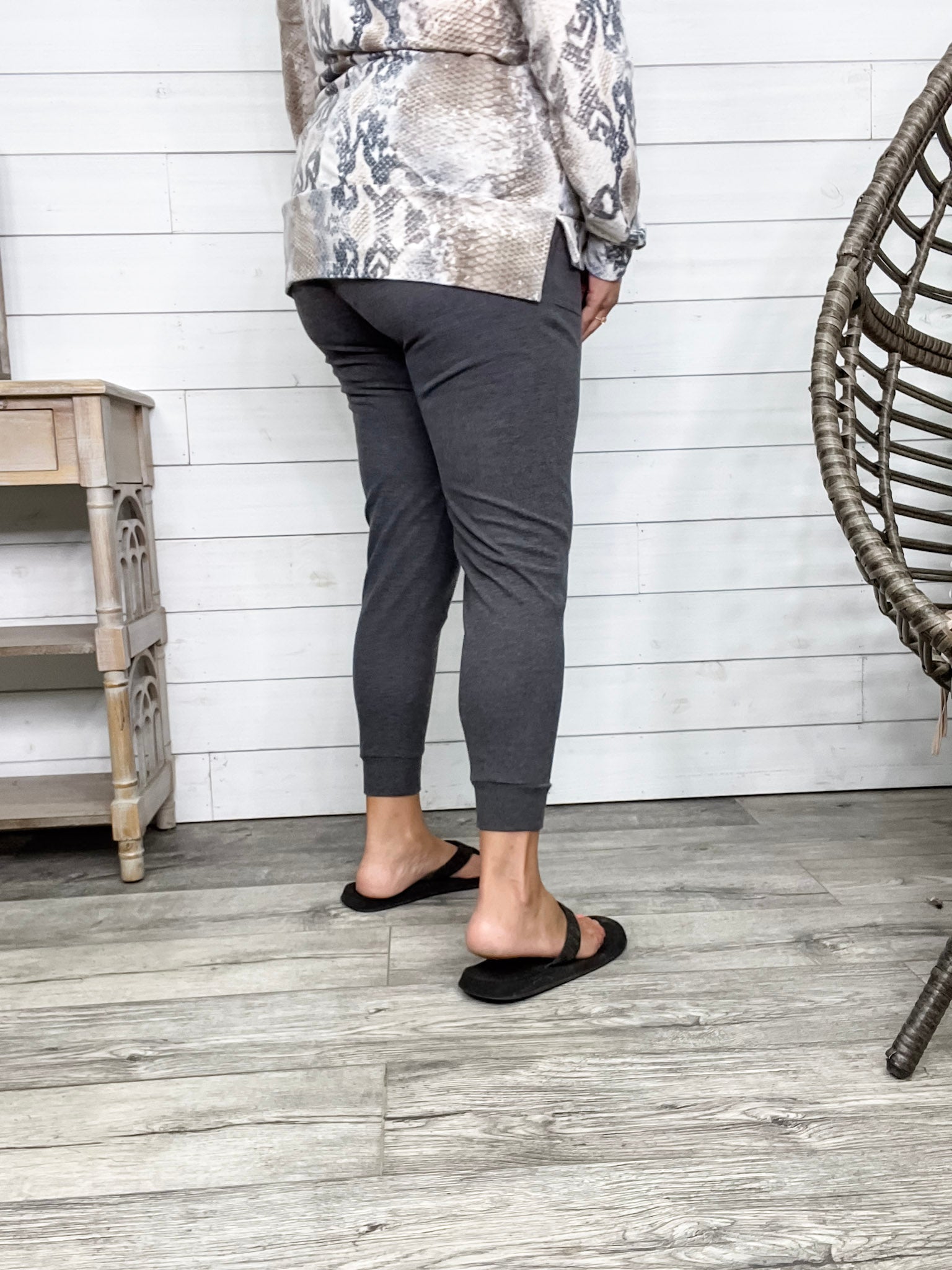 These "Gold Medal" High-Waisted Jogger Leggings in Charcoal are your new go-to for cozy style! Thick and super soft, they fit true to size with a snug, flattering cut—no oversized bagginess here. Want a little extra wiggle room? Just size up one. Heads up, if you have slimmer legs like an apple shape, these might not be your perfect match. Ready to lounge or run errands in comfort and style? These joggers have got you covered!