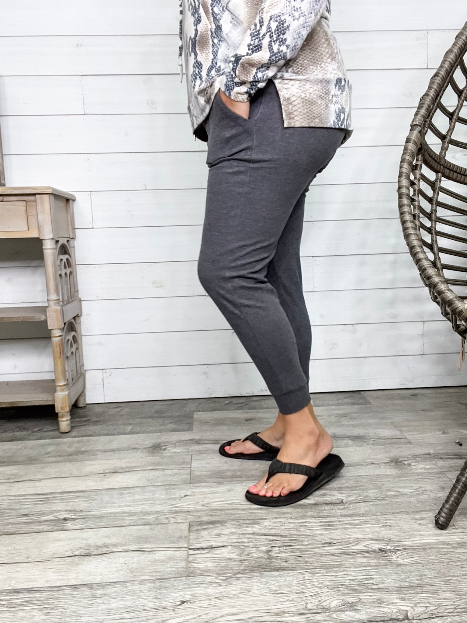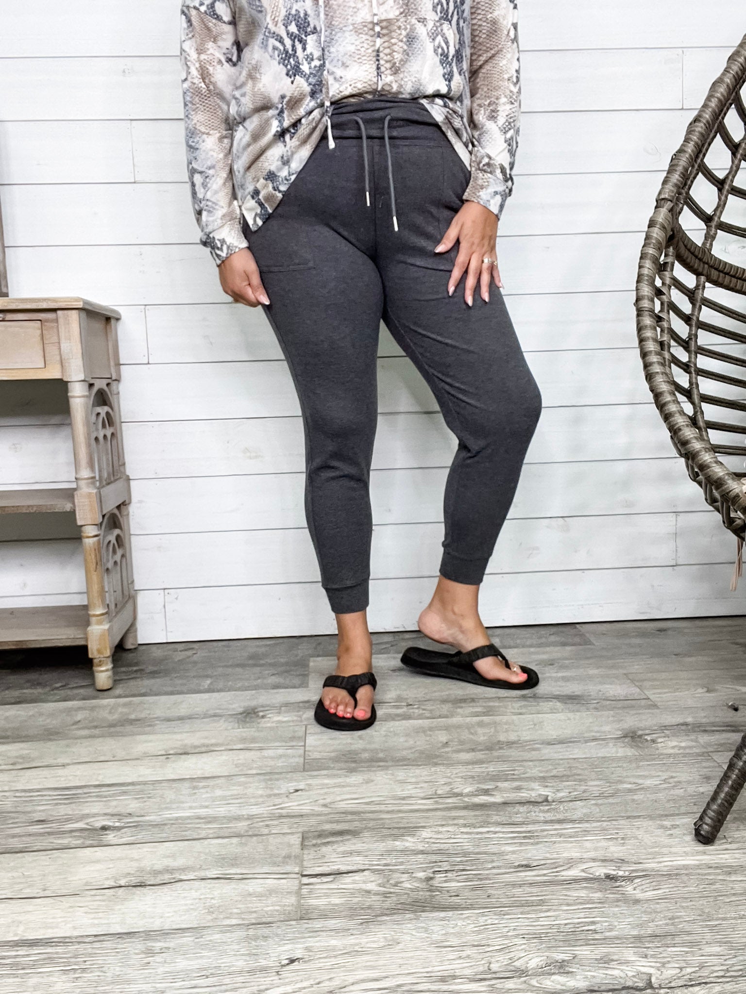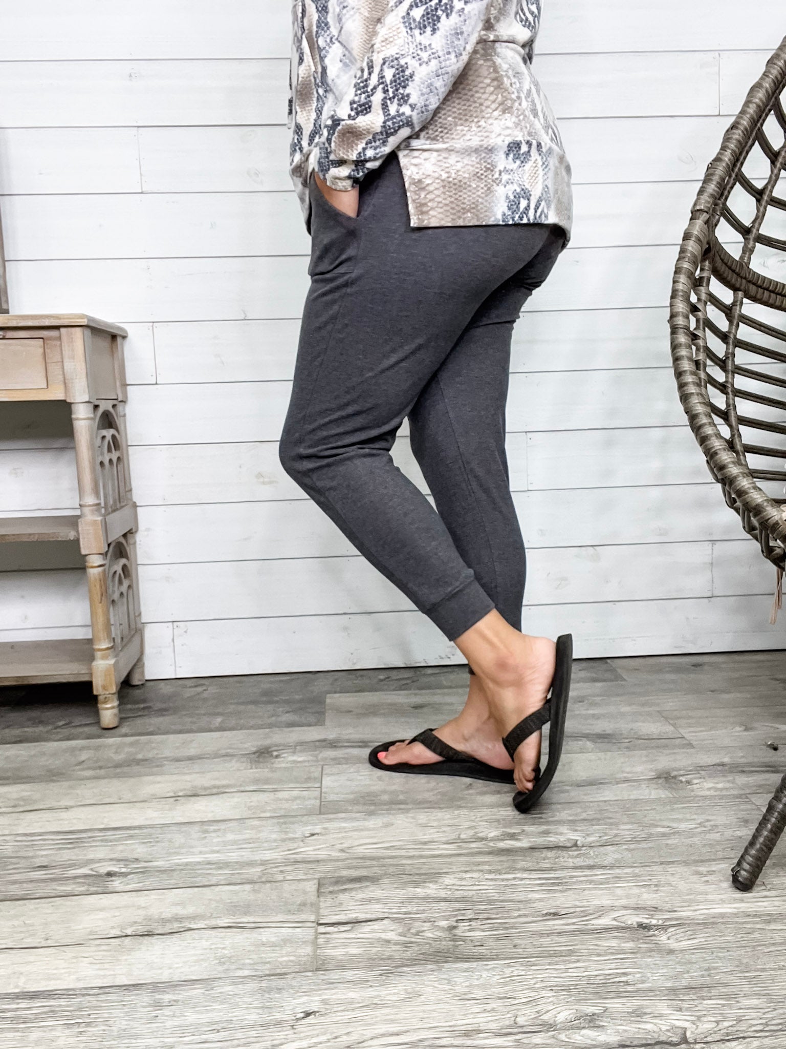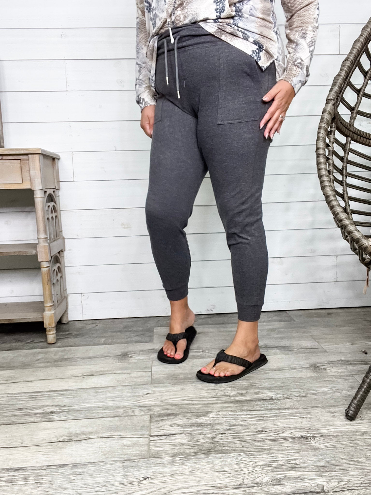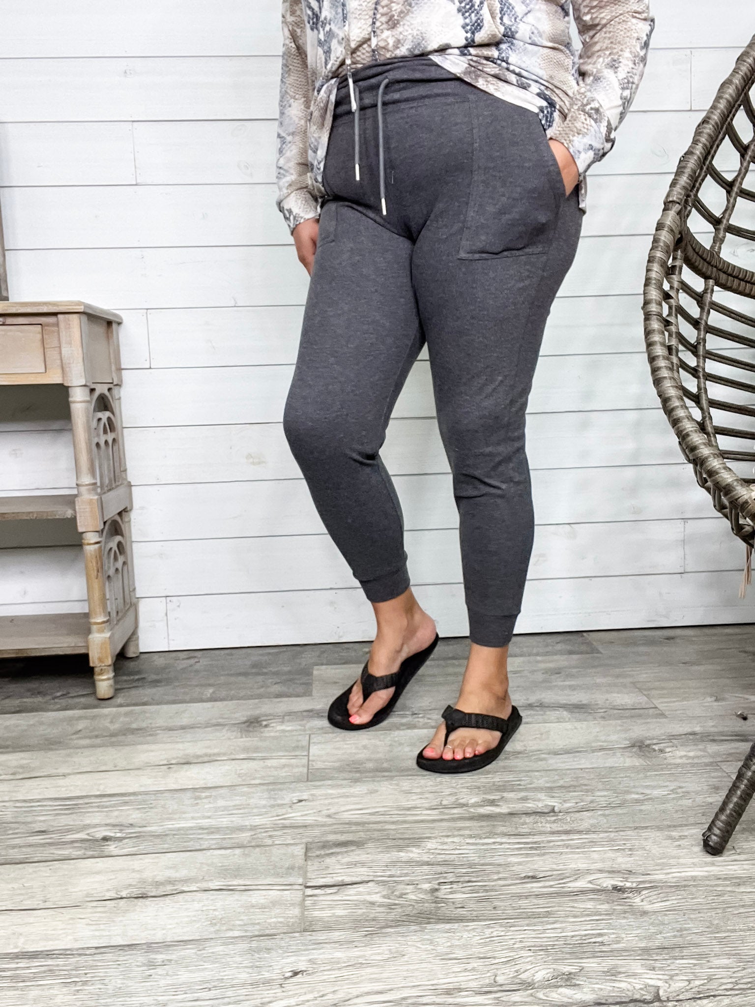 These "Gold Medal" High-Waisted Jogger Leggings in Charcoal are your new go-to for cozy style! Thick and super soft, they fit true to size with a snug, flattering cut—no oversized bagginess here. Want a little extra wiggle room? Just size up one. Heads up, if you have slimmer legs like an apple shape, these might not be your perfect match. Ready to lounge or run errands in comfort and style? These joggers have got you covered!