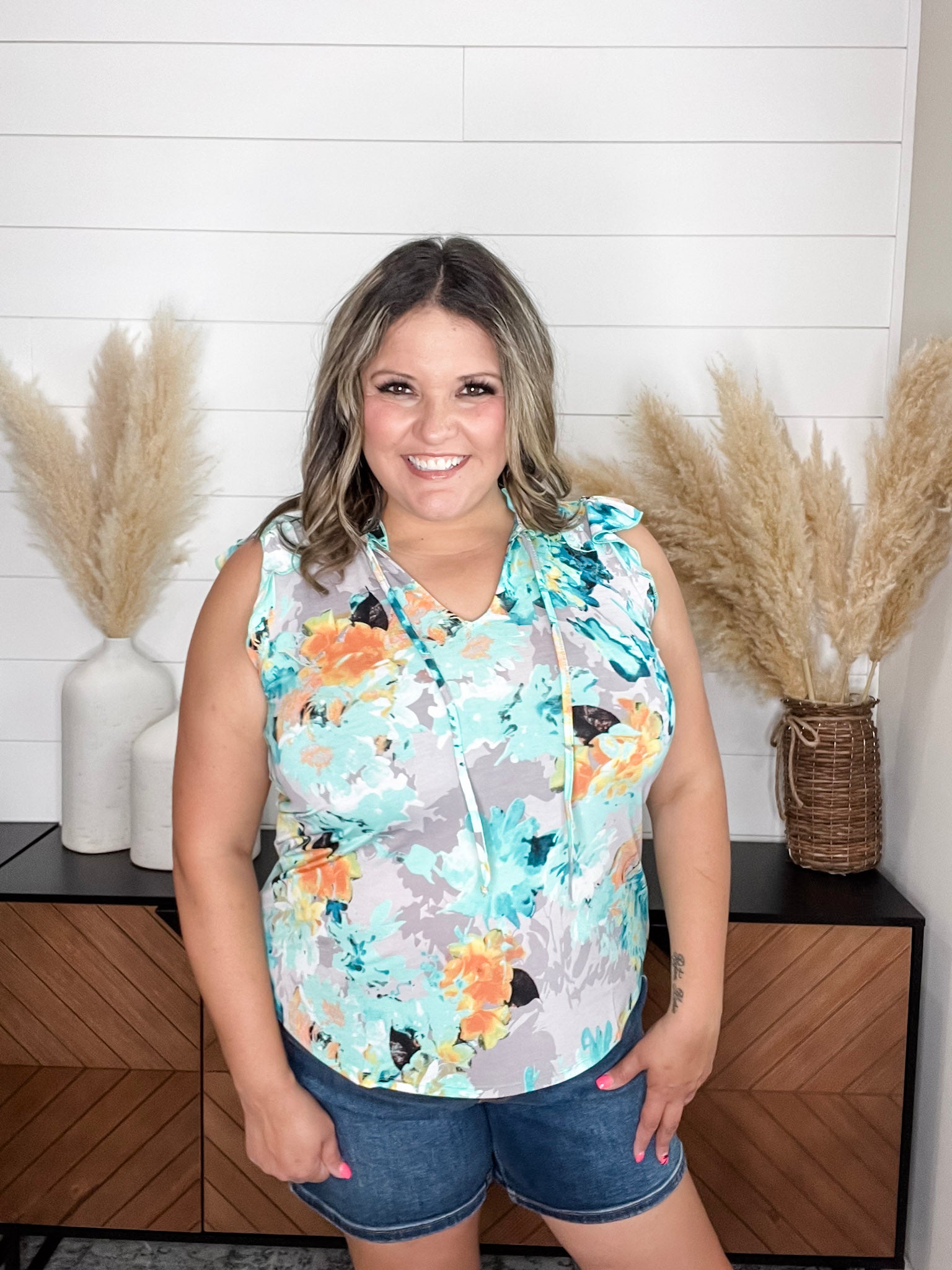 Add a touch of romance with the "Halston" Ruffle Collar Flutter Sleeve. The ruffle cap sleeves and front tie provide a feminine touch while the floral design adds a delicate charm. Made with a slinky and stretchy material, the U neckline creates a flattering silhouette.