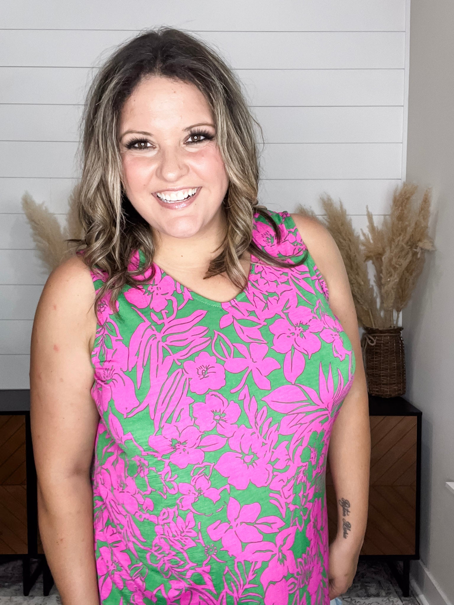 The "Harvard" U Neck Tank Top features a flattering U neck design and is crafted from a slinky, stretchy fabric. With a lovely pink background and floral pattern, this top is perfect for showcasing your style. Its design is especially flattering for larger busts - just remember to size down one for a fitted look.