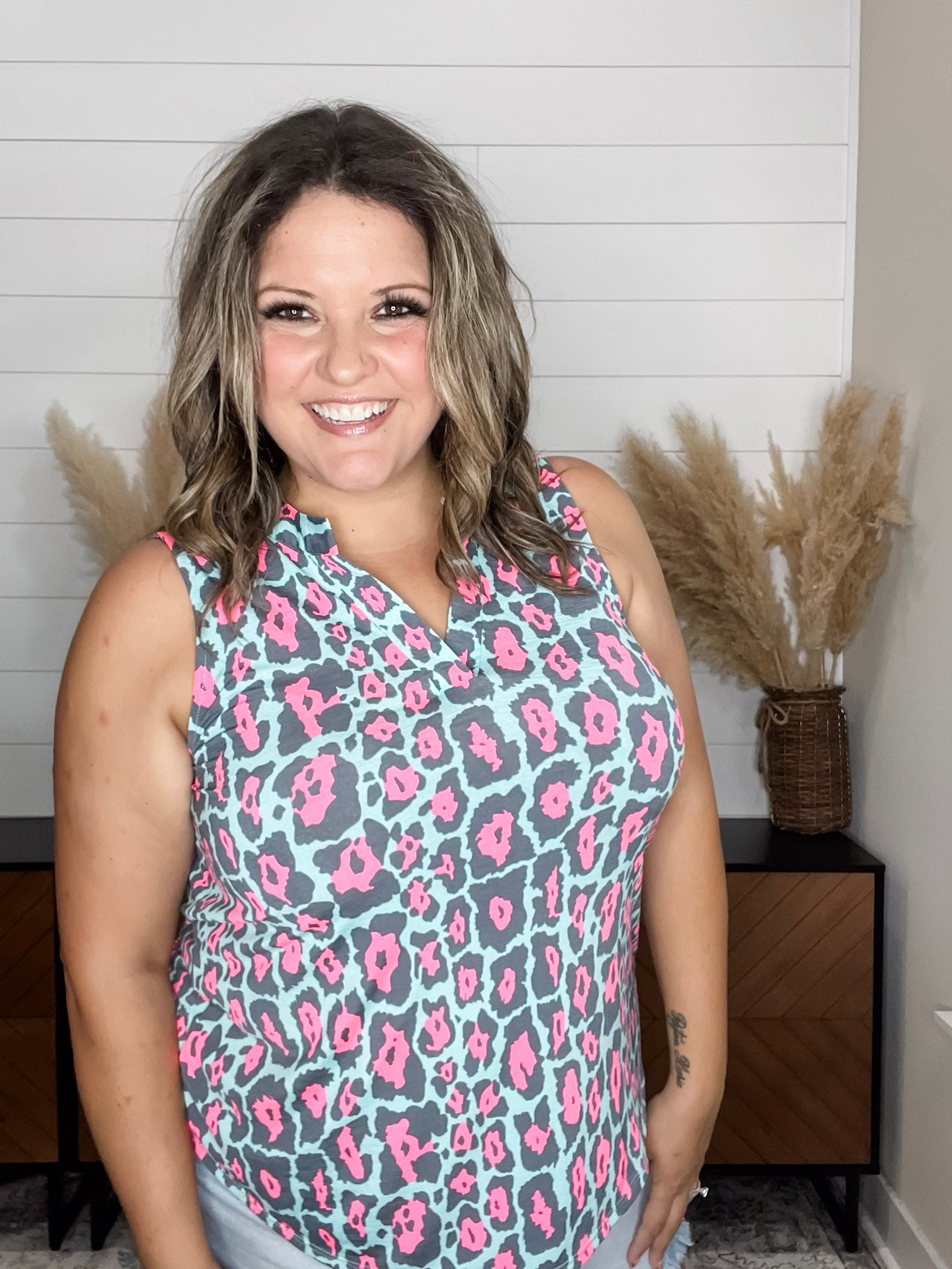 The "Haven" Sleeveless Lizzy is a must-have for your wardrobe. This versatile piece is true to size and features a slinky, stretchy fabric that guarantees a perfect fit. The soft mint base adds a touch of color while the stylish animal print adds a bold statement. Don't miss out on this trendy and comfortable addition to your closet.