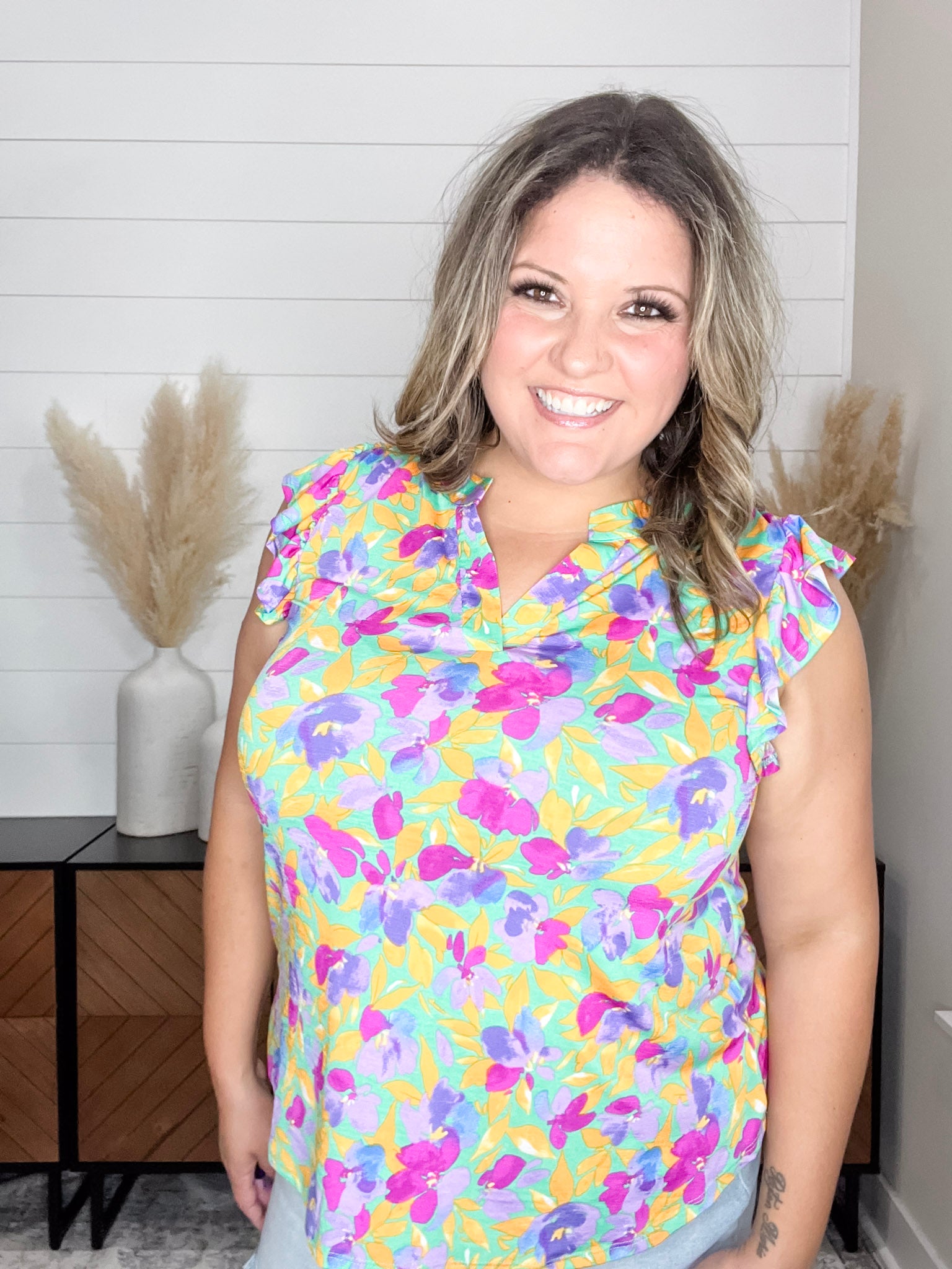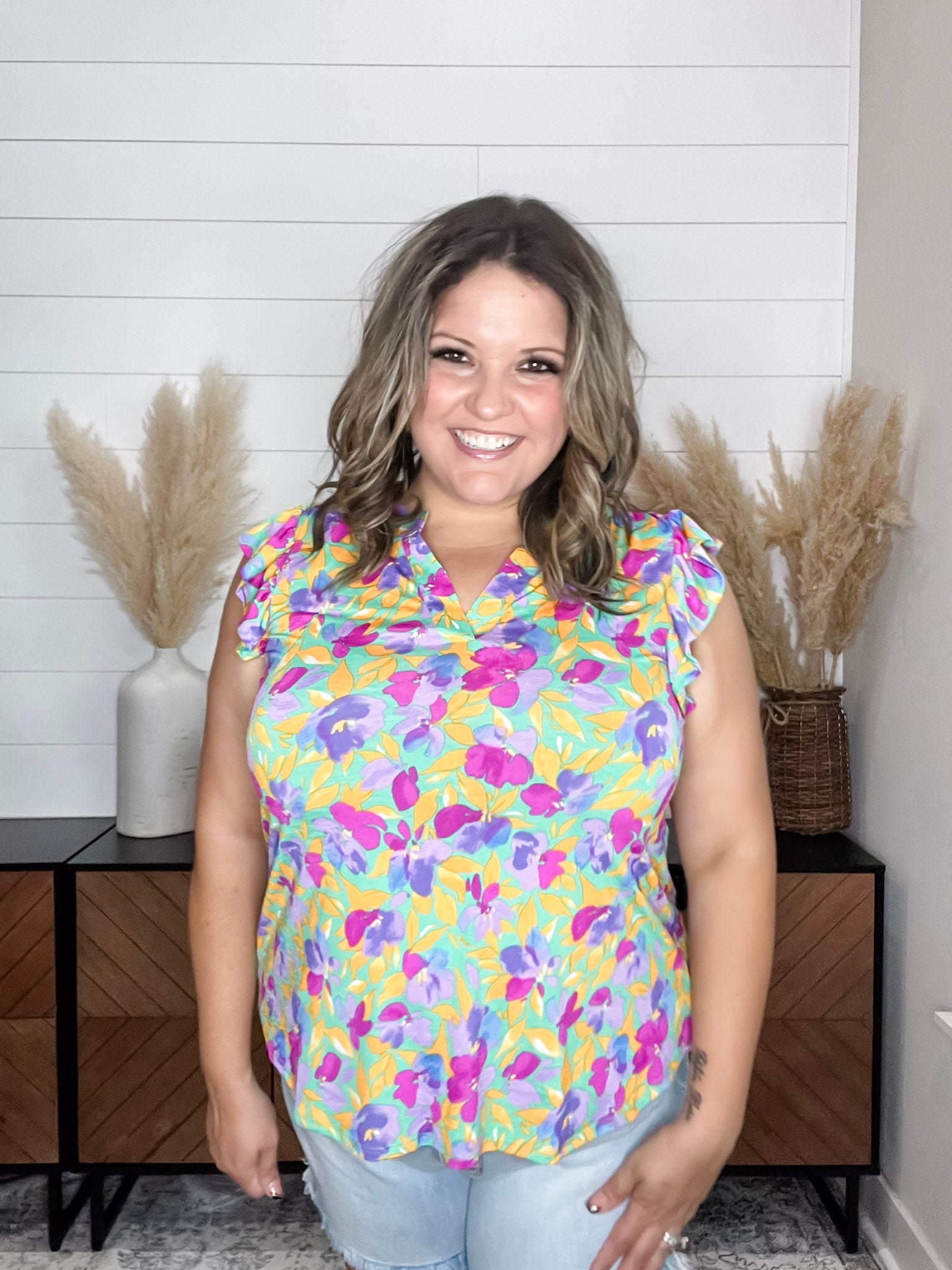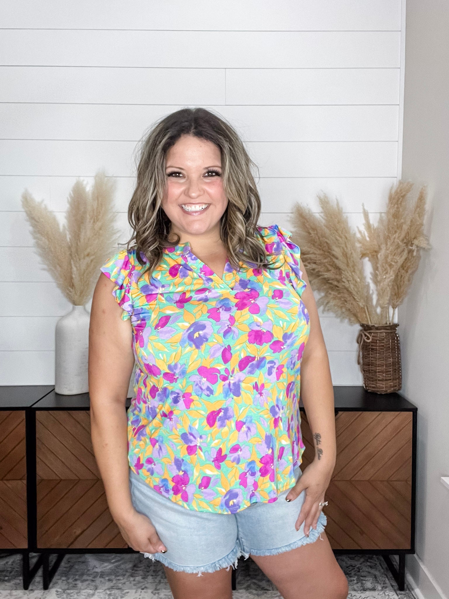 The "Henley" Ruffle Cap Sleeve Lizzy is the perfect addition to any wardrobe. Made with slinky, stretchy fabric, this top is comfortable and fits like a dream. The ruffle cap sleeves add a touch of feminine charm while the floral print on a yellow base adds a pop of color. For the best fit, size down one size.