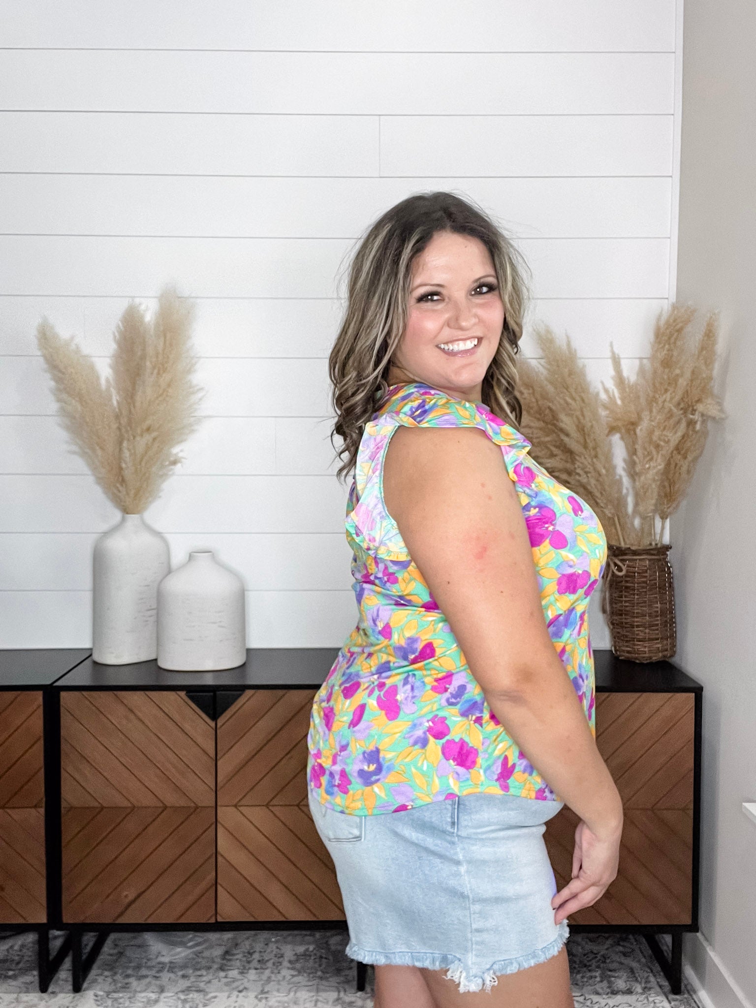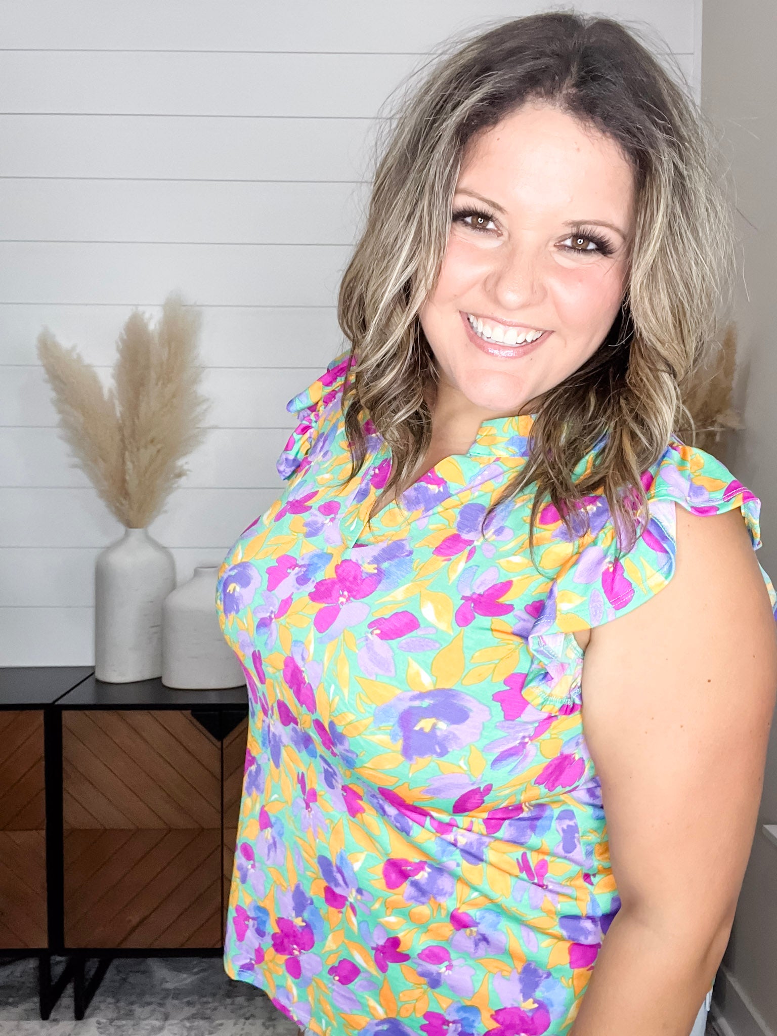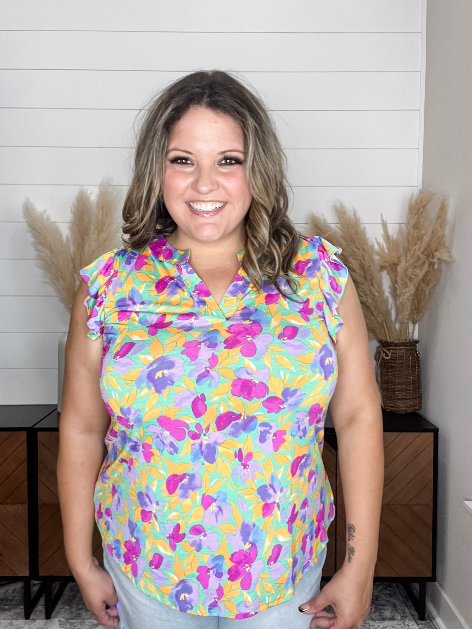 The "Henley" Ruffle Cap Sleeve Lizzy is the perfect addition to any wardrobe. Made with slinky, stretchy fabric, this top is comfortable and fits like a dream. The ruffle cap sleeves add a touch of feminine charm while the floral print on a yellow base adds a pop of color. For the best fit, size down one size.