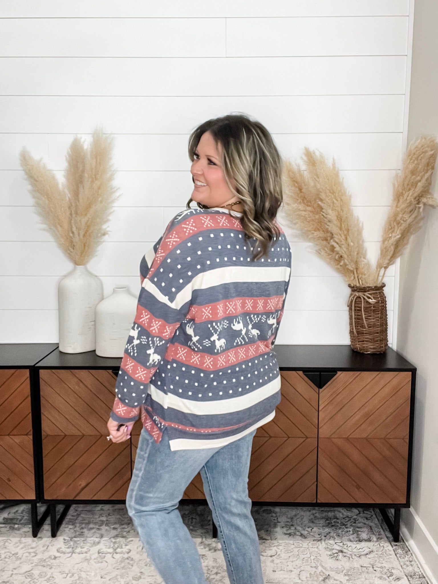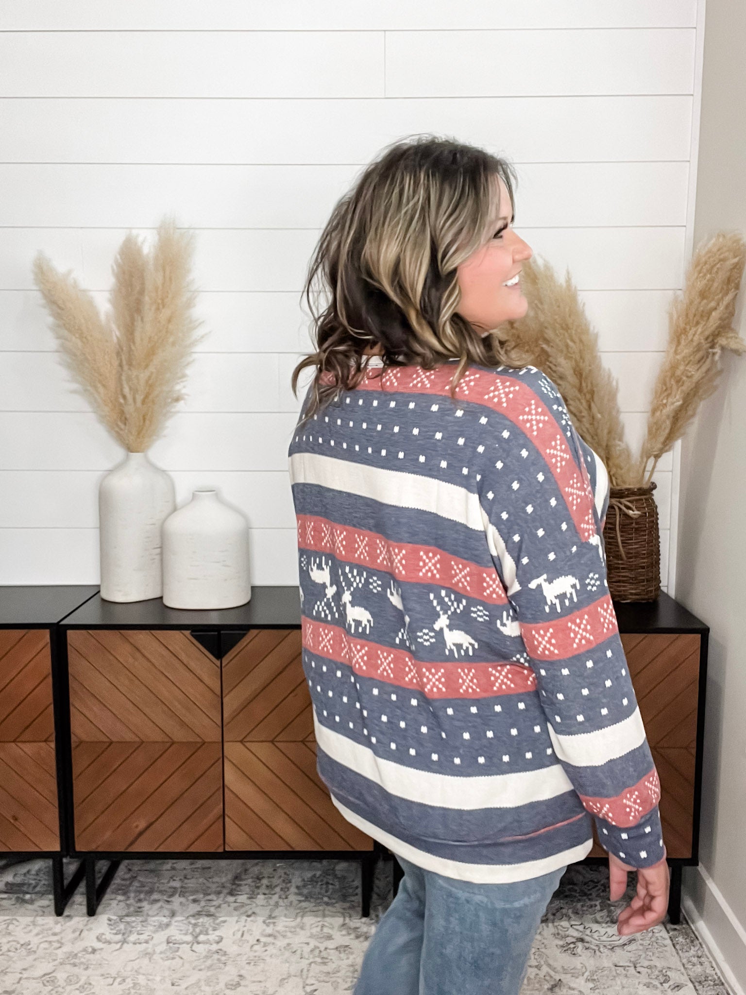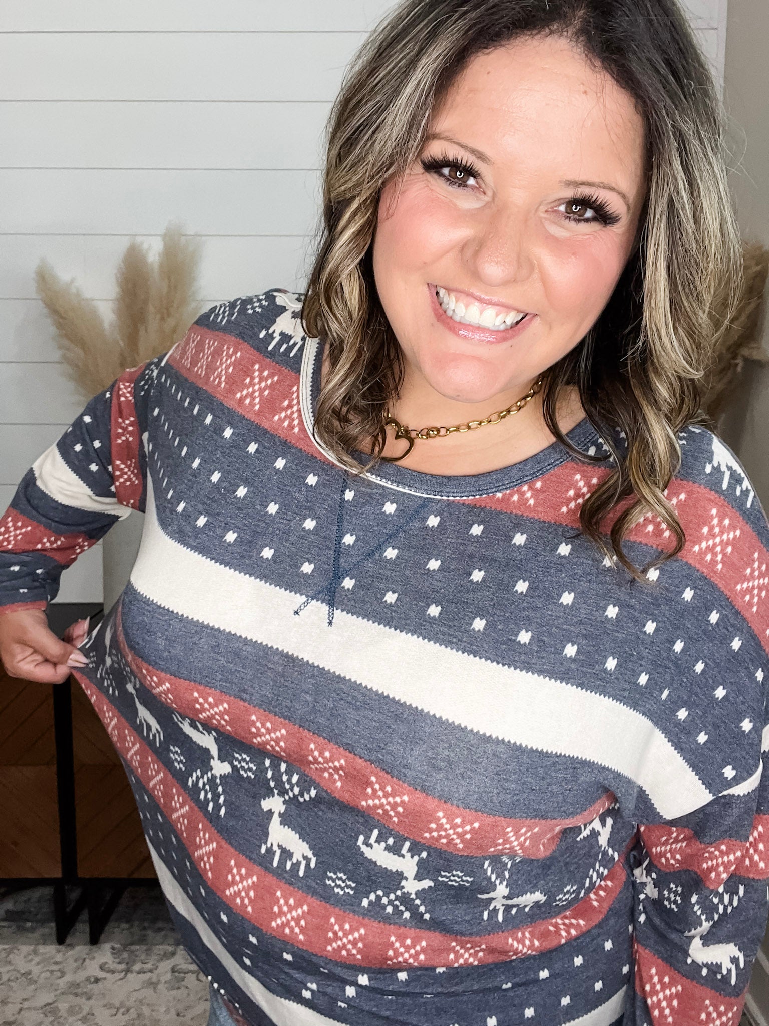 Cozy up this season with the "Holiday" Balloon Sleeve Weekender, featuring festive reindeer and snowflakes on soft terry material. Designed to fit snugly—size down for the perfect holiday hug! Ash, who wears a 40H bust and size large, shows just how comfy and flattering this playful piece can be. Perfect for chilly days and holiday cheer!
