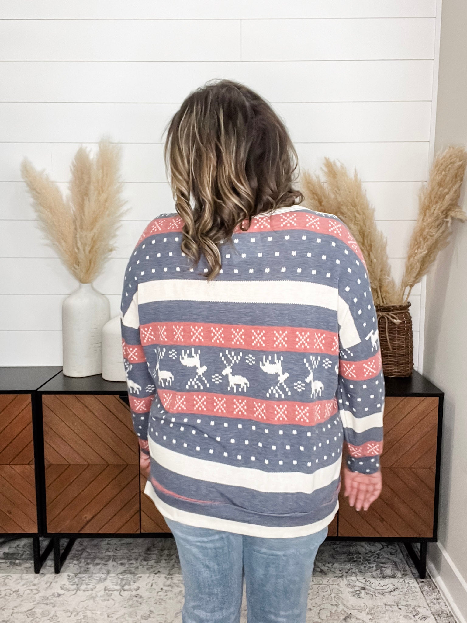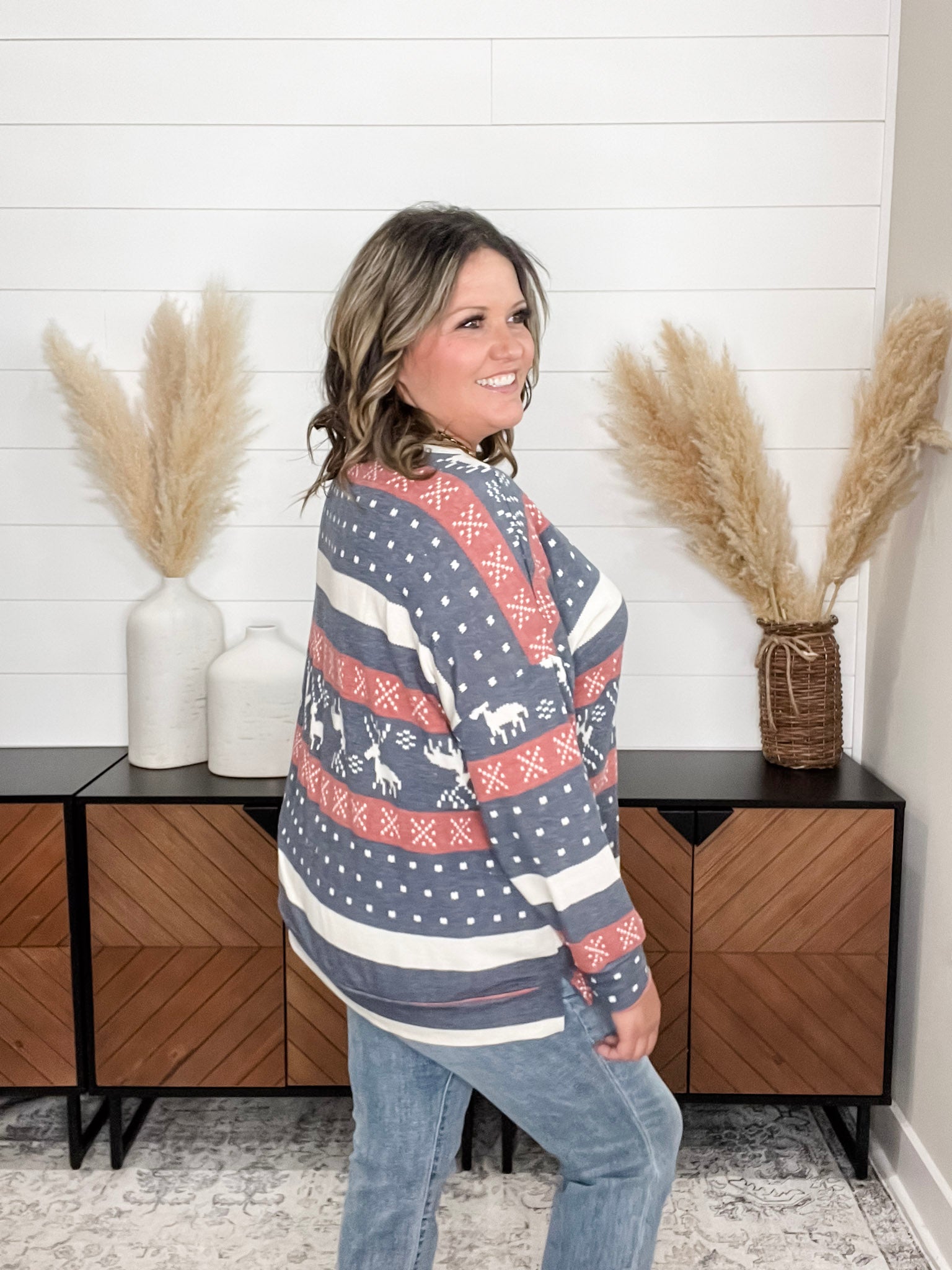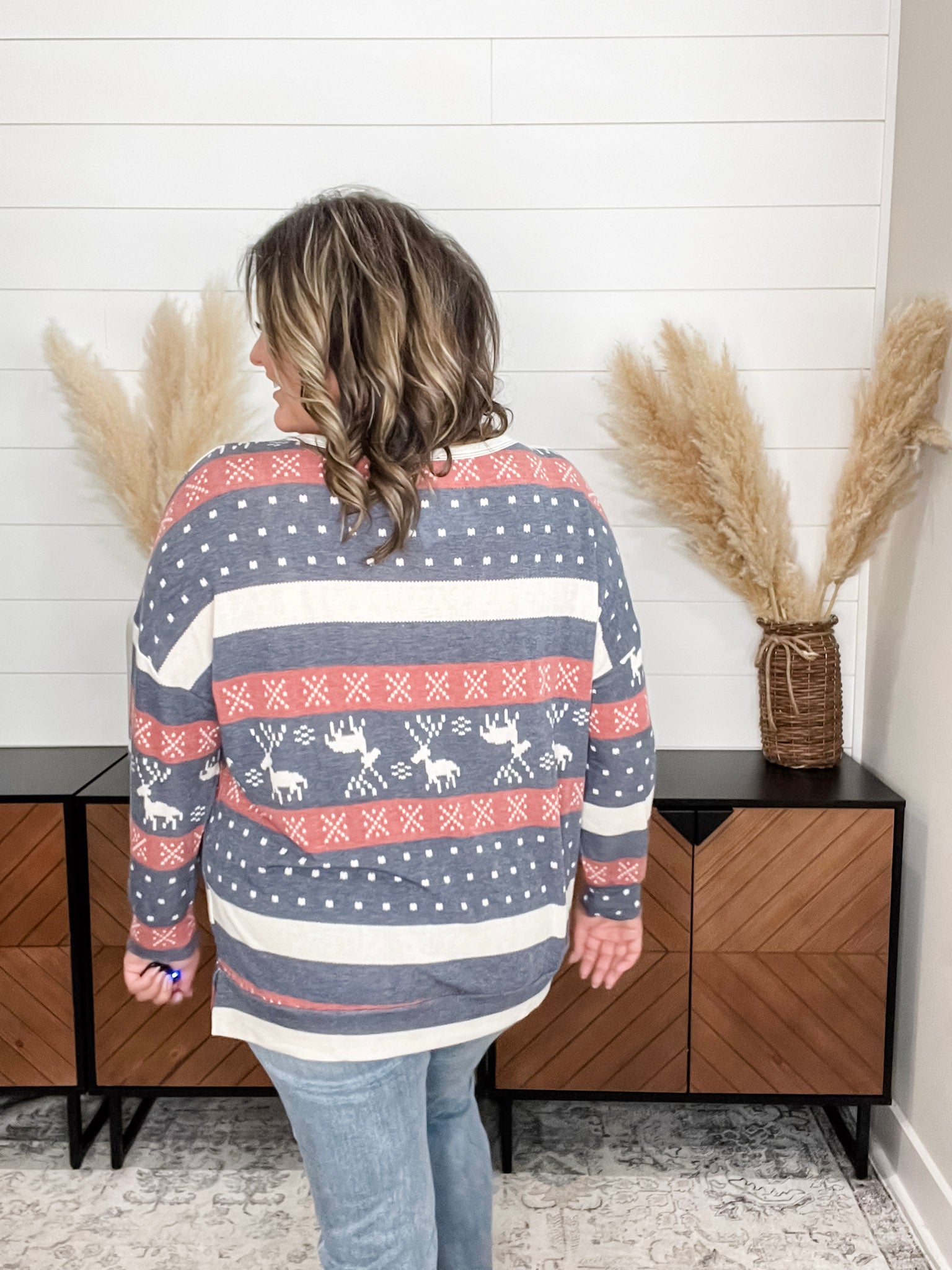Cozy up this season with the "Holiday" Balloon Sleeve Weekender, featuring festive reindeer and snowflakes on soft terry material. Designed to fit snugly—size down for the perfect holiday hug! Ash, who wears a 40H bust and size large, shows just how comfy and flattering this playful piece can be. Perfect for chilly days and holiday cheer!