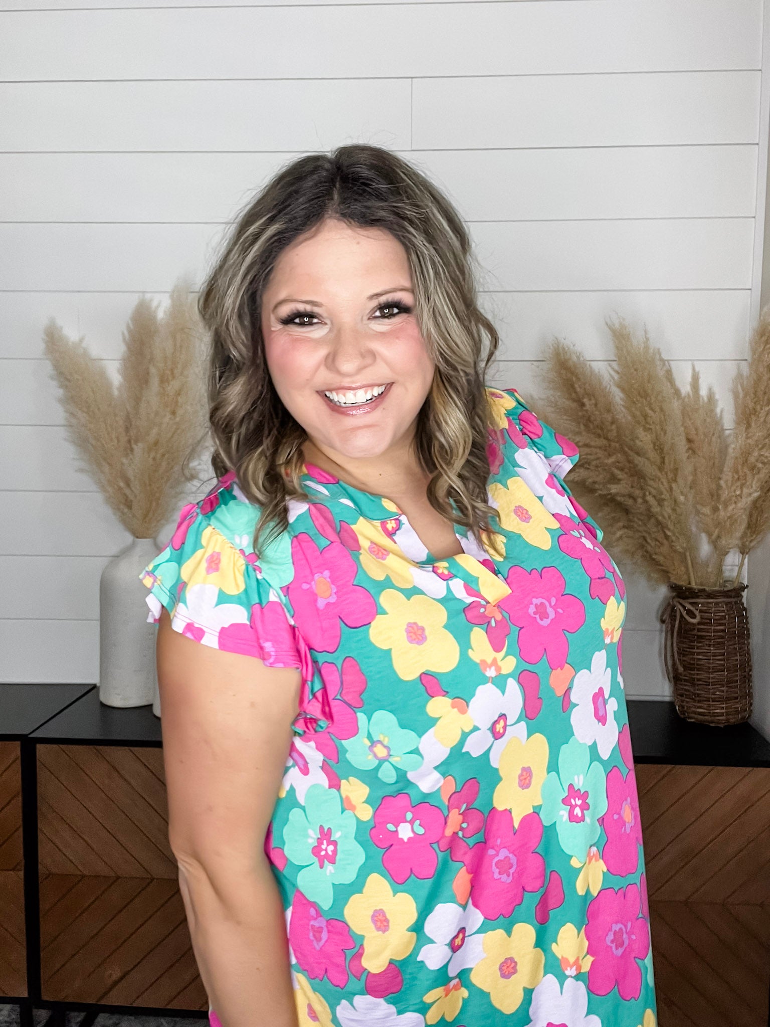 Elevate your style with the "Holloway" Flutter Sleeve Split Neck top. The green base showcases a stunning large floral pattern from the dear scarlett brand. With wrinkle-free fabric and great stretch, this top is both functional and fashionable. True to size for the perfect fit.