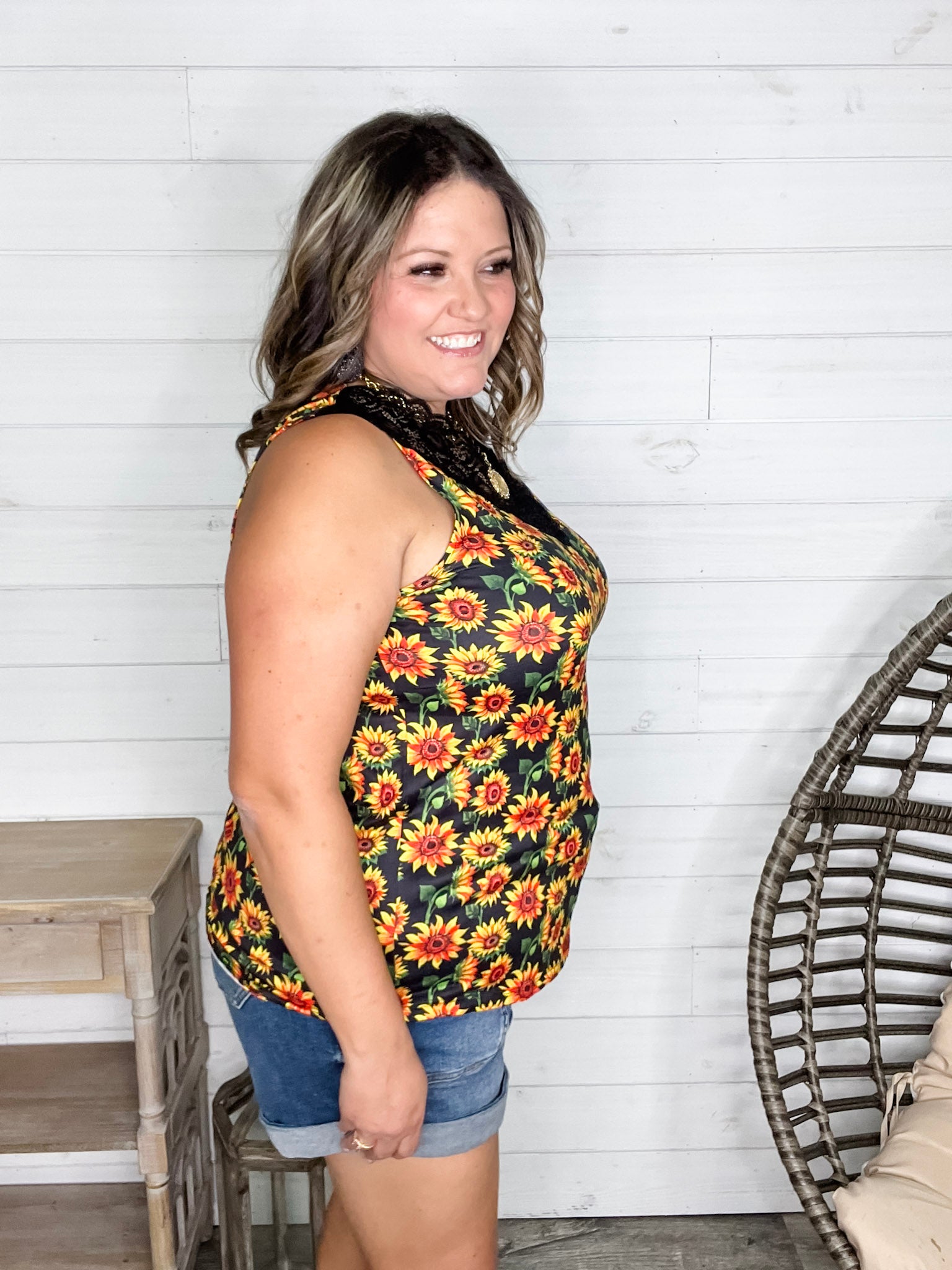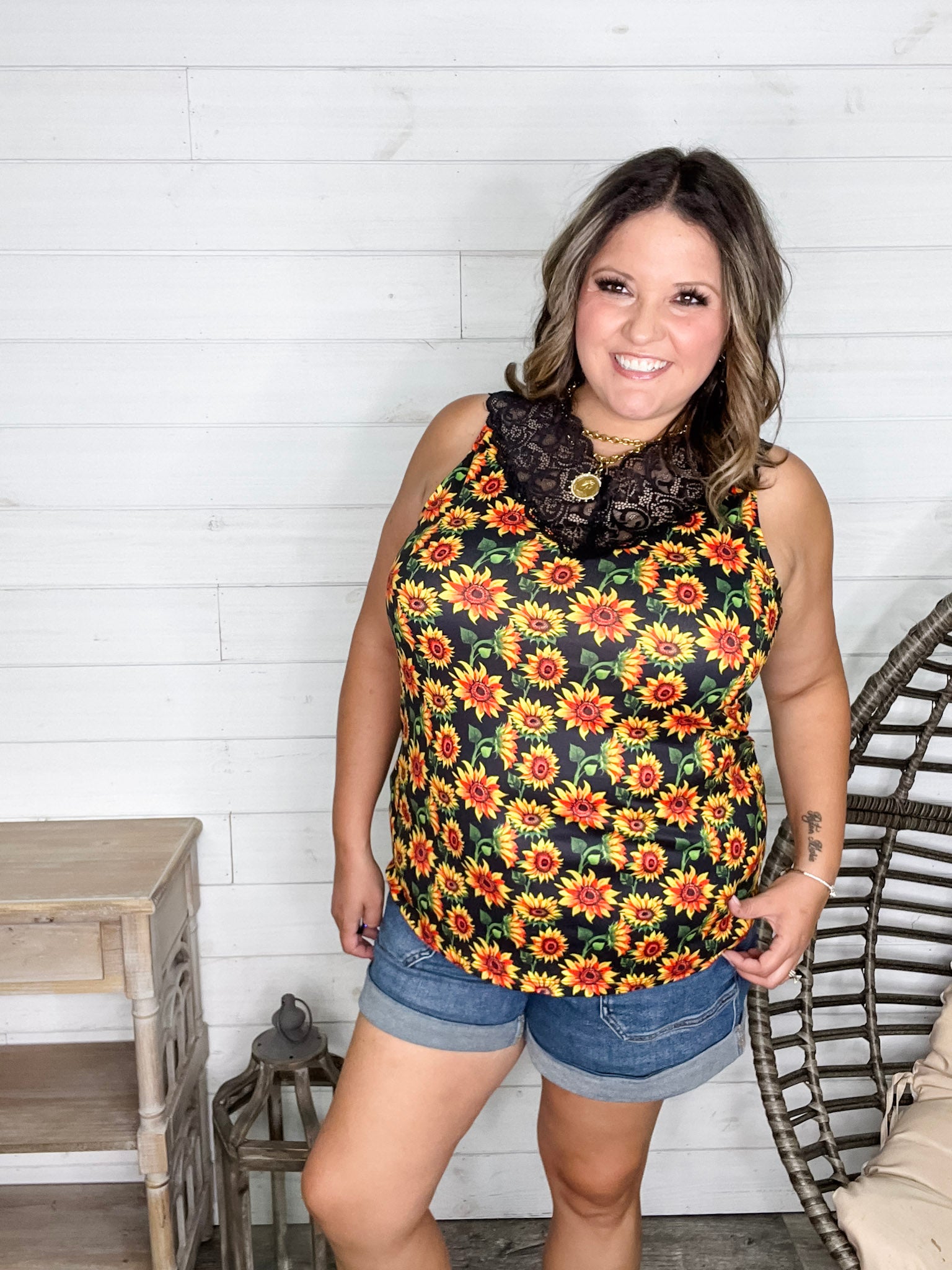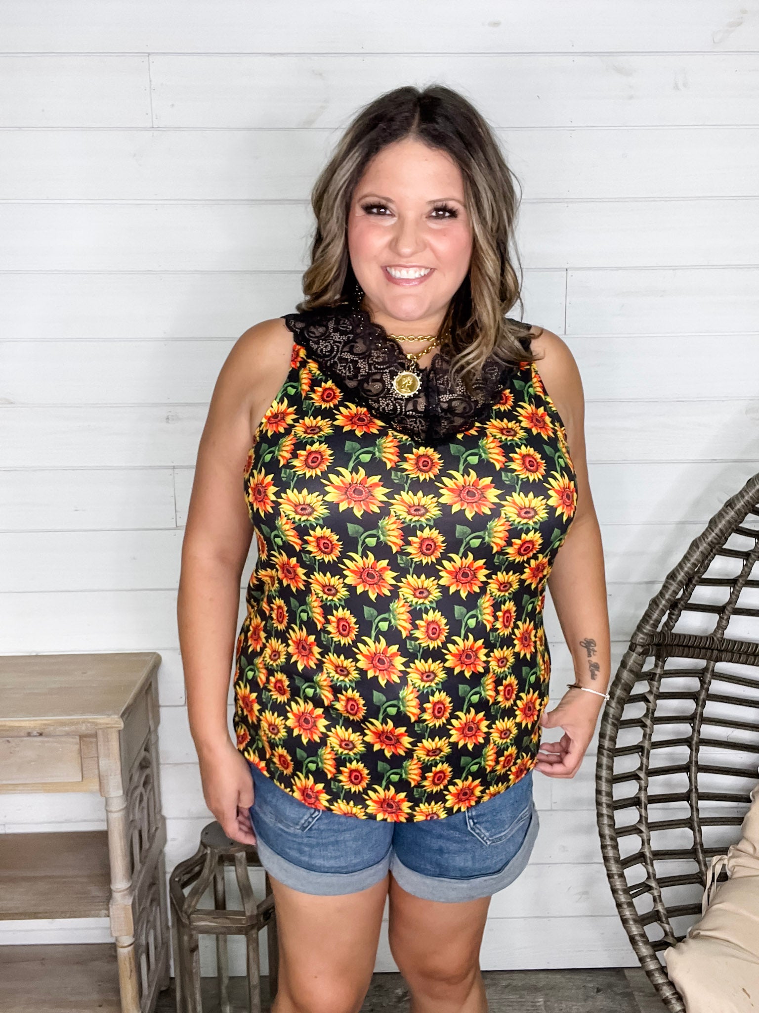 Brighten your day with the "I Am Happy" Sunflower Tank, featuring delicate lace details for a flirty touch. Crafted from buttery soft fabric, it feels like a gentle hug all day long. For a more fitted look, size down one and enjoy a playful, comfy style that’s perfect for sunny adventures.