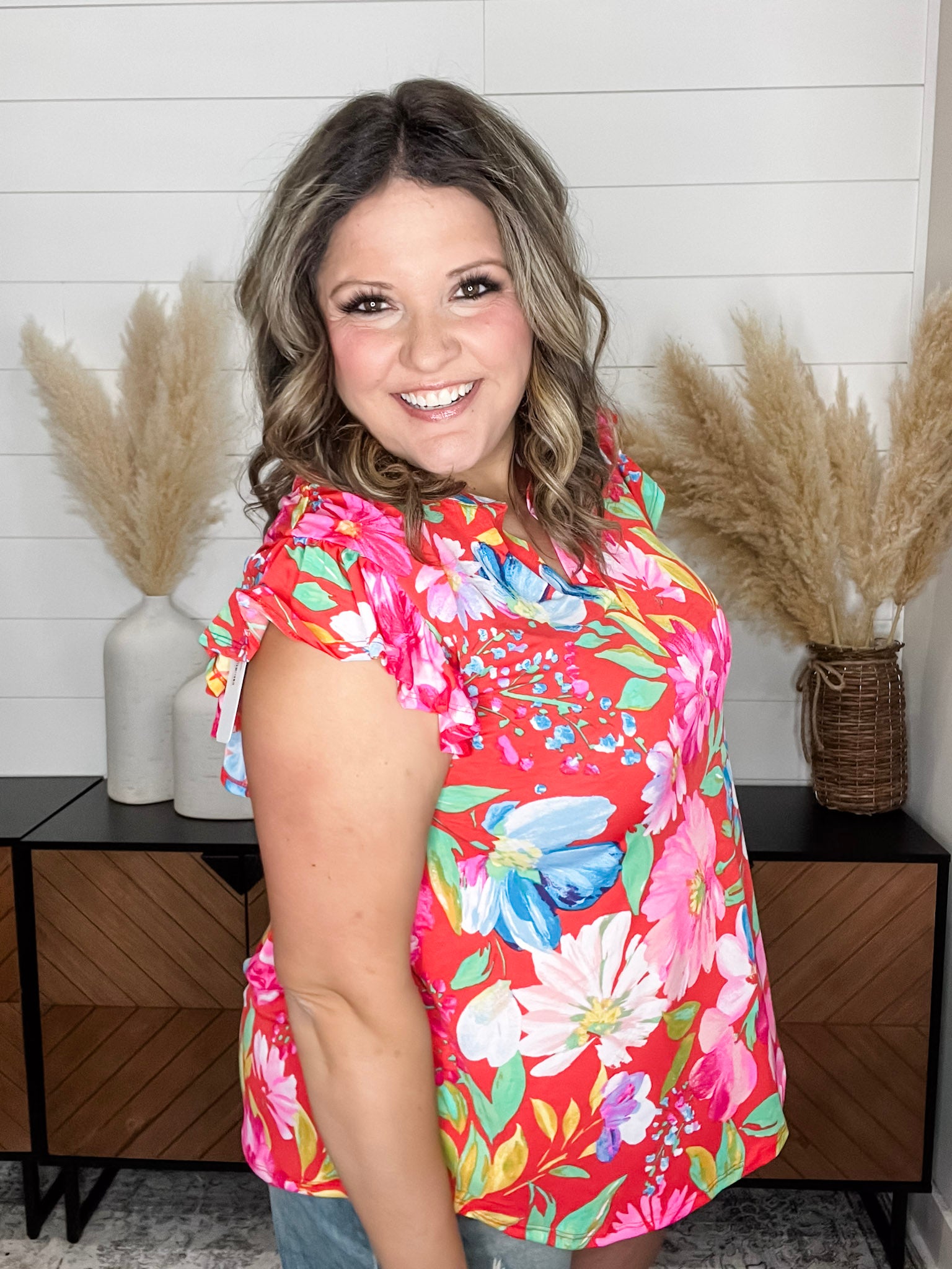 This "Irondale" Flutter Sleeve Split Neck blouse by dear scarlett features a bright red base with vibrant large florals, adding a touch of color to your wardrobe. The flutter sleeves provide a feminine touch, while the slinky stretch fabric ensures comfort and a wrinkle-free look. True to size and from the trusted dear scarlett brand, this blouse is a must-have for any fashion-forward individual.