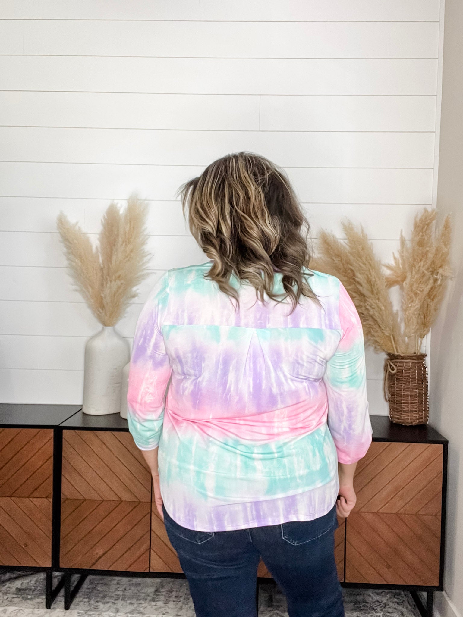 These "Issue" 3/4 Sleeve Split Neck Tops feature a slinky, stretchy fabric that provides a comfortable and flattering fit. With an abstract design in soft, pastel colors, these tops are perfect for adding a touch of sophistication to any outfit. Be sure to size down for the perfect fit.