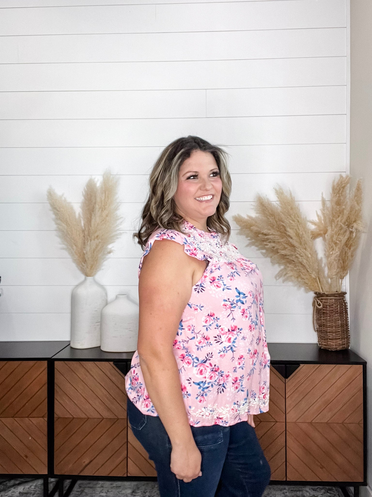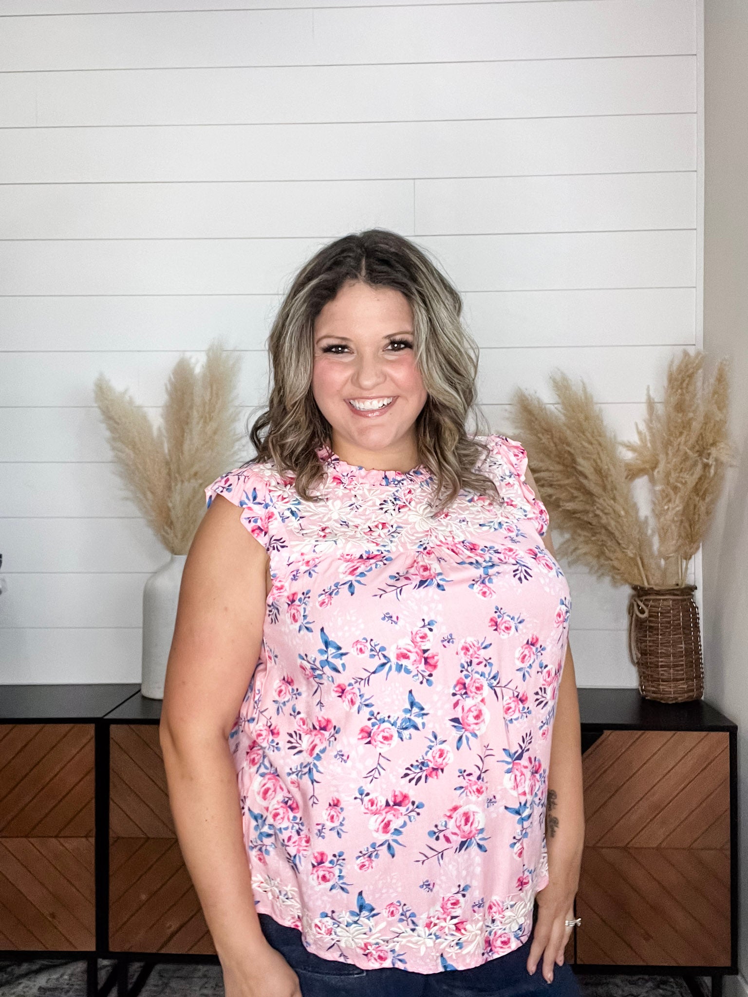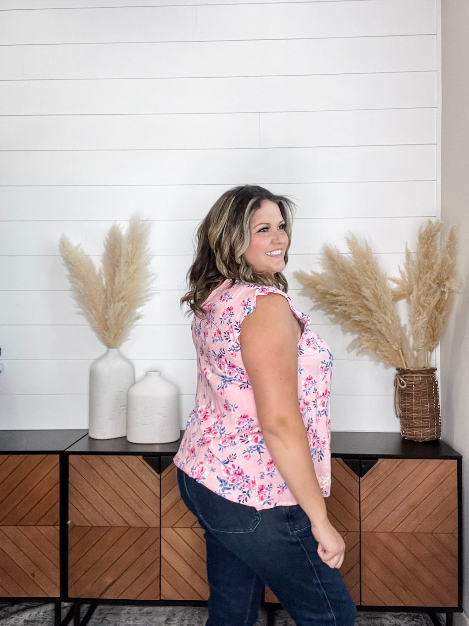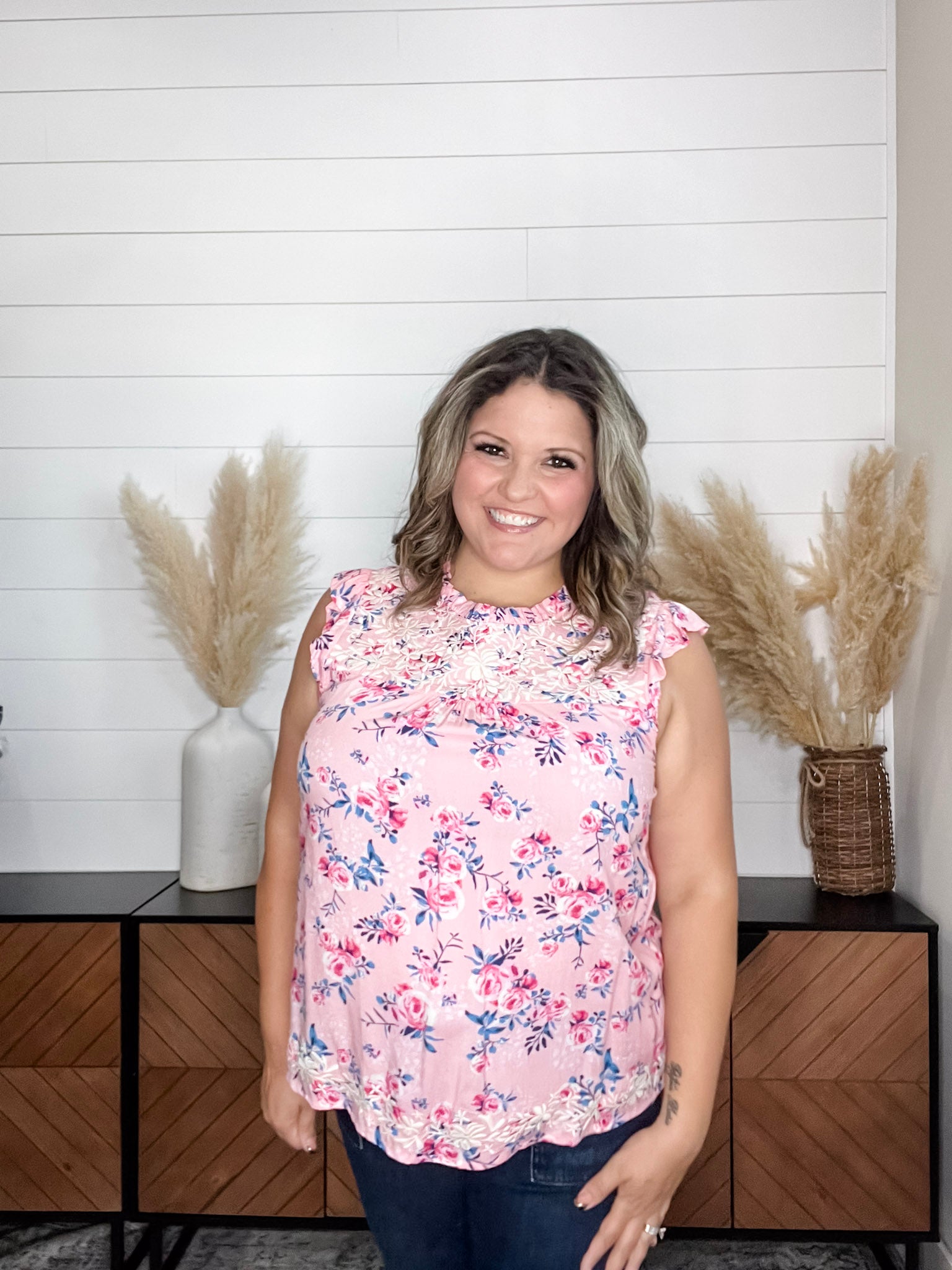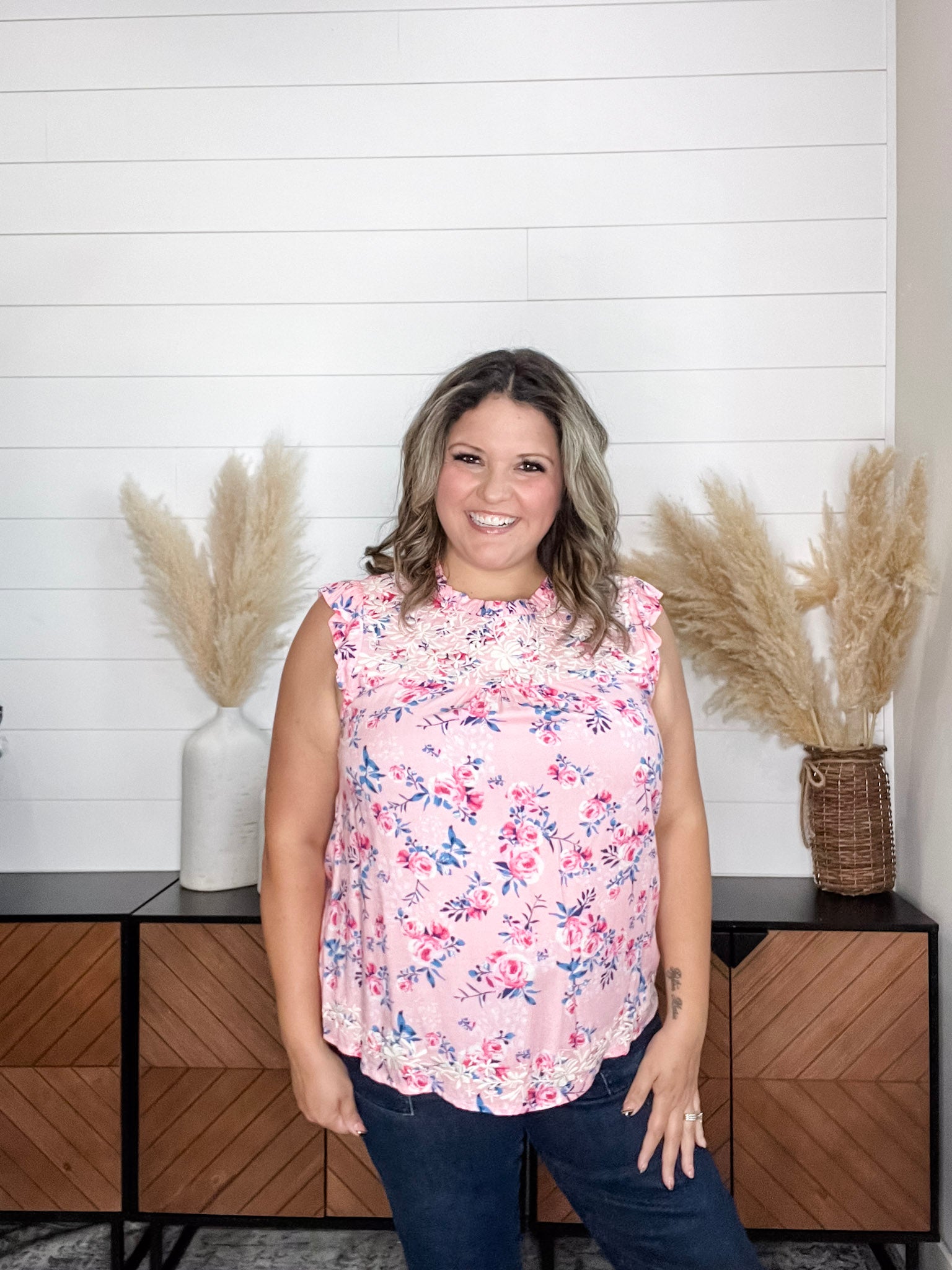 Introducing the "Jensen" Floral Ruffle Cap Sleeveless - the perfect addition to your wardrobe. Our top is true to size and made with high-quality rayon material for maximum comfort and durability. Stay stylish and comfortable all day long.