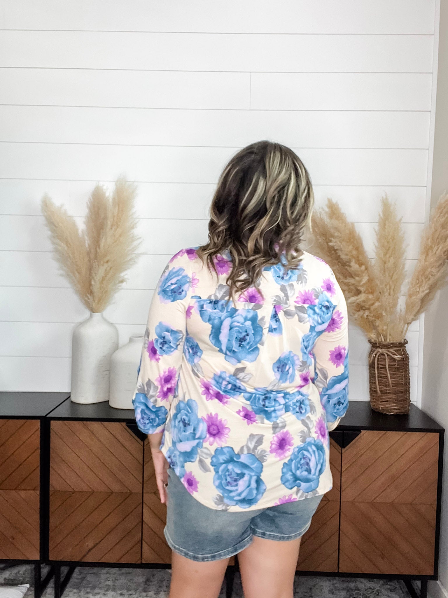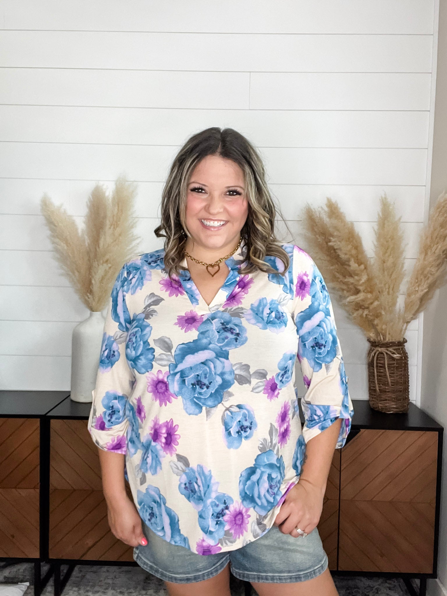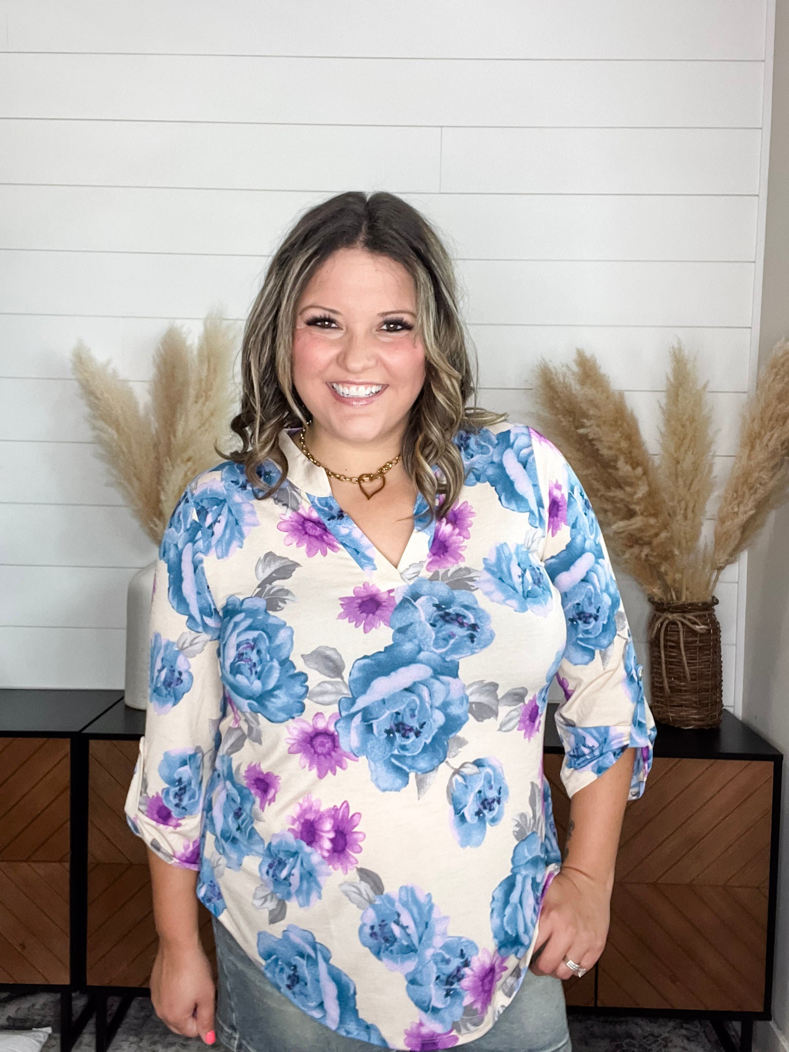 "Judgement" Floral 3/4 Sleeve Split Neck Tops