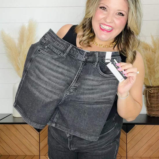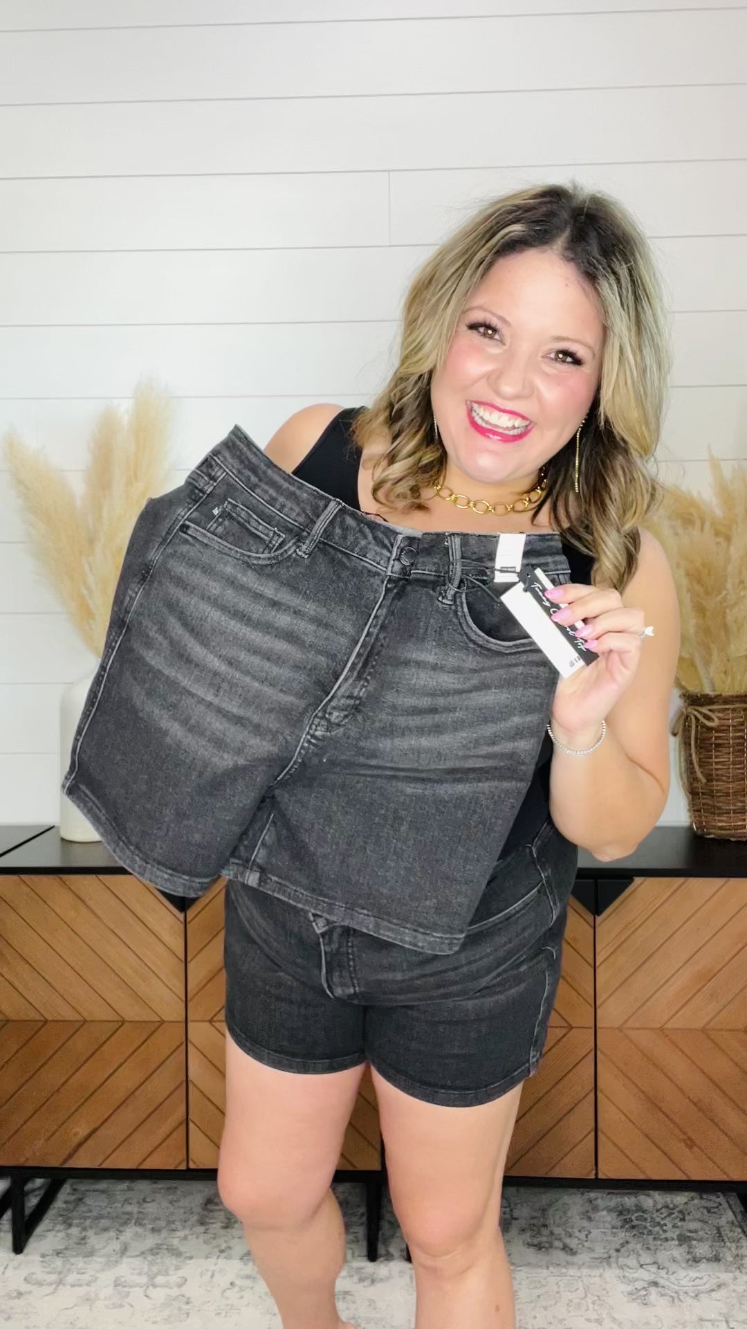 Judy Blue Black Mineral Wash Jean Shorts are the most fantastic mega stretch addition to your wardrobe AND they feature tummy control panels across the lower front tummy! These are one of the top 5 stretchiest Judy Blue shorts we have ever seen. If in between sizes or tummy heavy, you don't need to size up. Ash is a 16/17 wearing the 1X.
