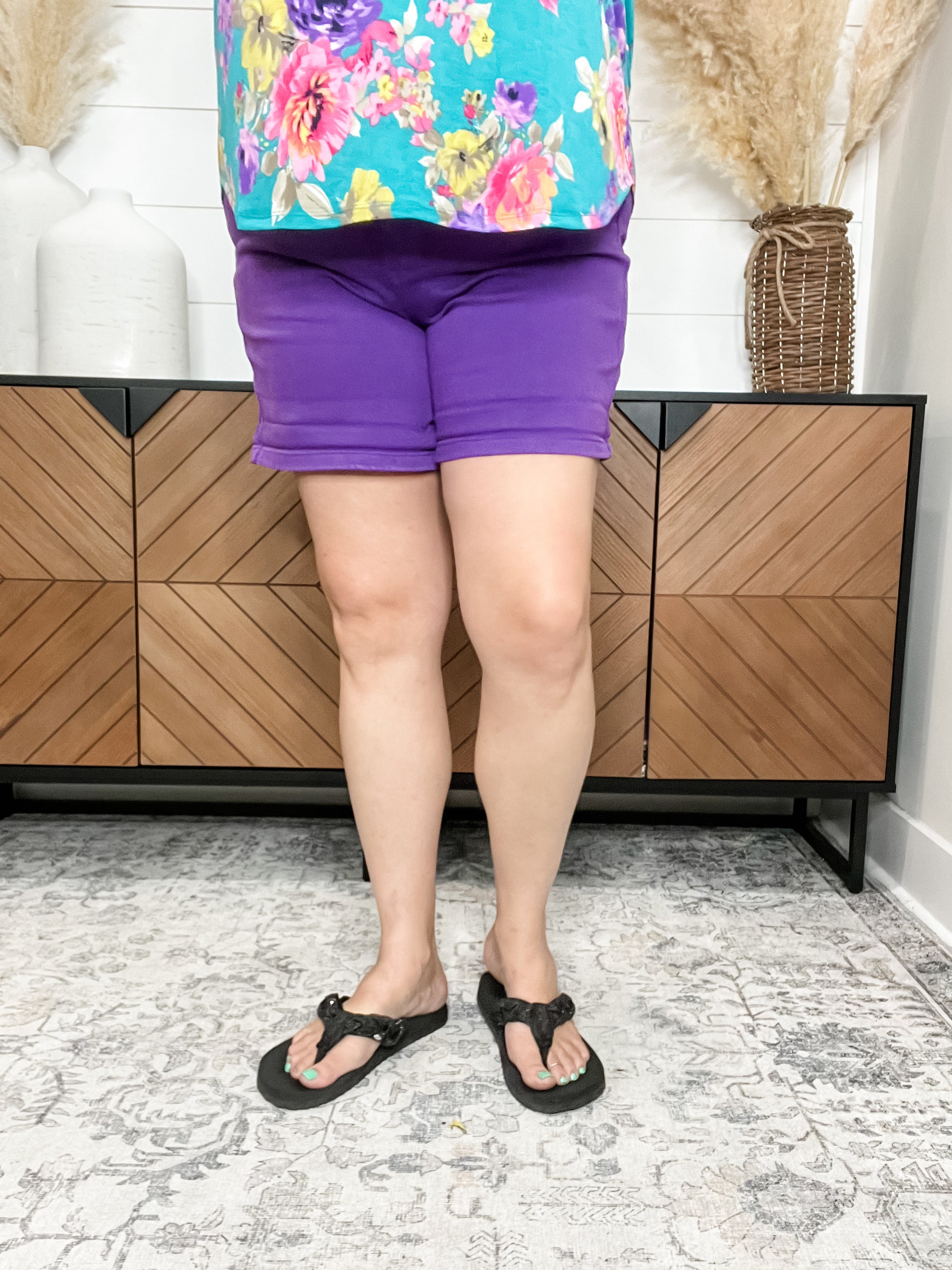 Dark purple Judy Blue tummy control shorts go with so many of our Dear Scarlett tops. This jewel toned super soft thick cotton has great stretch through the legs and can be worn cuffed or uncuffed.