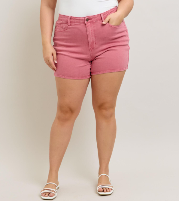Judy Blue Rose Shorts are super soft with great stretch. At almost a mid thigh, the length and overall fit is great for thick thighs too. Ash is a 16/17 wearing the 1X.