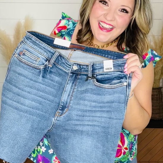 Judy Blue Mid Thigh Jeans are the perfect no chub rub addition to your wardrobe this summer! Featuring a high cotton content with great stretch and raw bottom hem, this pair is the ultimate combination of comfort, stretch that feels lightweight and OG denim to smooth you out in all the right places. Ash is a 16/17 (normally a 15 in Judy Blue) wearing the 1X. See full sizing below.