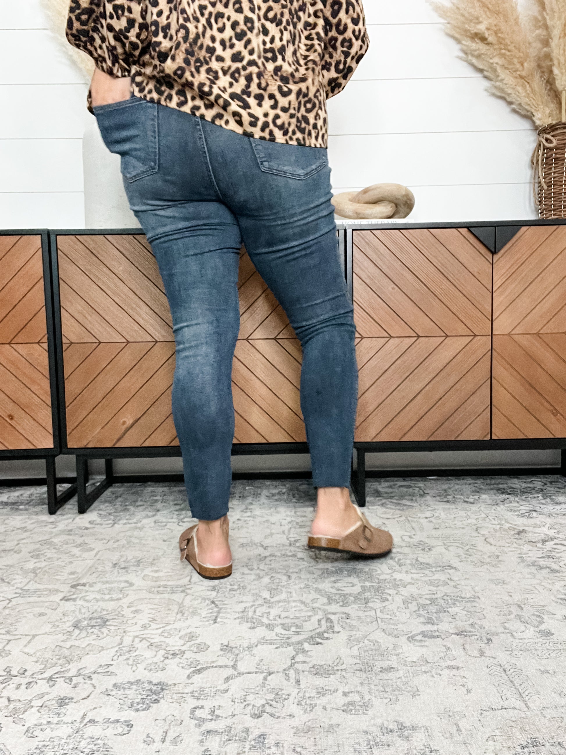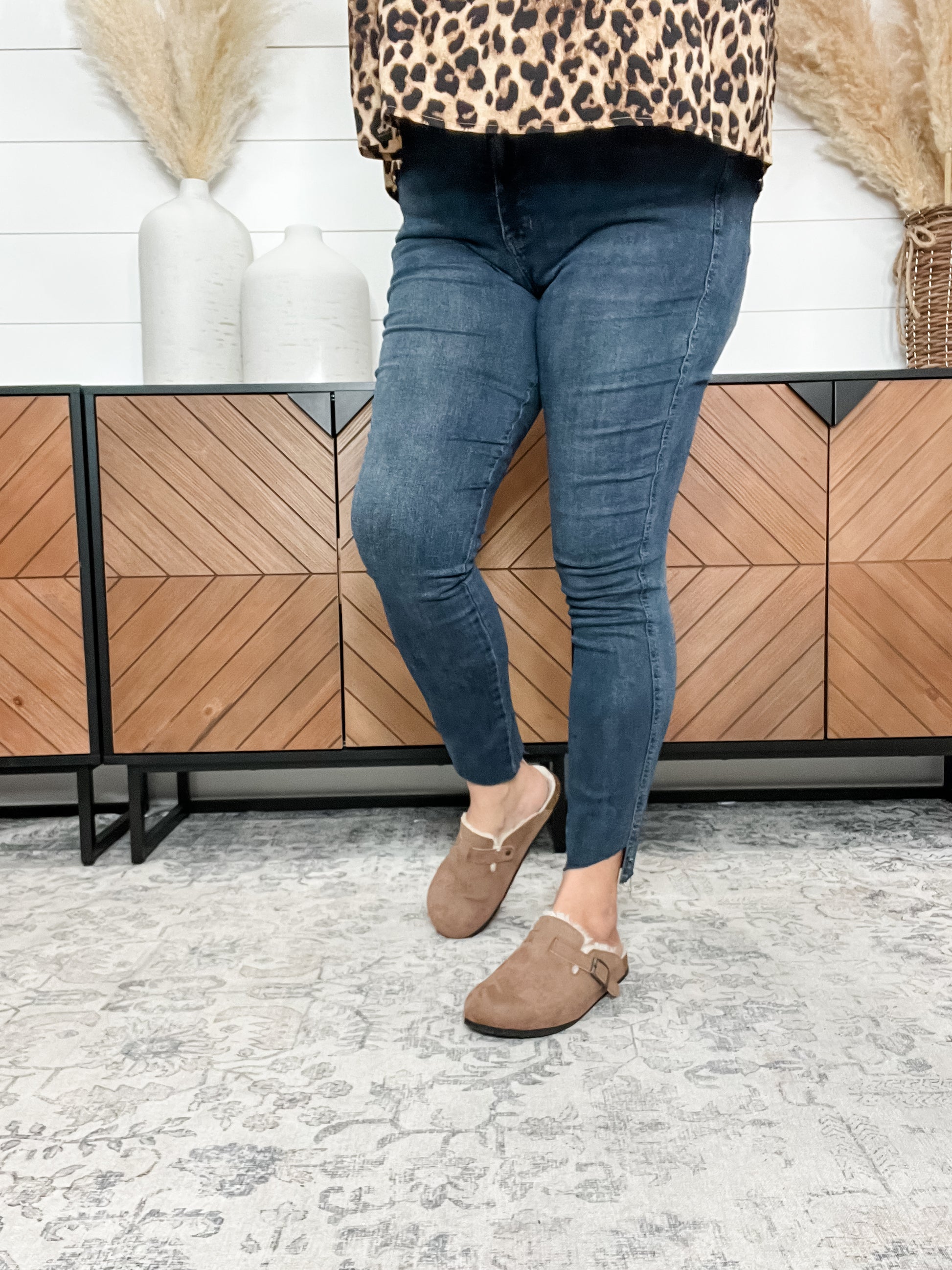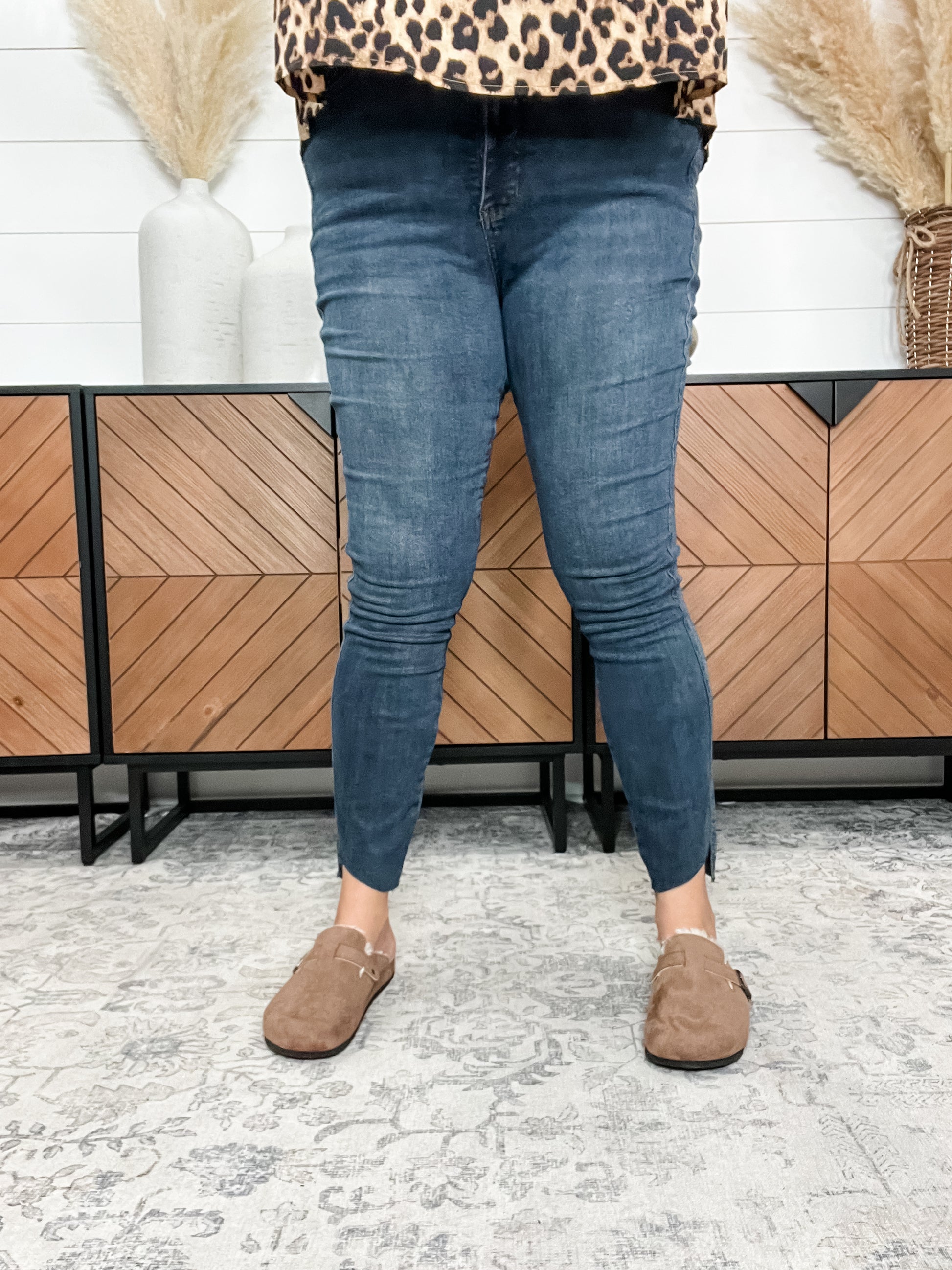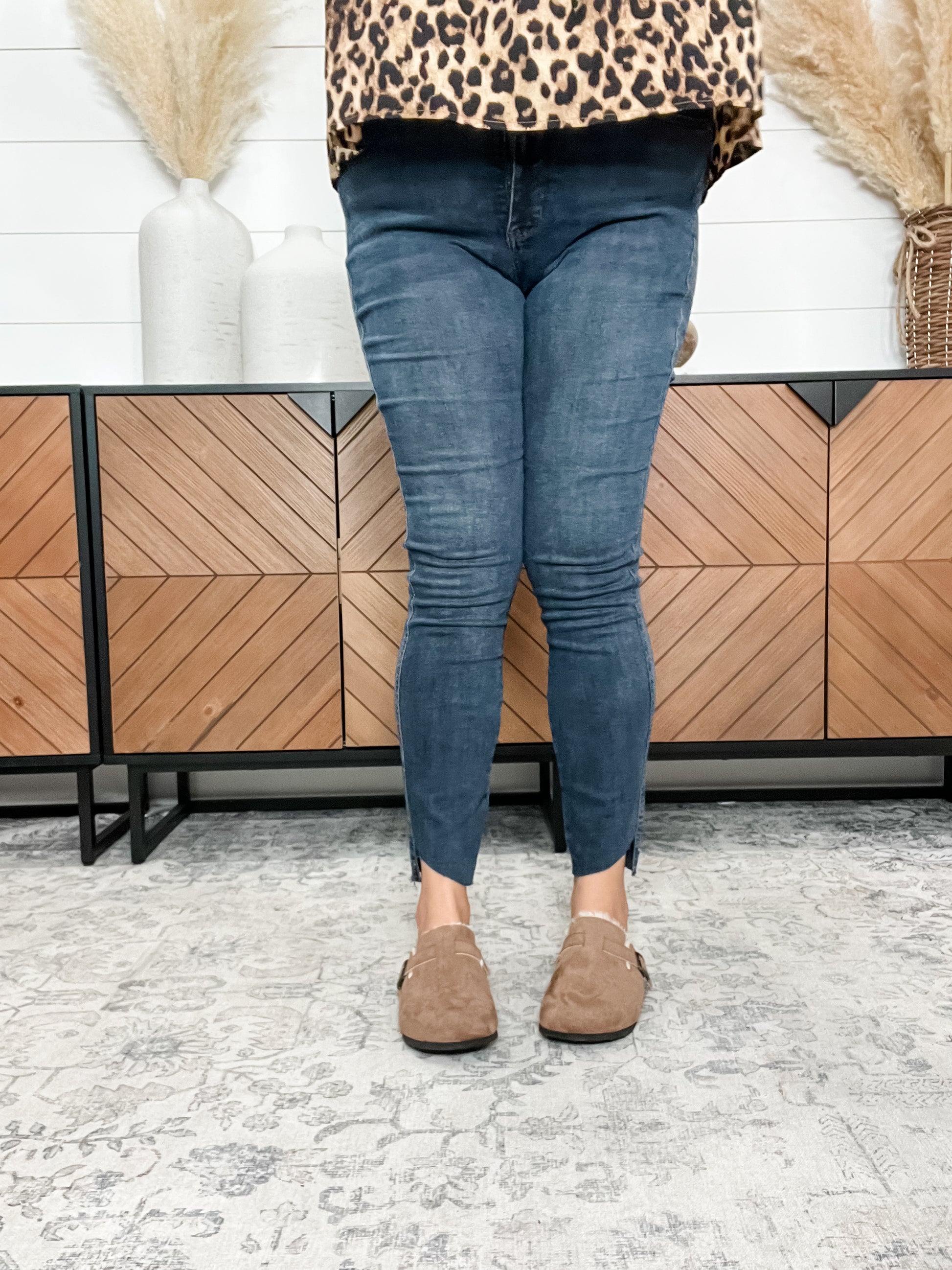 Dark Wash Judy Blue Tummy Control jeans have a new vibe! Featuring a raw bottom hem with an asymmetrical detail, these are great in your even store size minus one. These are a super comfy soft thick skinny jean with amazing stretch through the legs!