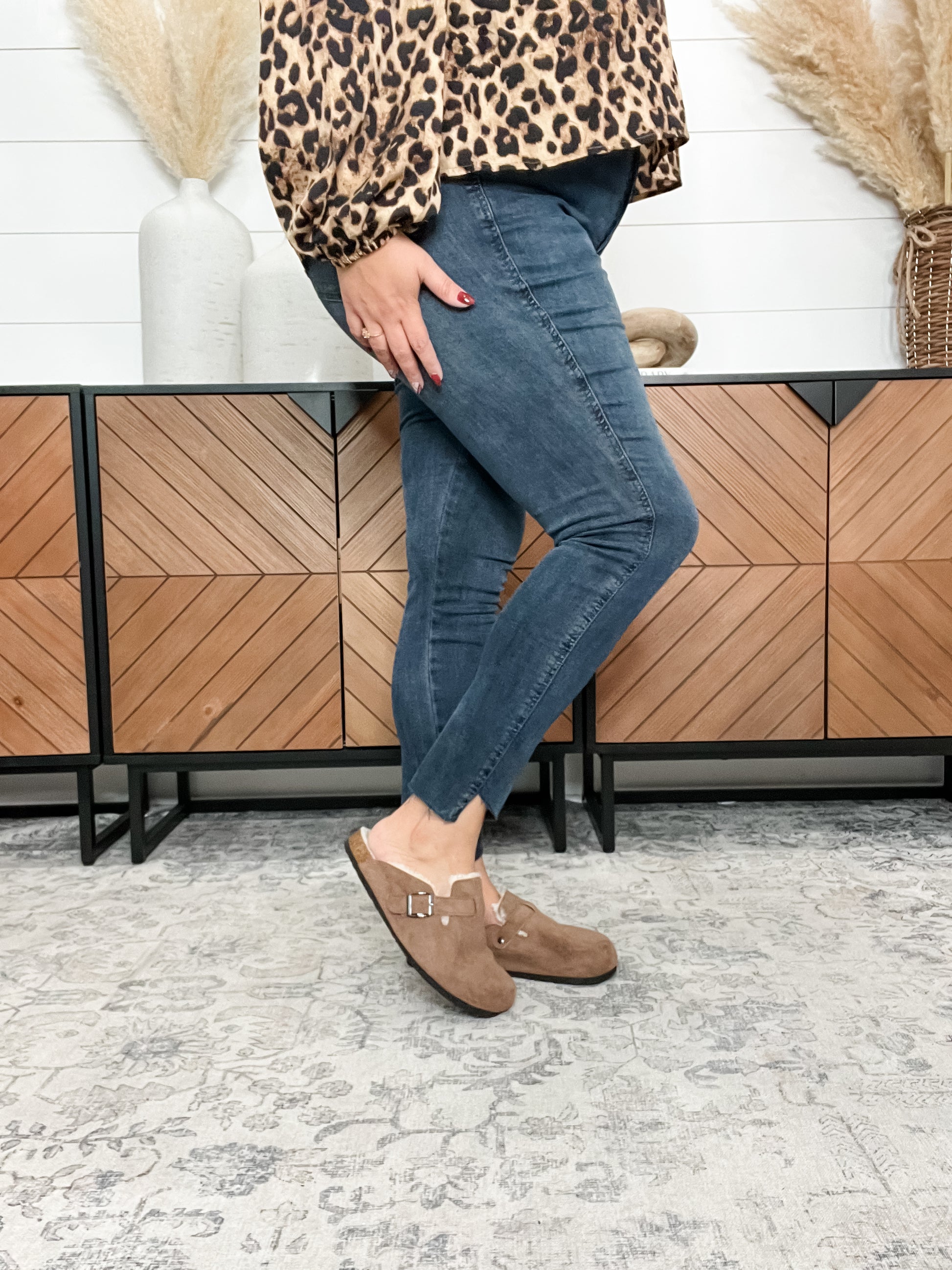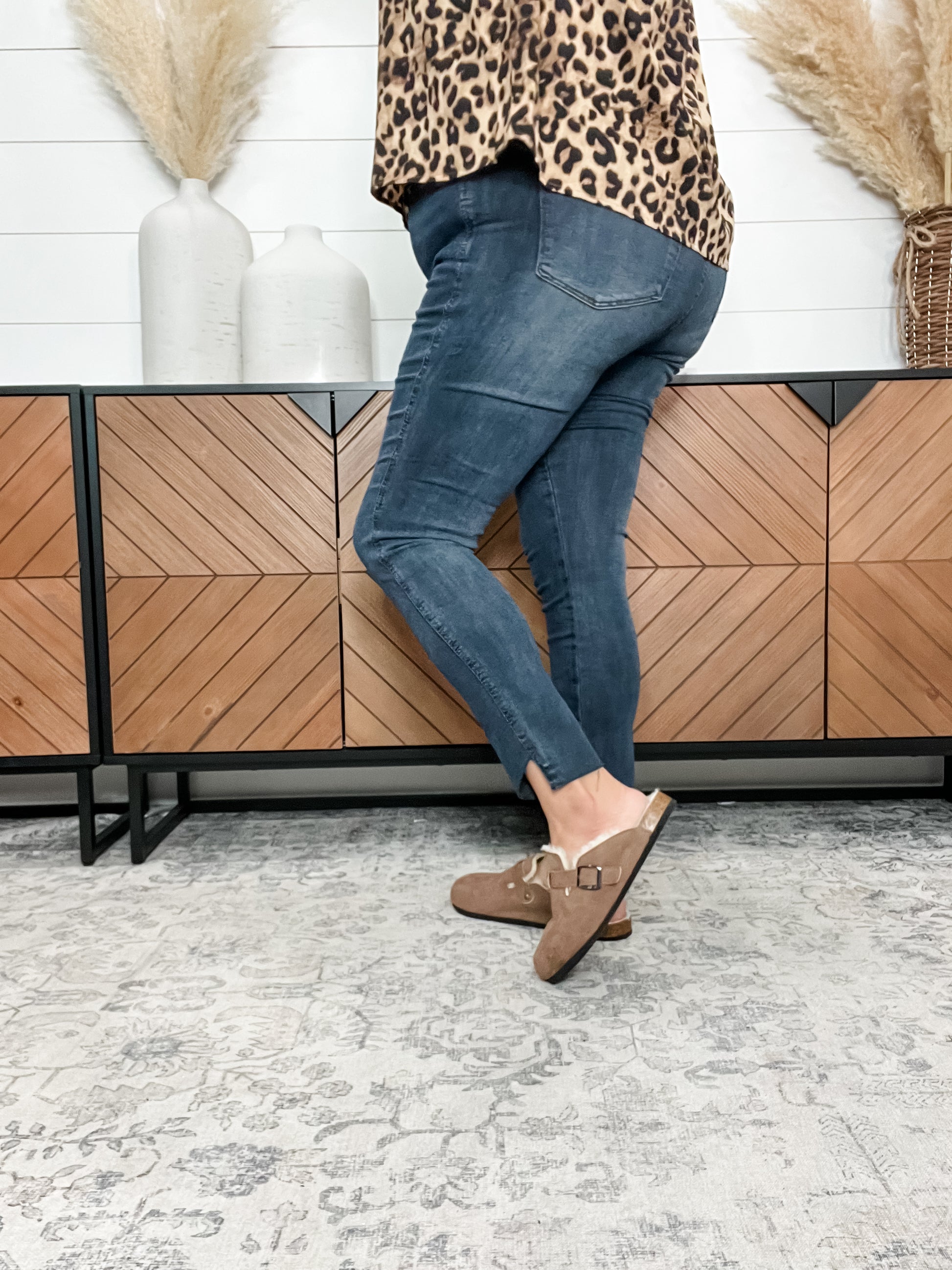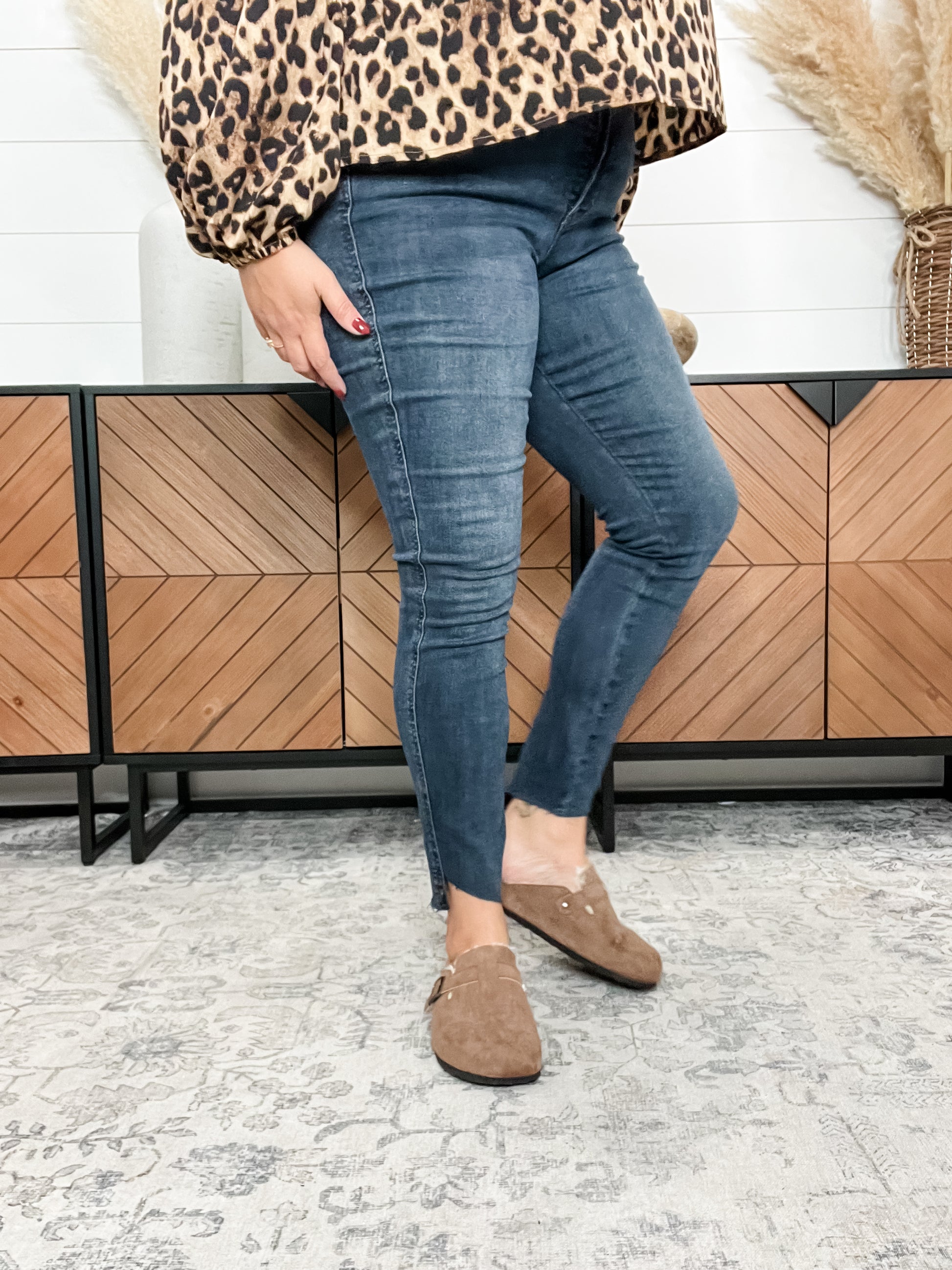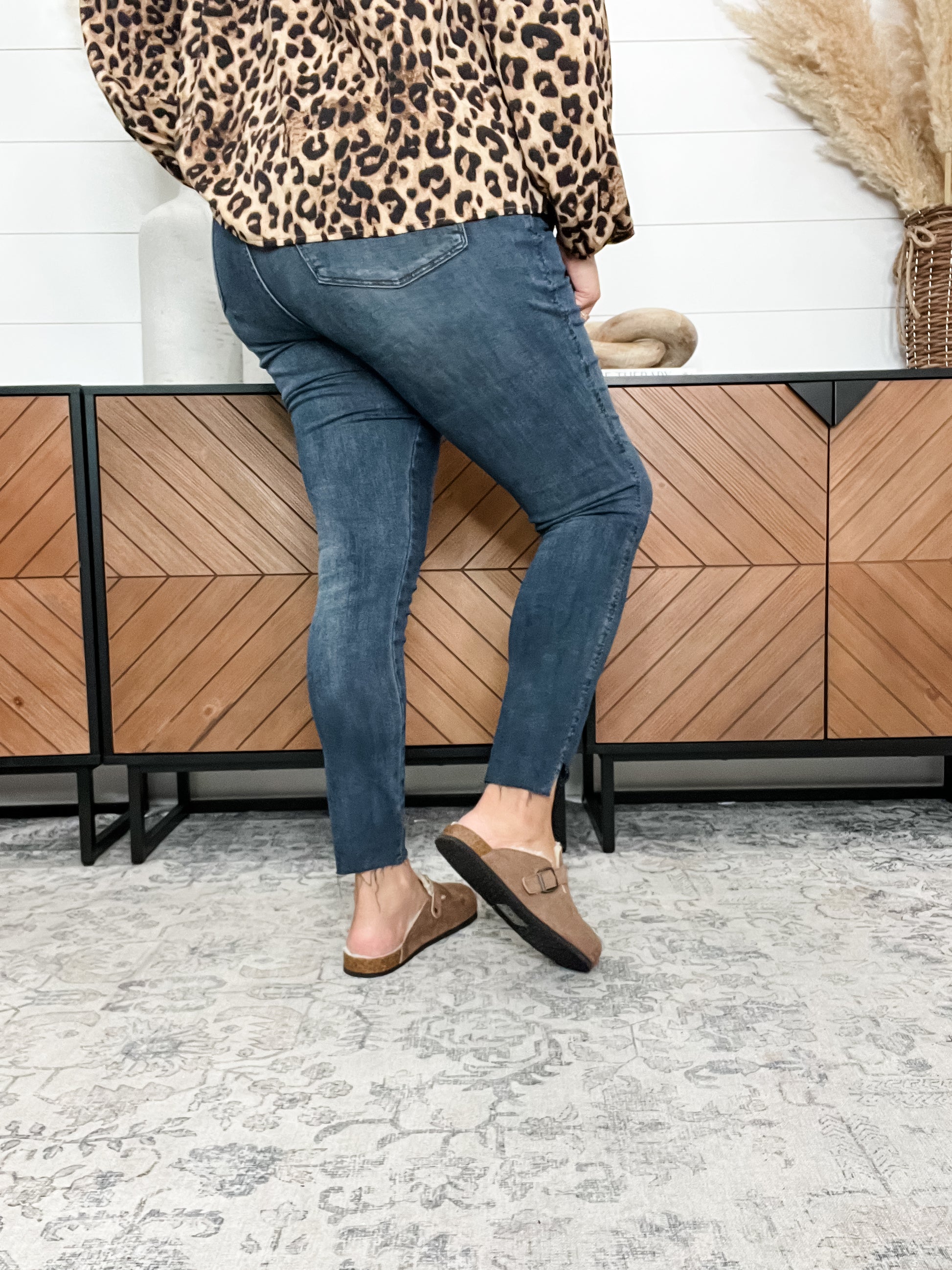 Dark Wash Judy Blue Tummy Control jeans have a new vibe! Featuring a raw bottom hem with an asymmetrical detail, these are great in your even store size minus one. These are a super comfy soft thick skinny jean with amazing stretch through the legs!