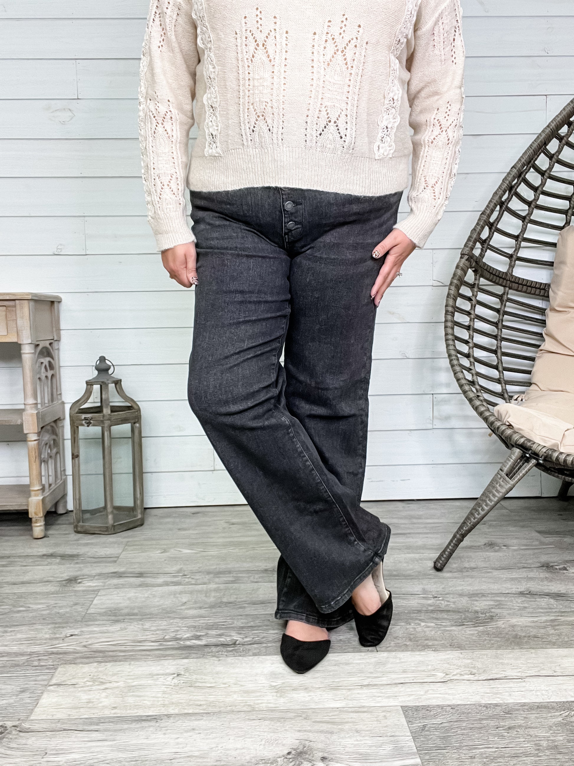 Slip into the Judy Blue "Date Night" Black Trouser Jeans—the yummiest black mineral wash denim with mega stretch at the leg and waist for all-day comfort. With a cool button fly and ultra-soft fabric, they're perfect for casual Fridays or dressing up with your favorite boots. Got longer legs? These jeans look fab with flats, too! Thanks to the amazing stretch, you can confidently size down for a sleek, fitted waist. Your new go-to for effortless style and comfort all week long!