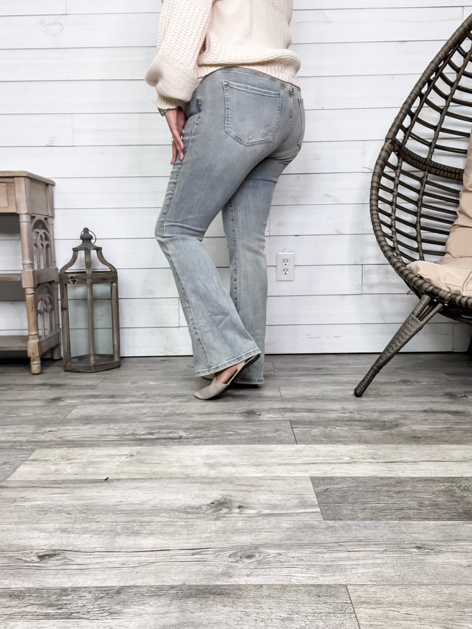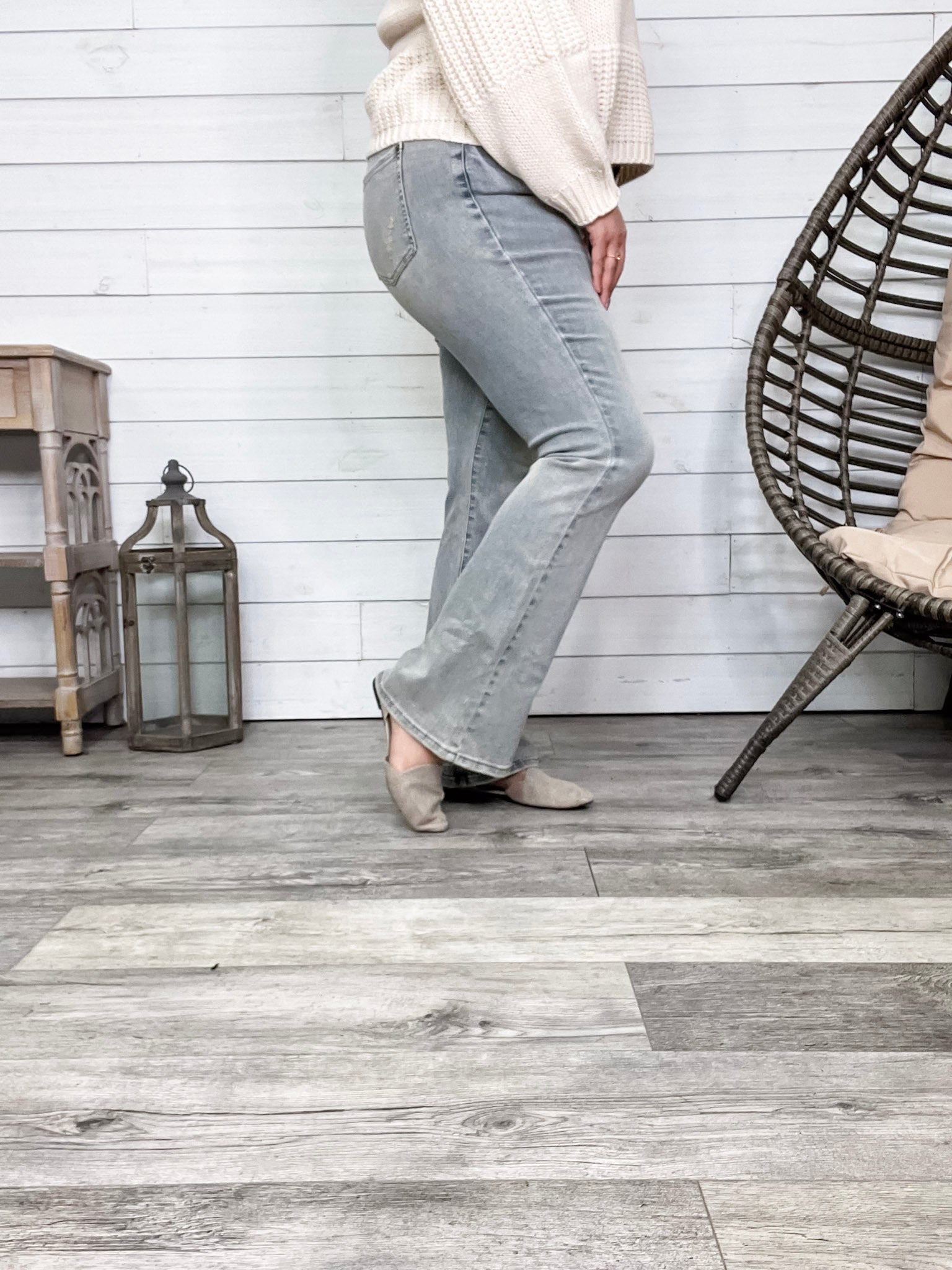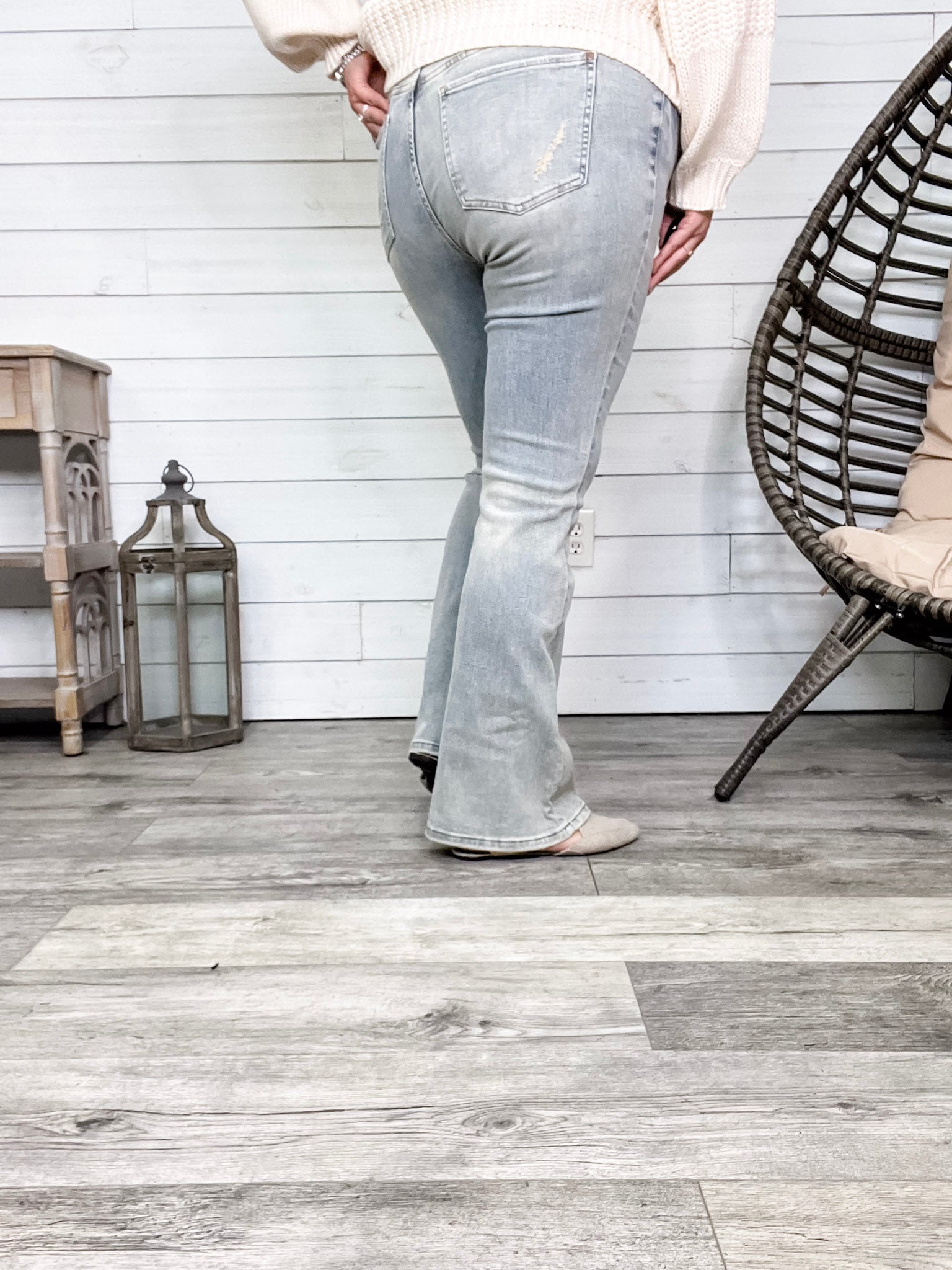 These Judy Blue "Bye John" Pin Tack Flares are your new go-to for effortless style and comfort. Made with a high cotton blend and just the right amount of stretch, they shape perfectly to your curves over time. Whether you’re dressing up or keeping it casual, these flares fit true to size—though you might even try a size down for a snugger fit. Ash rocks a size 15 while usually wearing 16/17, so get ready to flaunt your best look with these playful, flattering jeans!