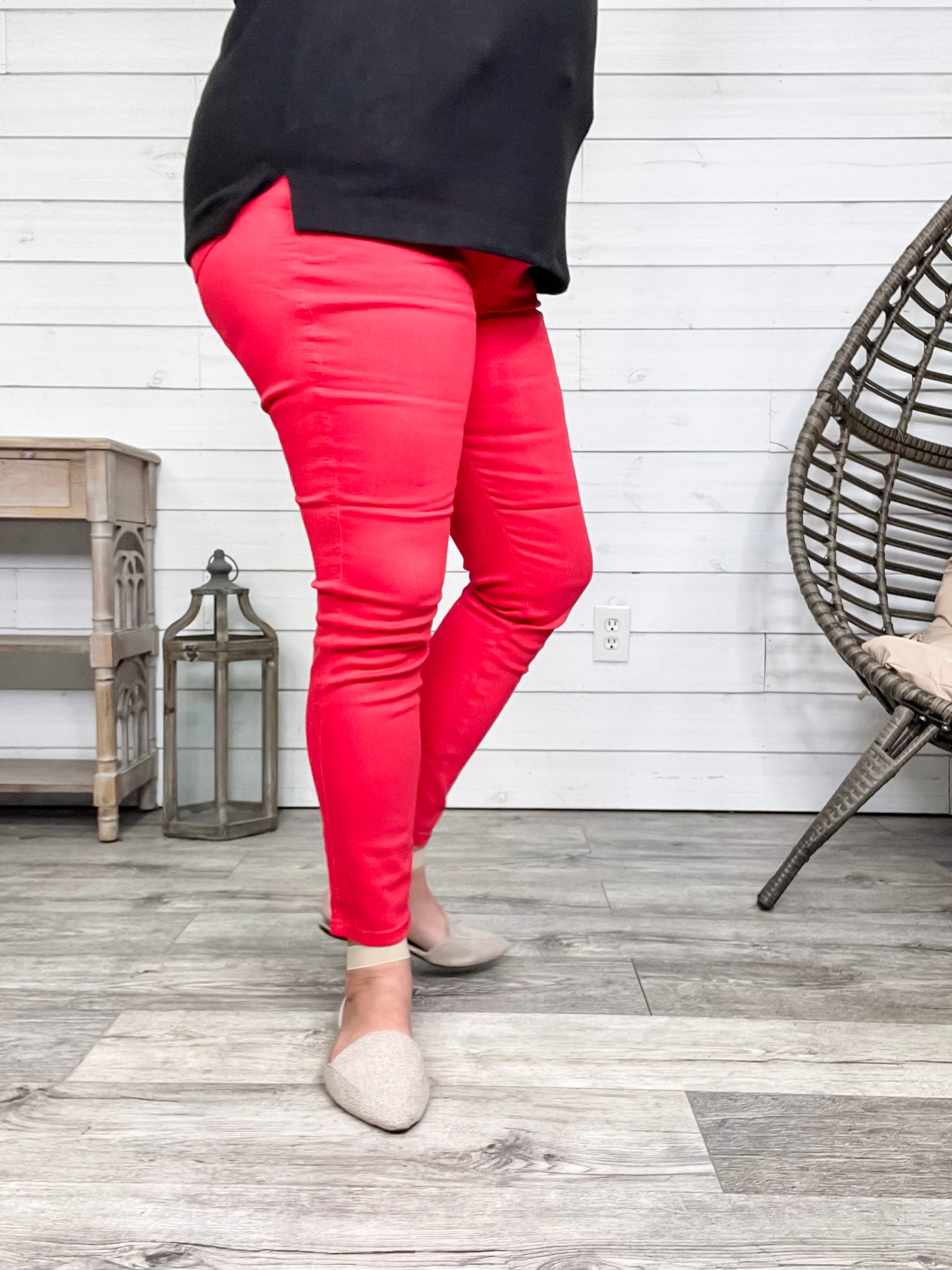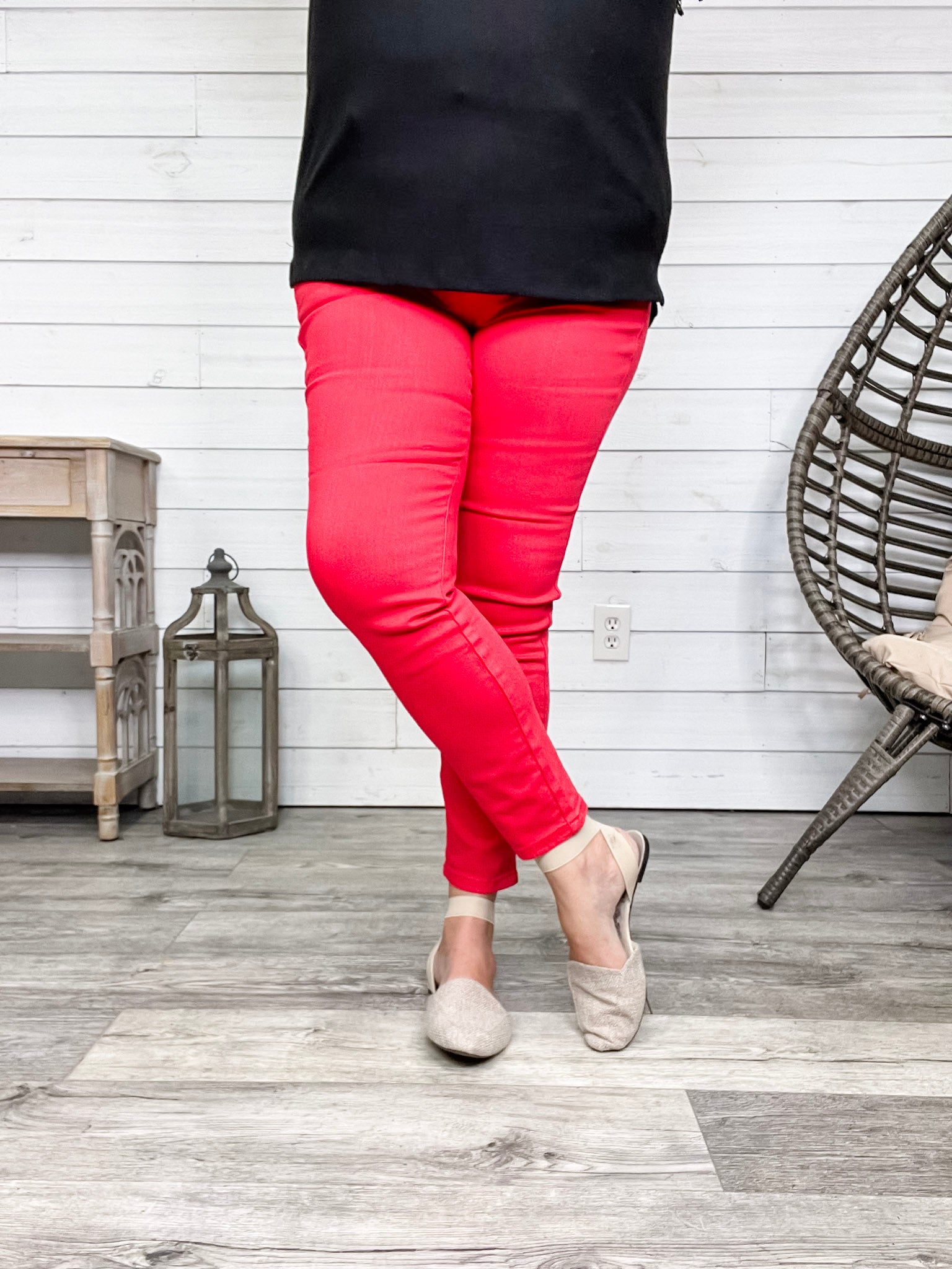 Turn up the heat with our Judy Blue "Fire Engine" Red Tummy Control Skinny Jeans! These vibrant, garment-dyed jeans hold their bold tomato red shade wash after wash. Designed with lower tummy control panels beside the zipper, they smooth and flatter where it counts—no tugging or rippling here. Ash rocks her usual size 15 for a comfy, confident fit, and you will too! Perfect for those who want color without compromise on comfort or style.