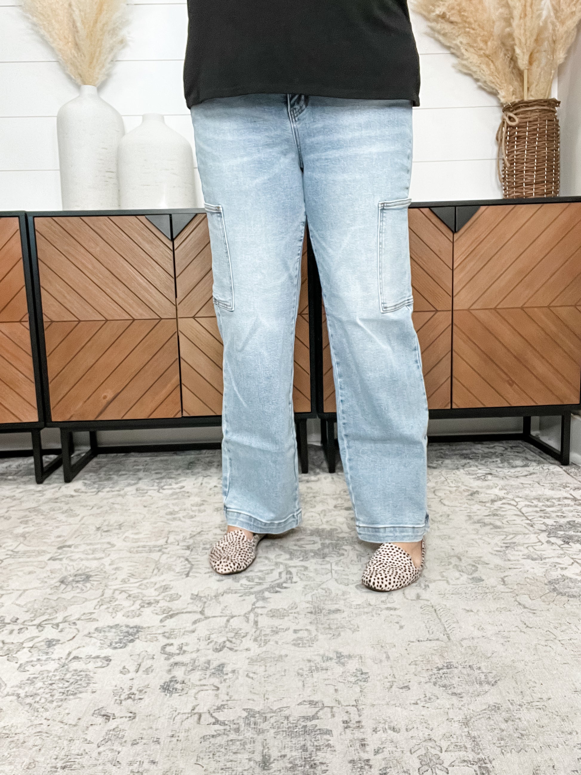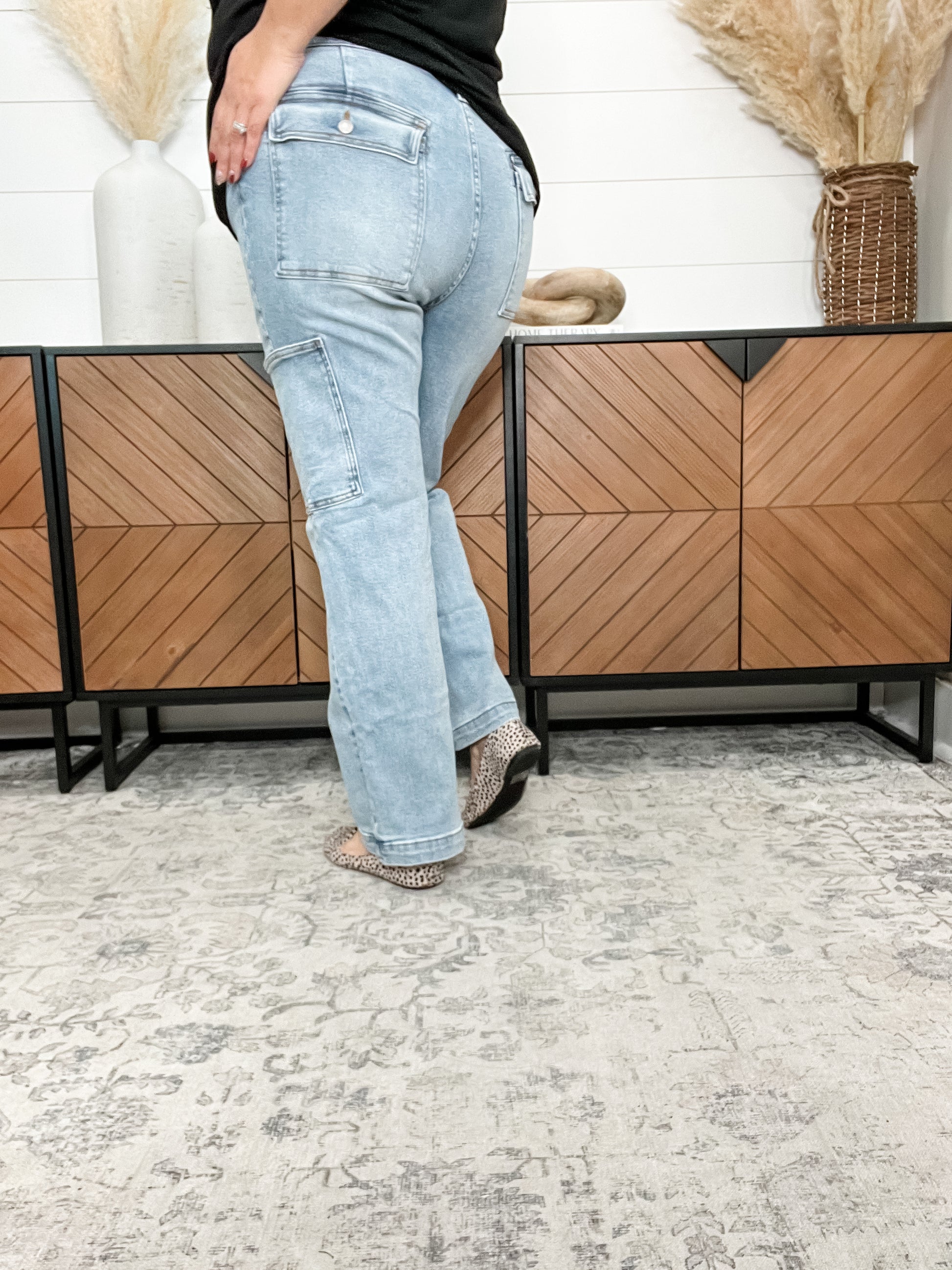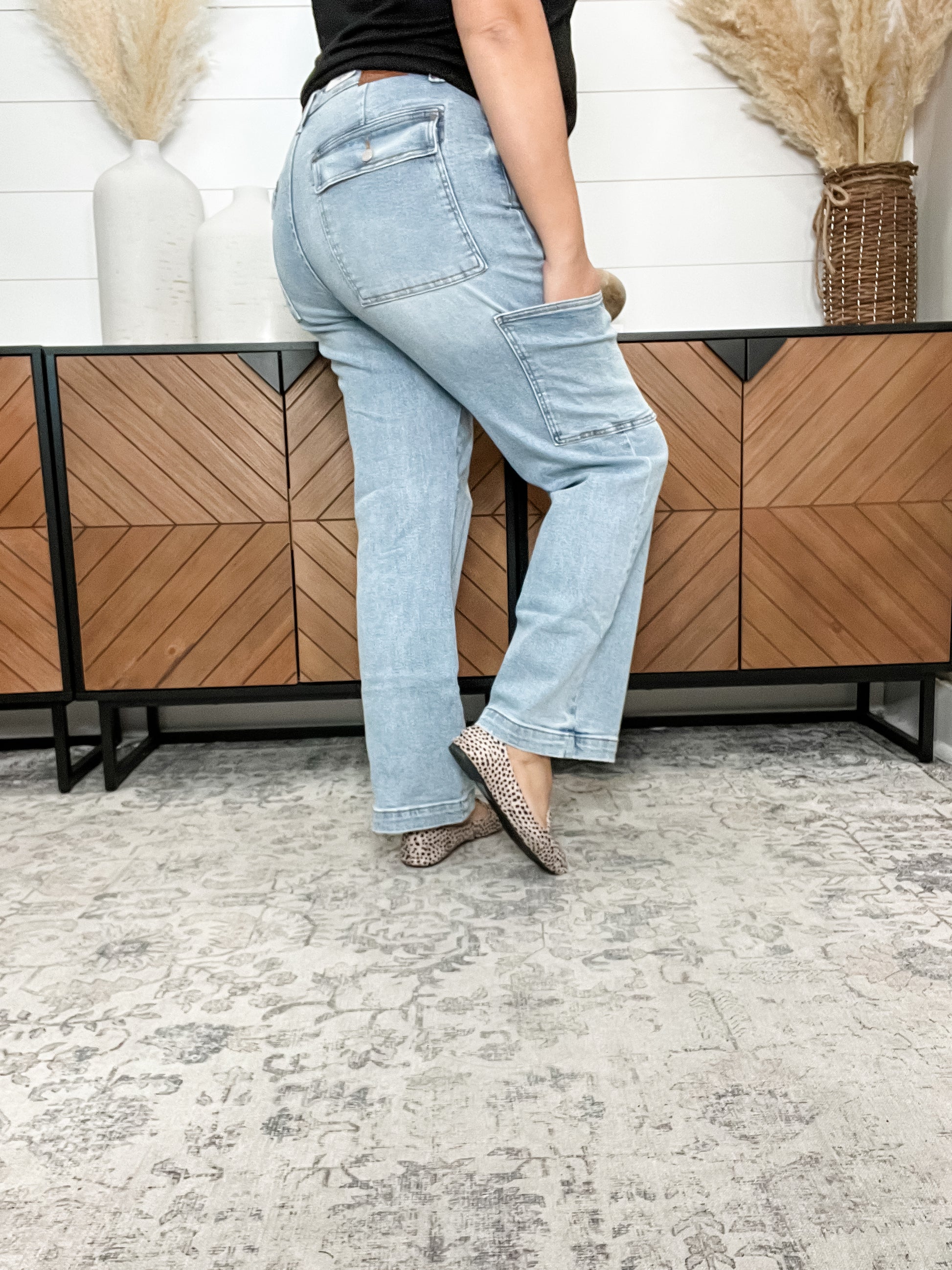 Get ready to turn heads in the Judy Blue "Slight of Hand" Cargo Wide Leg jeans! With a playful button pocket and a light wash that vibes with every outfit, these stretchy cargo jeans bring ultimate comfort and unmatched style. Perfect for keeping your essentials handy while feeling fabulous all day long!