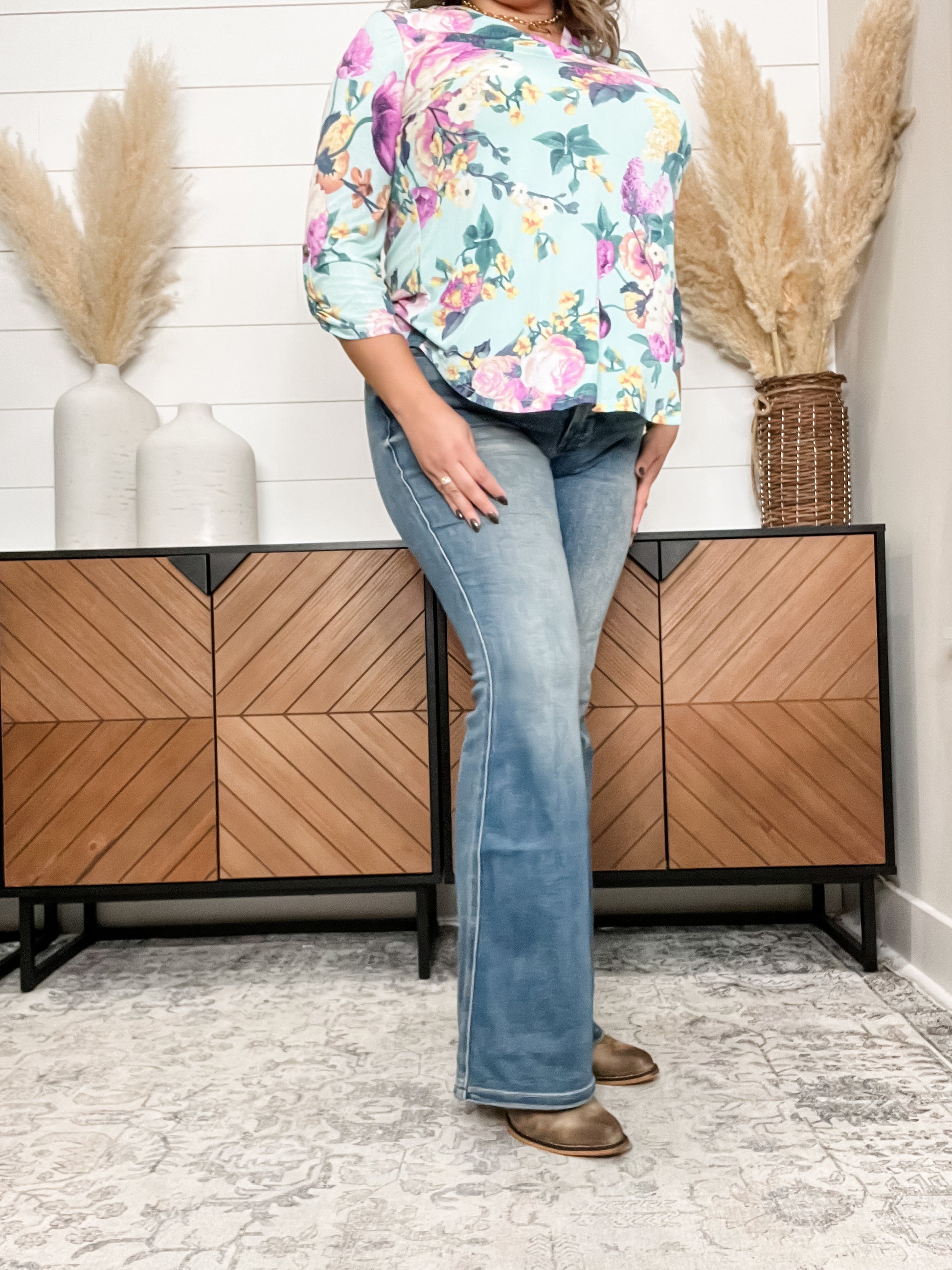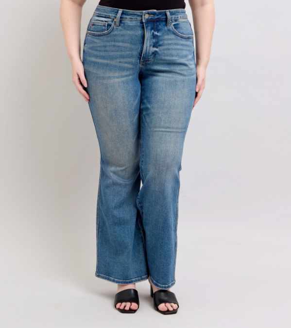 Step into style with the Judy Blue Stanley Tummy Control flare jeans! Crafted from lightweight denim in a flattering medium wash blue, these jeans offer tummy control for a smooth, confident fit. The non-distressed finish keeps your look fresh and versatile. True to size, they’re perfect for those who love a playful twist on classic flare. Shield pockets with the round look give the illusion of booty lifting.