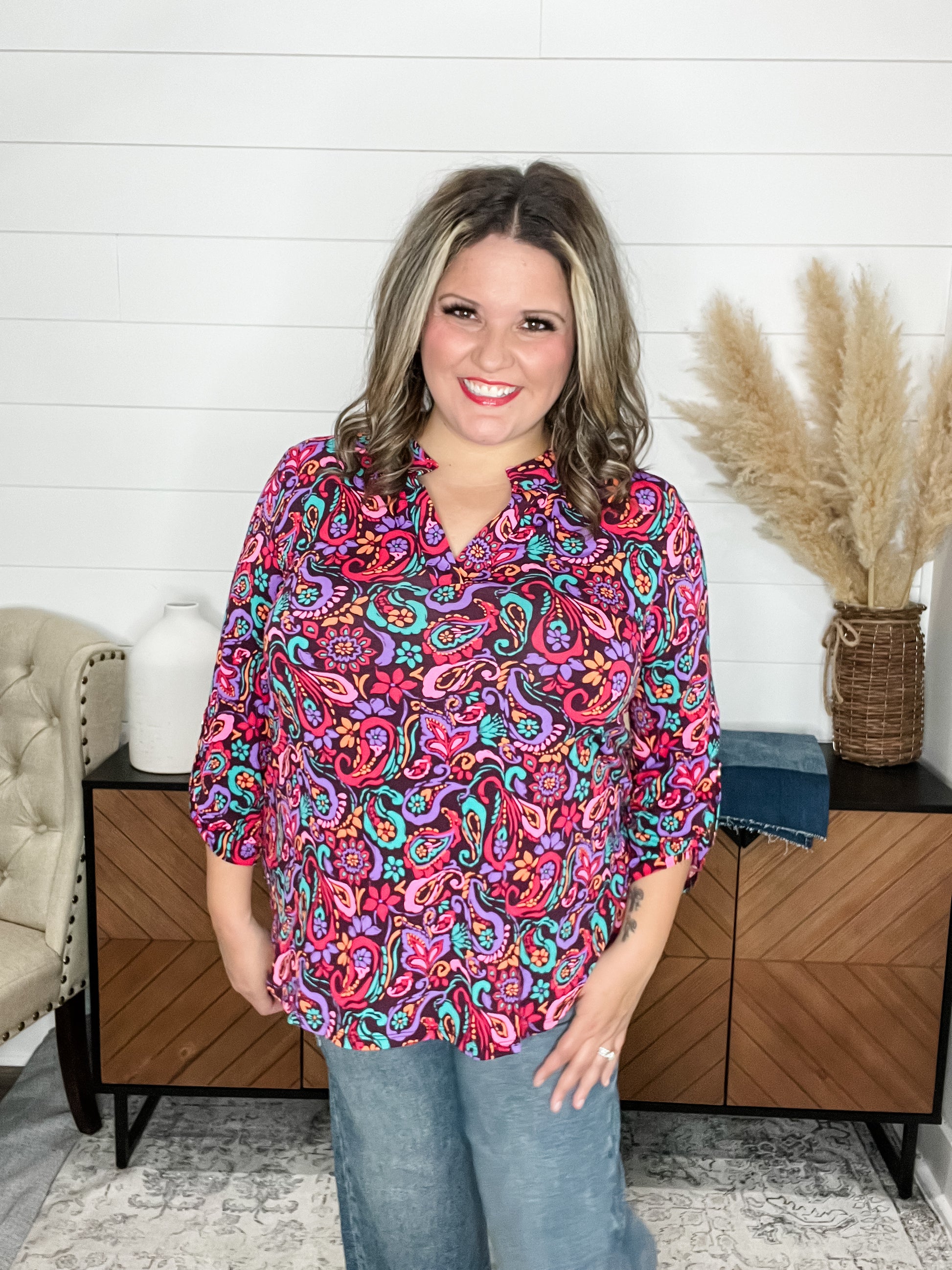 Slip into the "Kingfisher" 3/4 Sleeve Split Neck for a playful twist on your everyday look. Crafted from a slinky, stretchy fabric with a dark wine base, it hugs your curves comfortably—just remember to size down one for the perfect fit. This top’s easy stretch and flattering neckline make it a go-to for effortless style with a touch of sass.