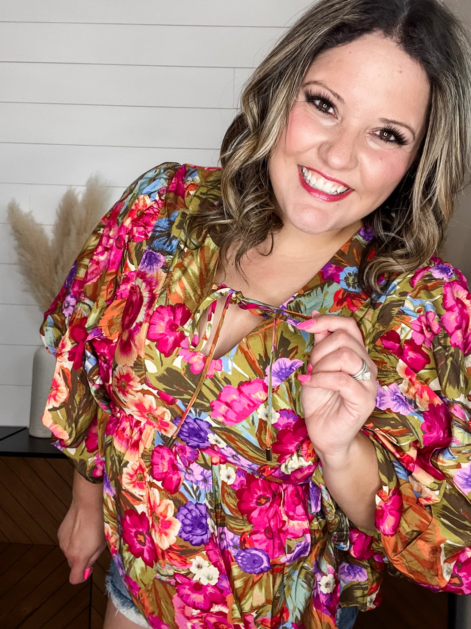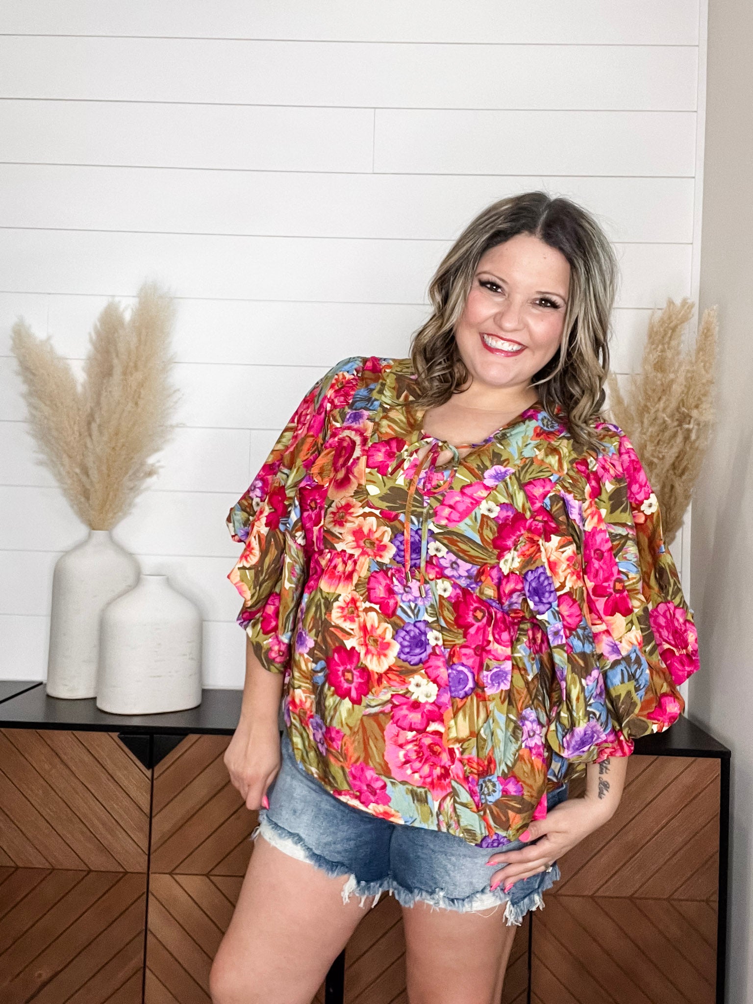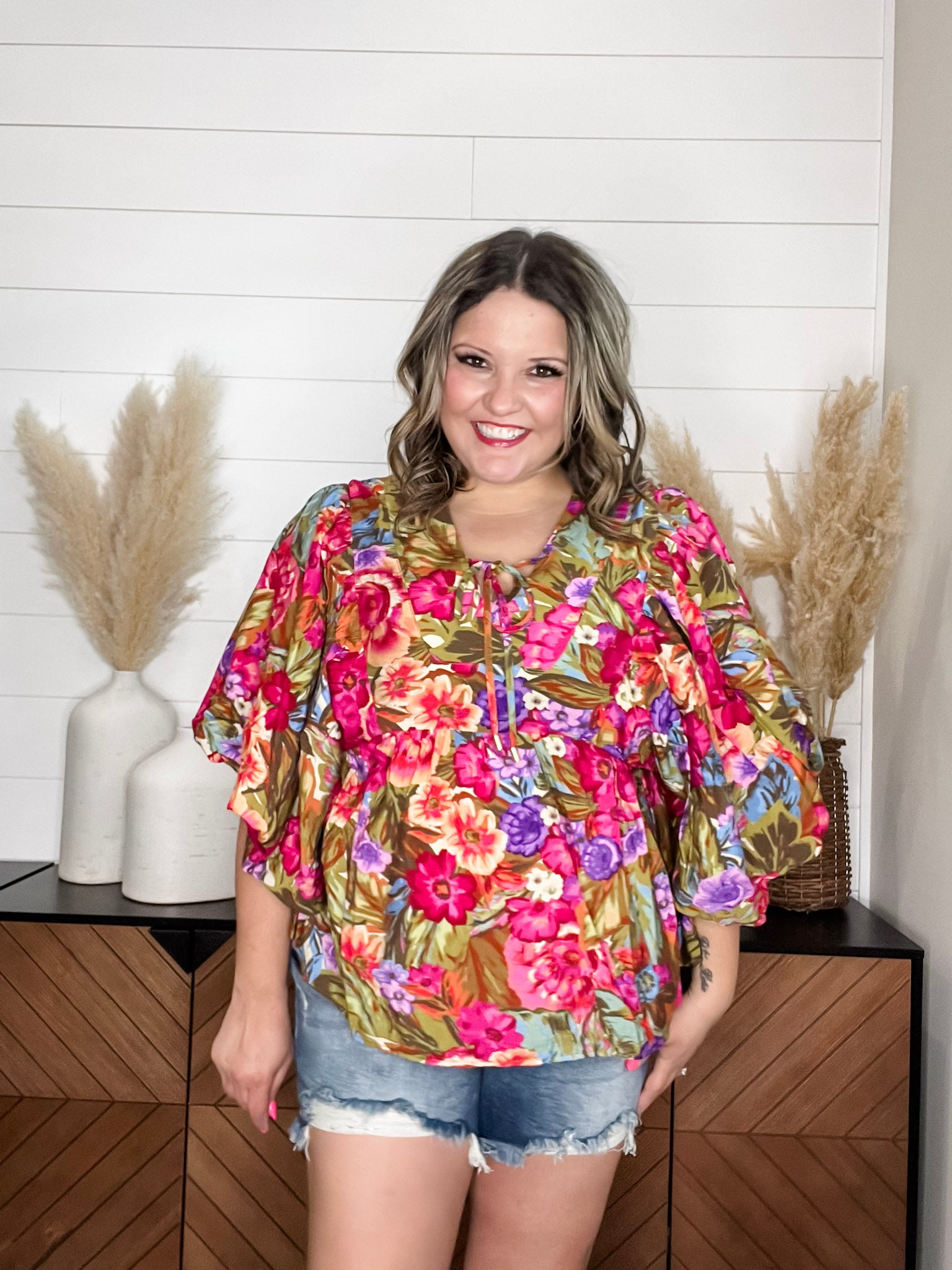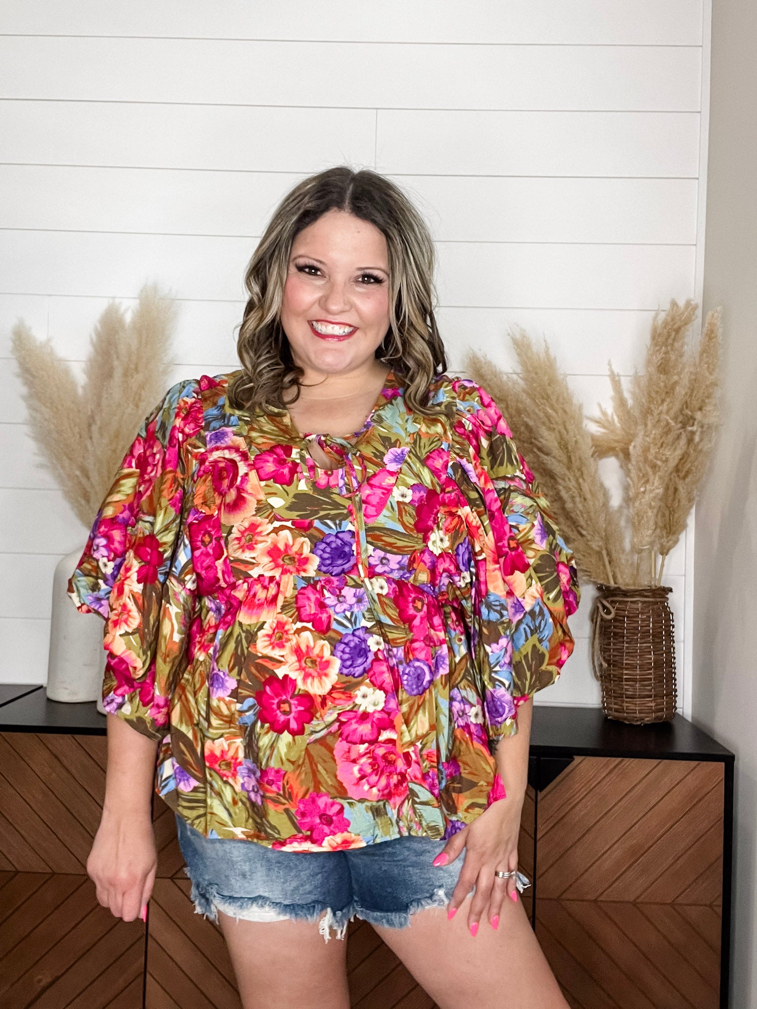 The "Koda" blouse features stunning wide bubble sleeves and a front tie neckline for a modern twist. The bold floral pattern and boxy, roomy fit make it a gorgeous statement piece for any occasion. Elevate your wardrobe with this larger than life top.