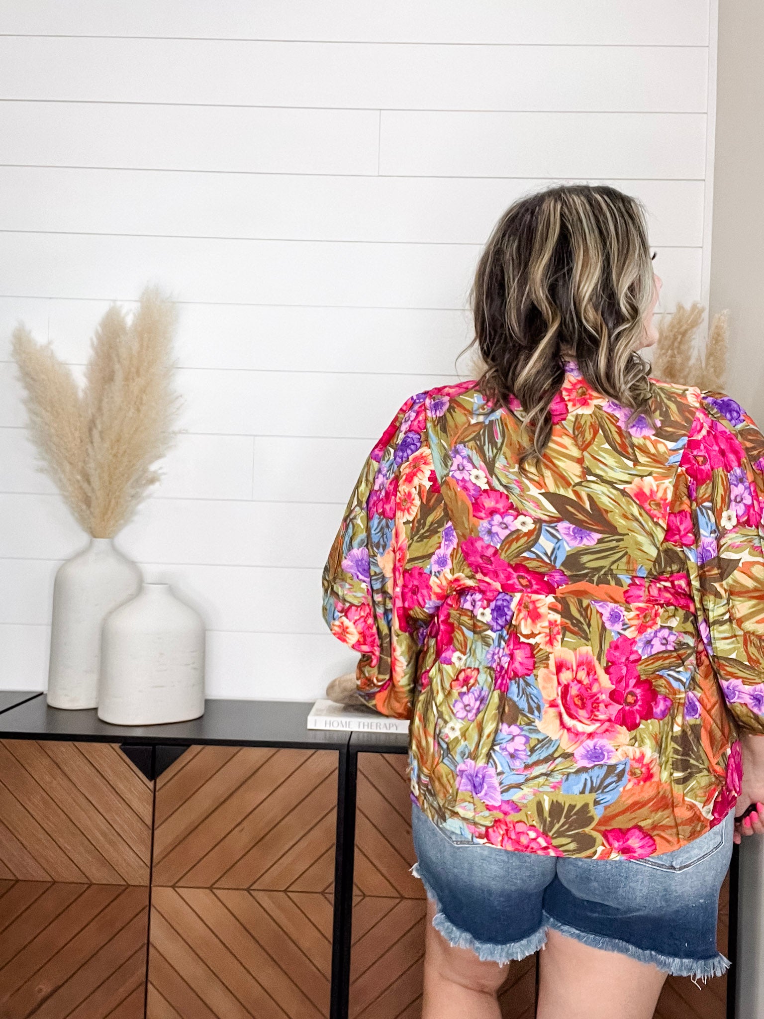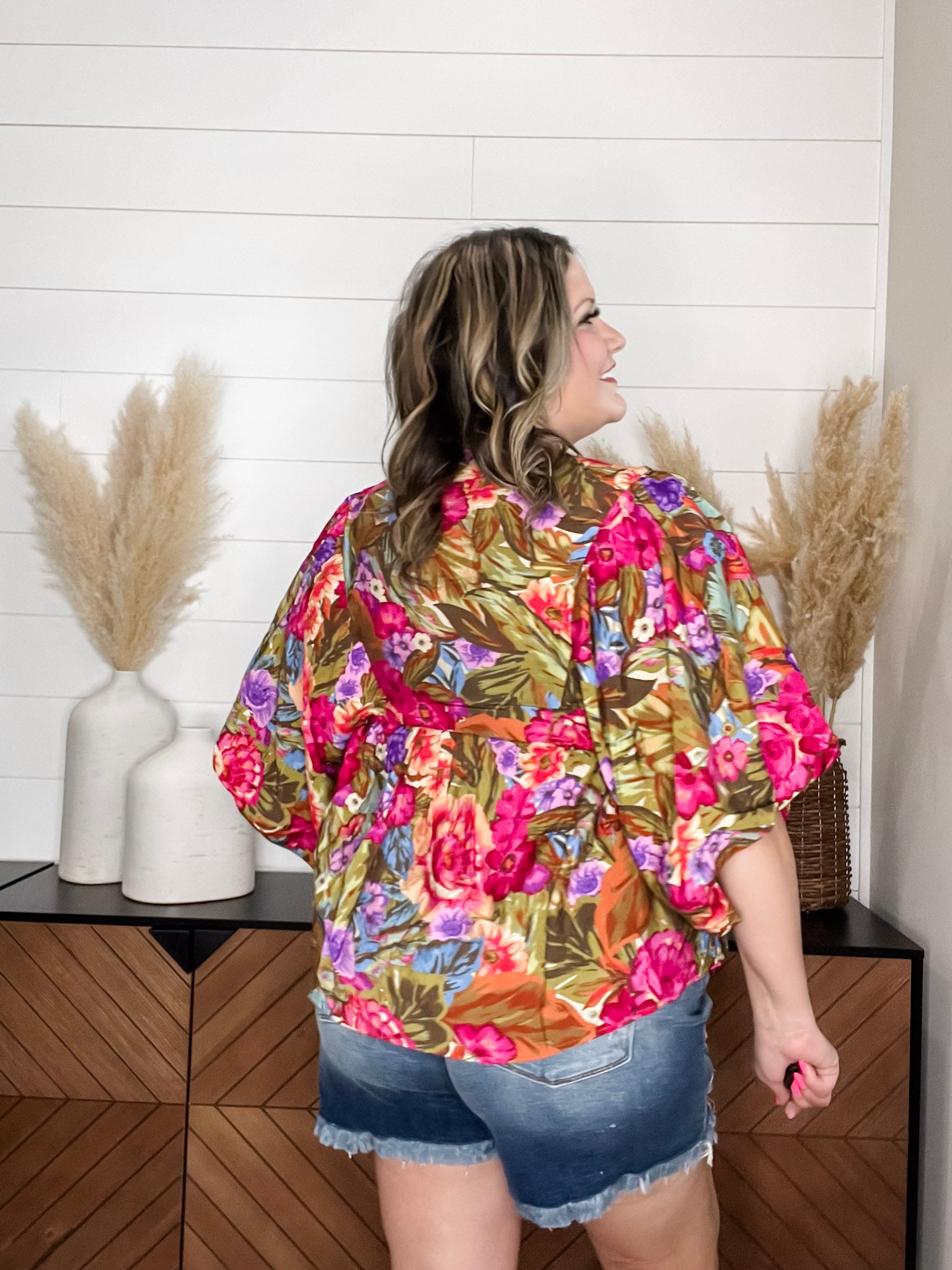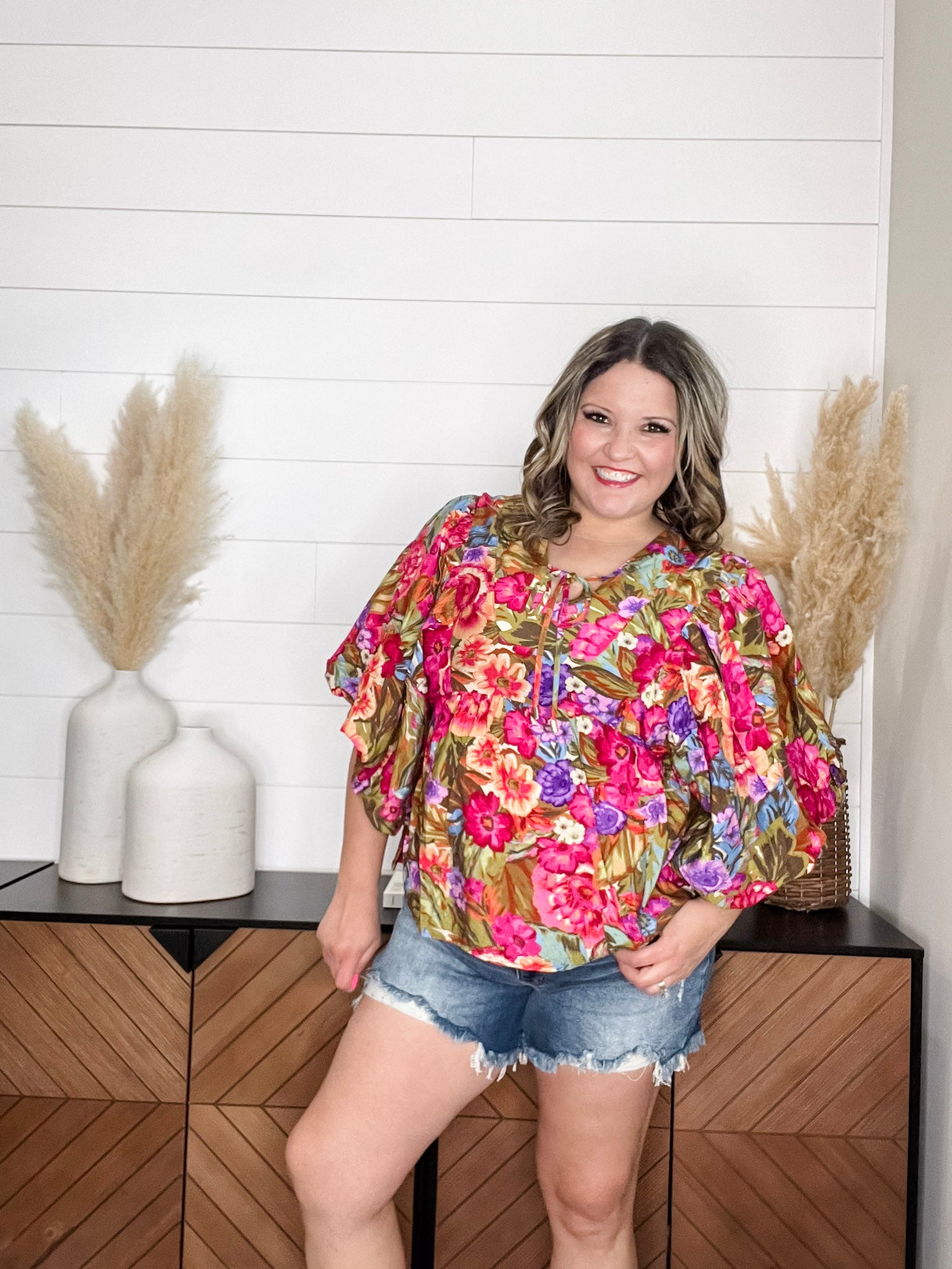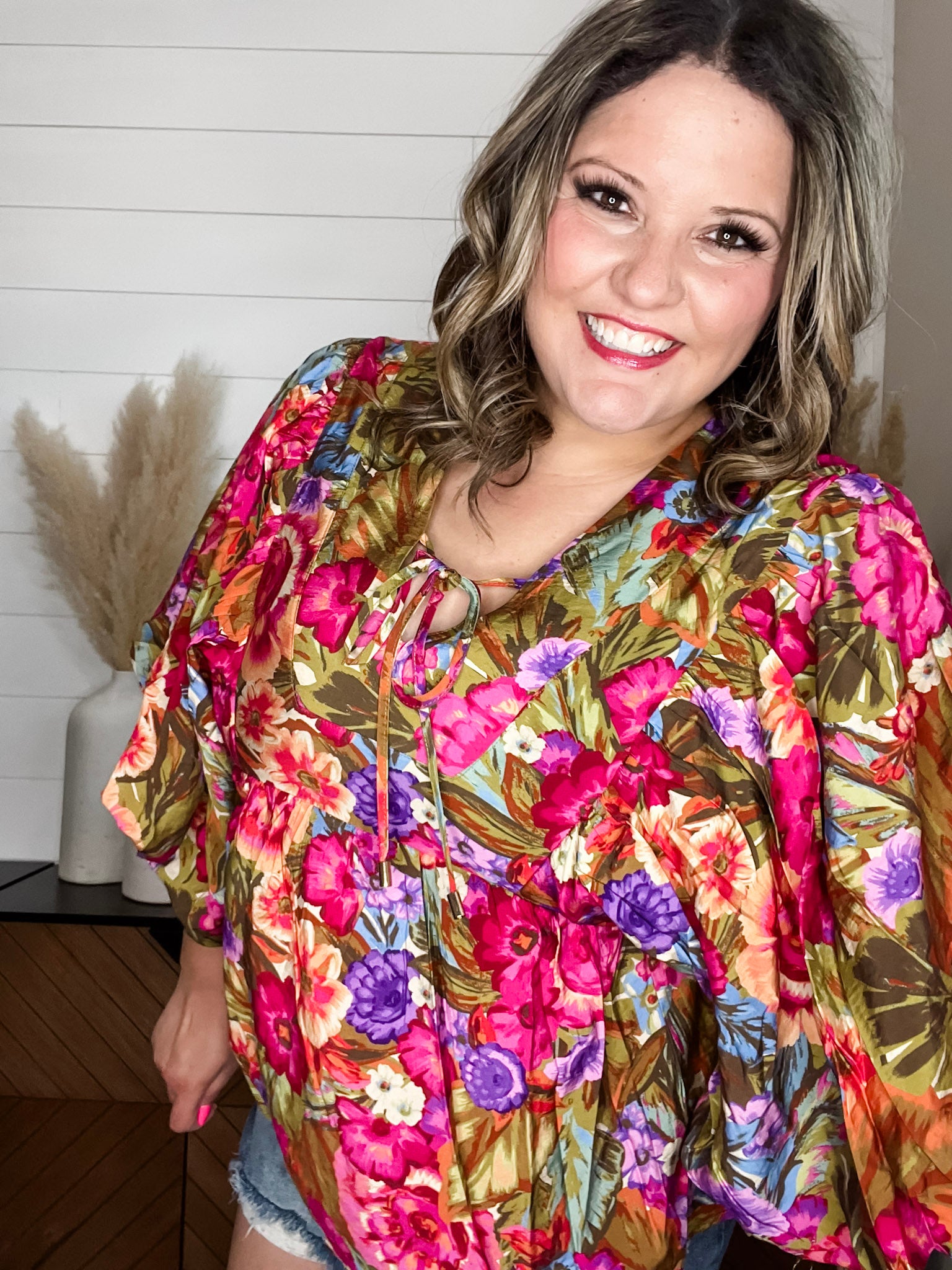 The "Koda" blouse features stunning wide bubble sleeves and a front tie neckline for a modern twist. The bold floral pattern and boxy, roomy fit make it a gorgeous statement piece for any occasion. Elevate your wardrobe with this larger than life top.