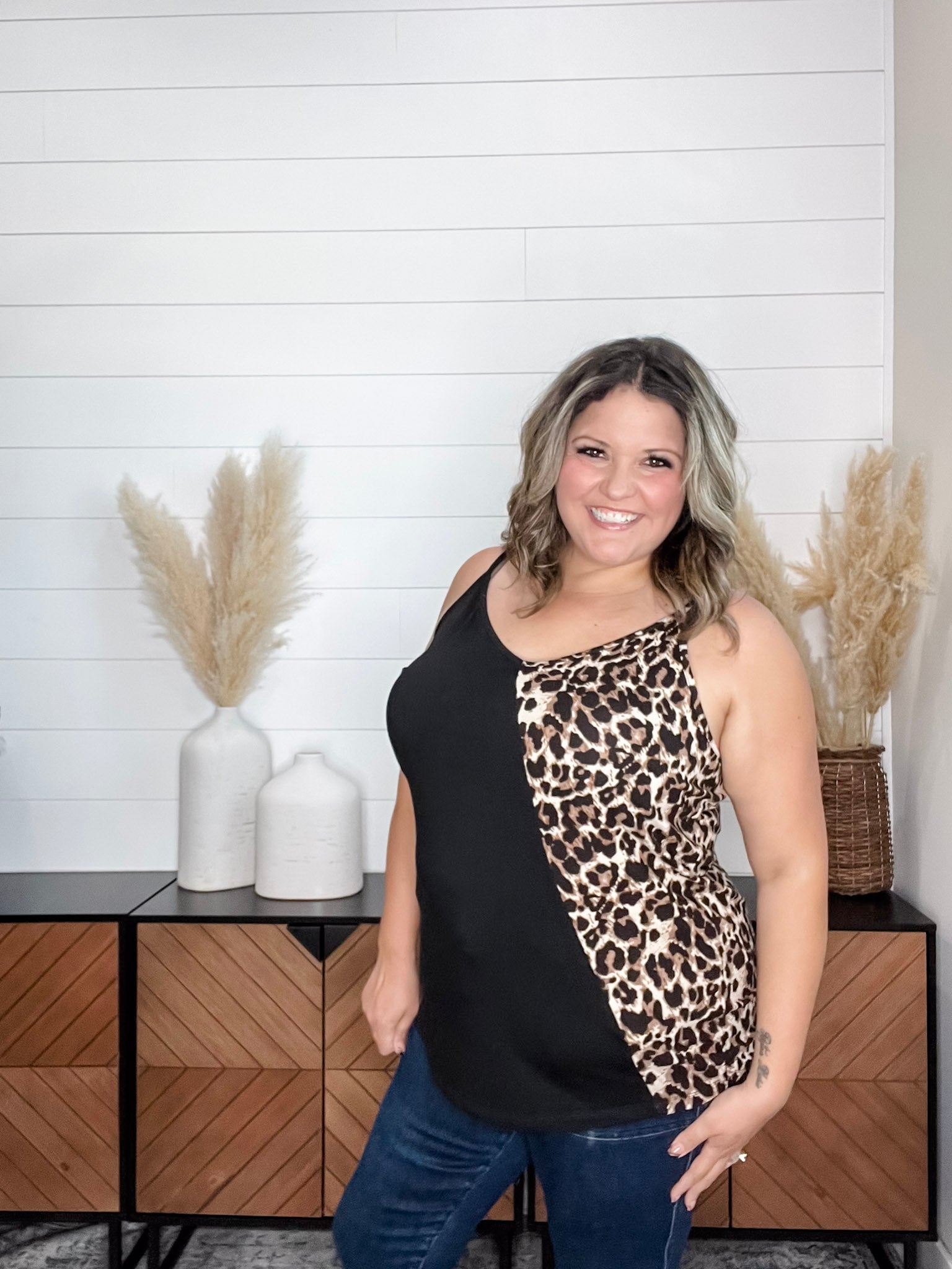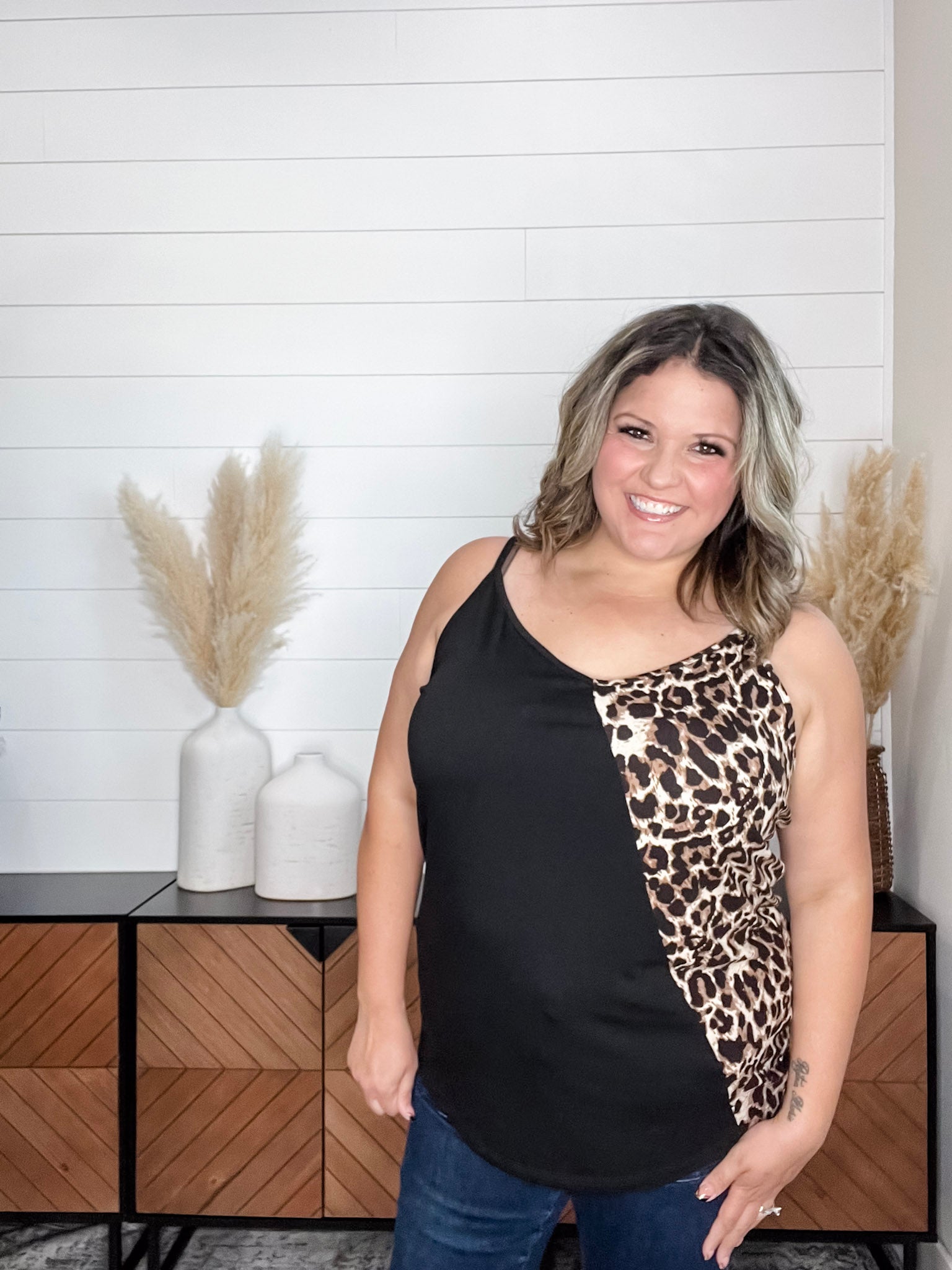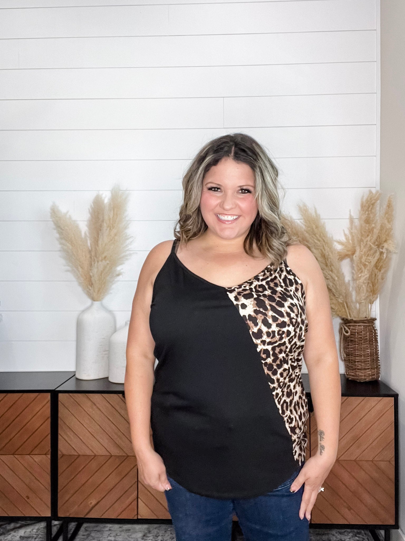 Expertly crafted with a buttery soft material, the "Kylin" Colorblock Spaghetti Strap Tank Tops provide comfort and style. Featuring a trendy animal print design, this top is perfect for any occasion. Size down for a flattering fit.