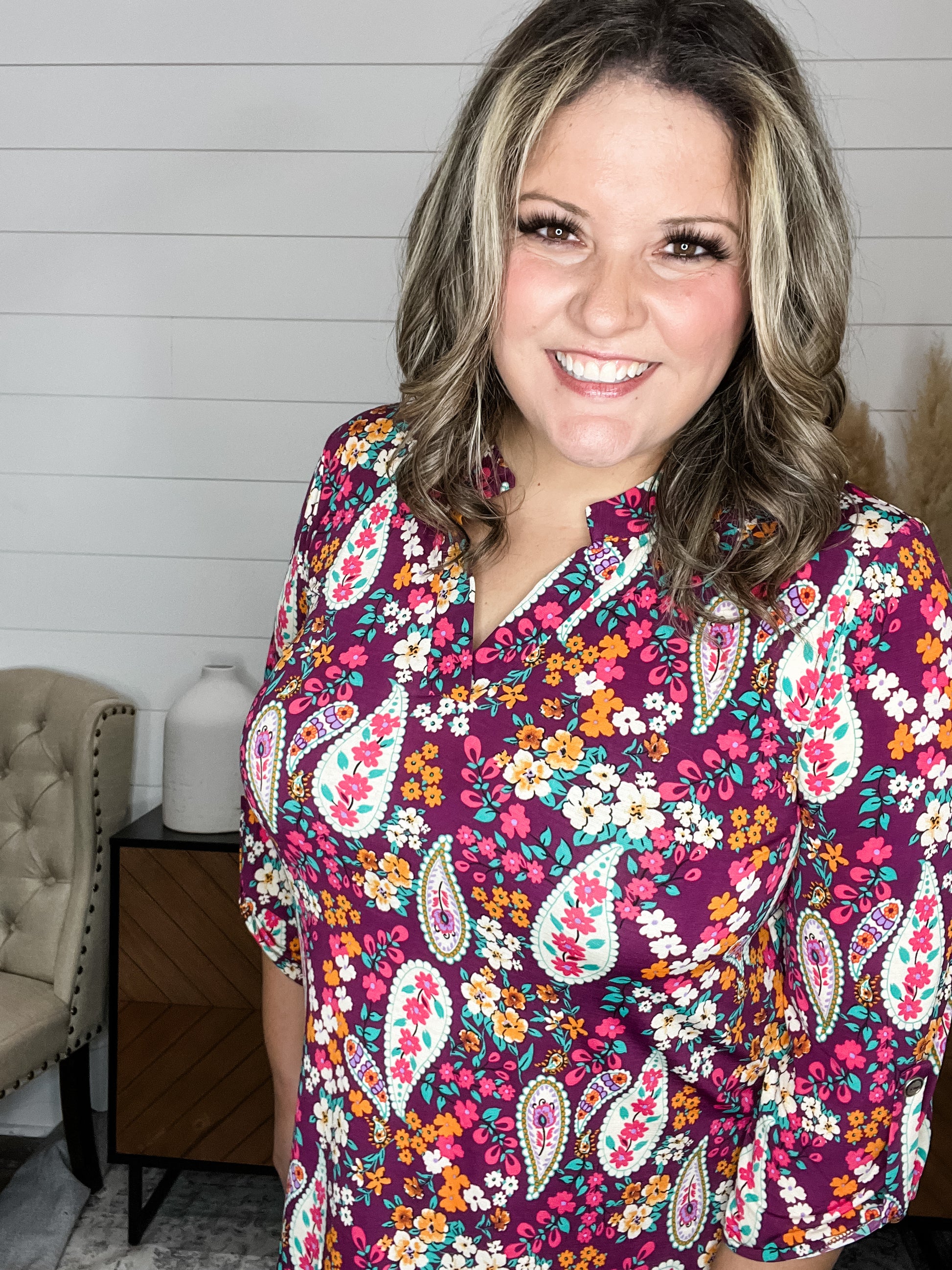 Experience effortless style with the "Marian" 3/4 Sleeve Split Neck top, featuring a wine-based floral pattern that adds a touch of charm to any outfit. Its slinky, stretchy fabric hugs your curves comfortably—just size down one for the perfect fit. The playful split neck design keeps things fun and flirty, making this top a versatile choice for day or night.