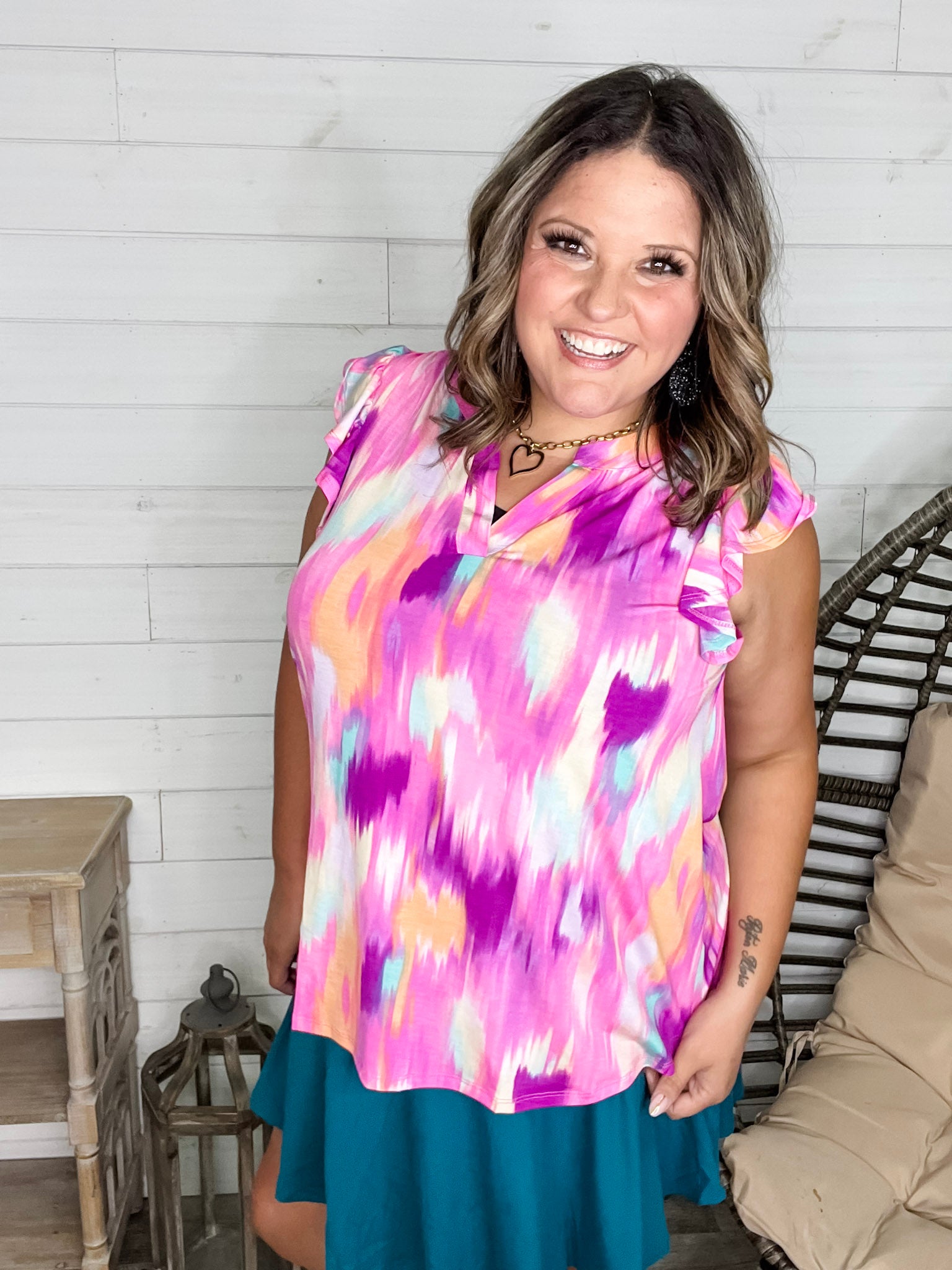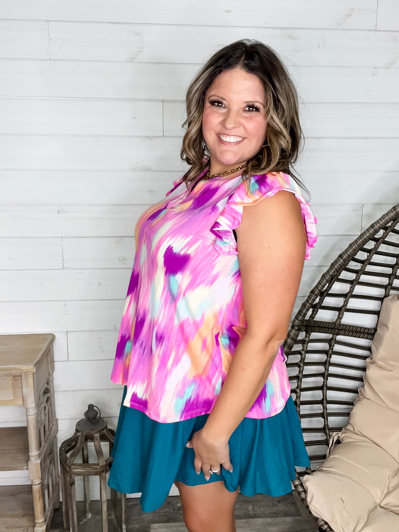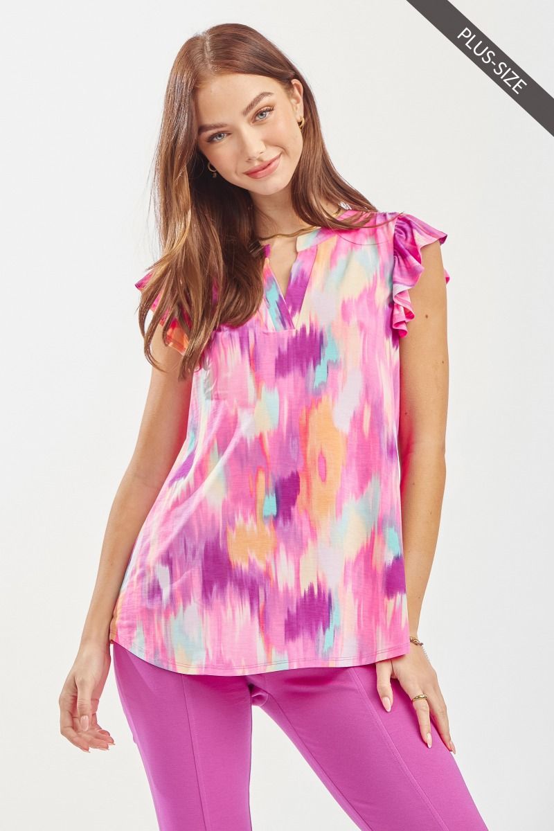 Get ready to turn heads in the "Market" Flutter Sleeve Split Neck top! Its slinky, stretchy fabric hugs you just right, while bold colors add a pop of fun to your look. True to size and effortlessly playful, this top brings a fresh vibe to your wardrobe.