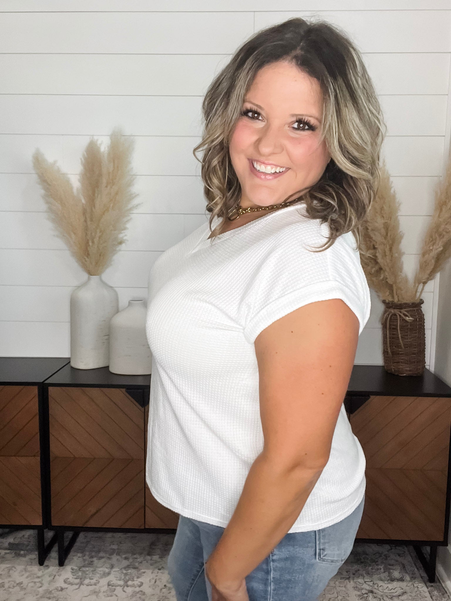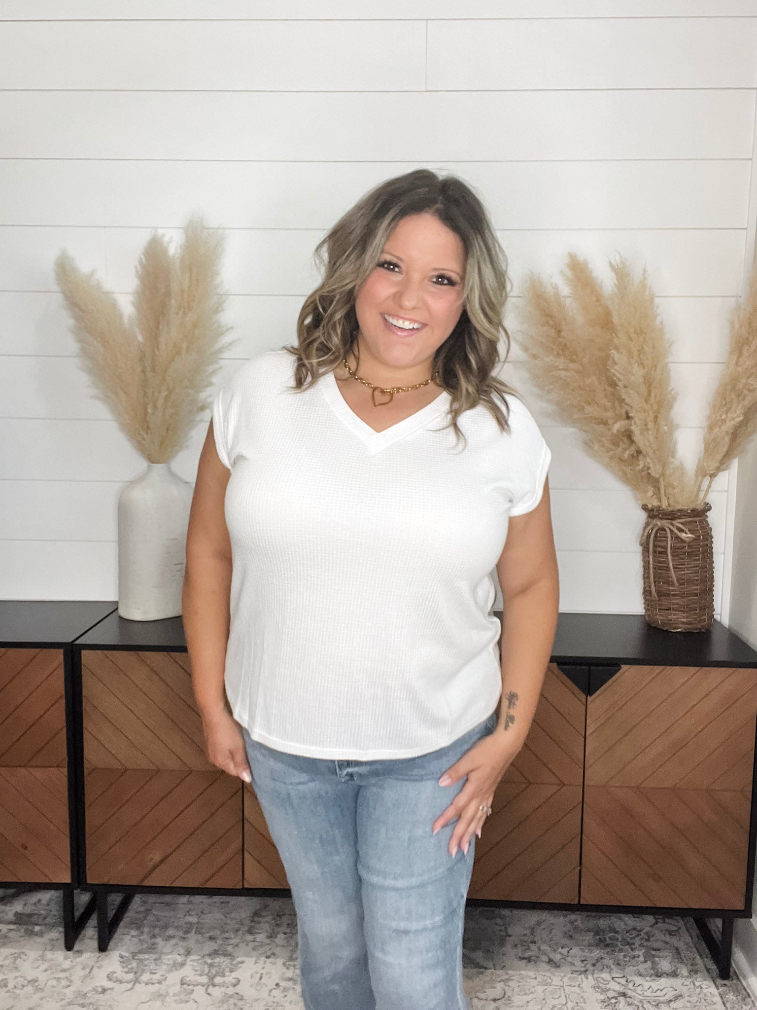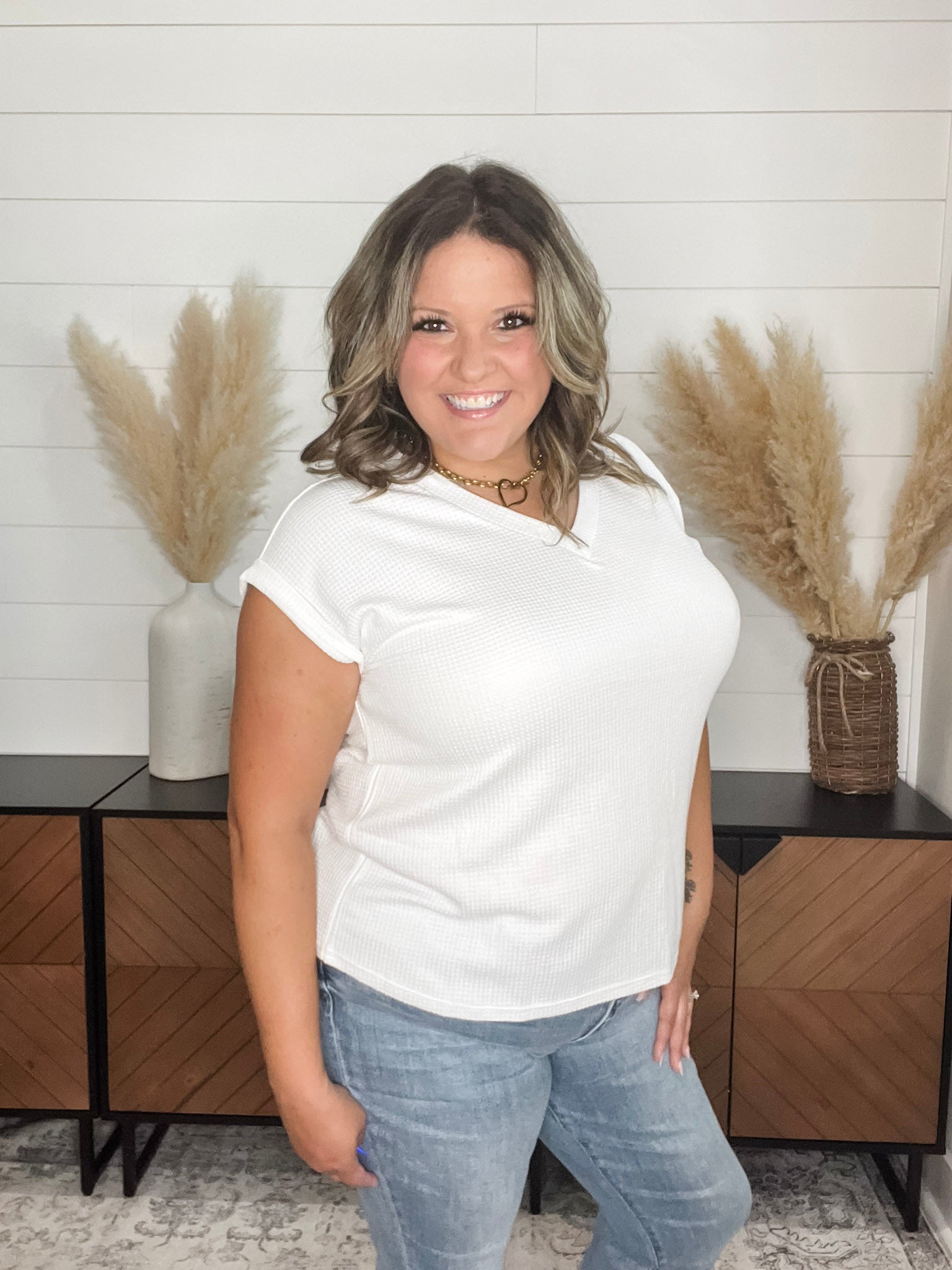 This playful "Mathematics" waffle texture V-neck short sleeve top in ivory features charming cuffed sleeves and a cozy waffle knit. Its solid color and true-to-size fit make it an easy favorite for casual days with a touch of fun.