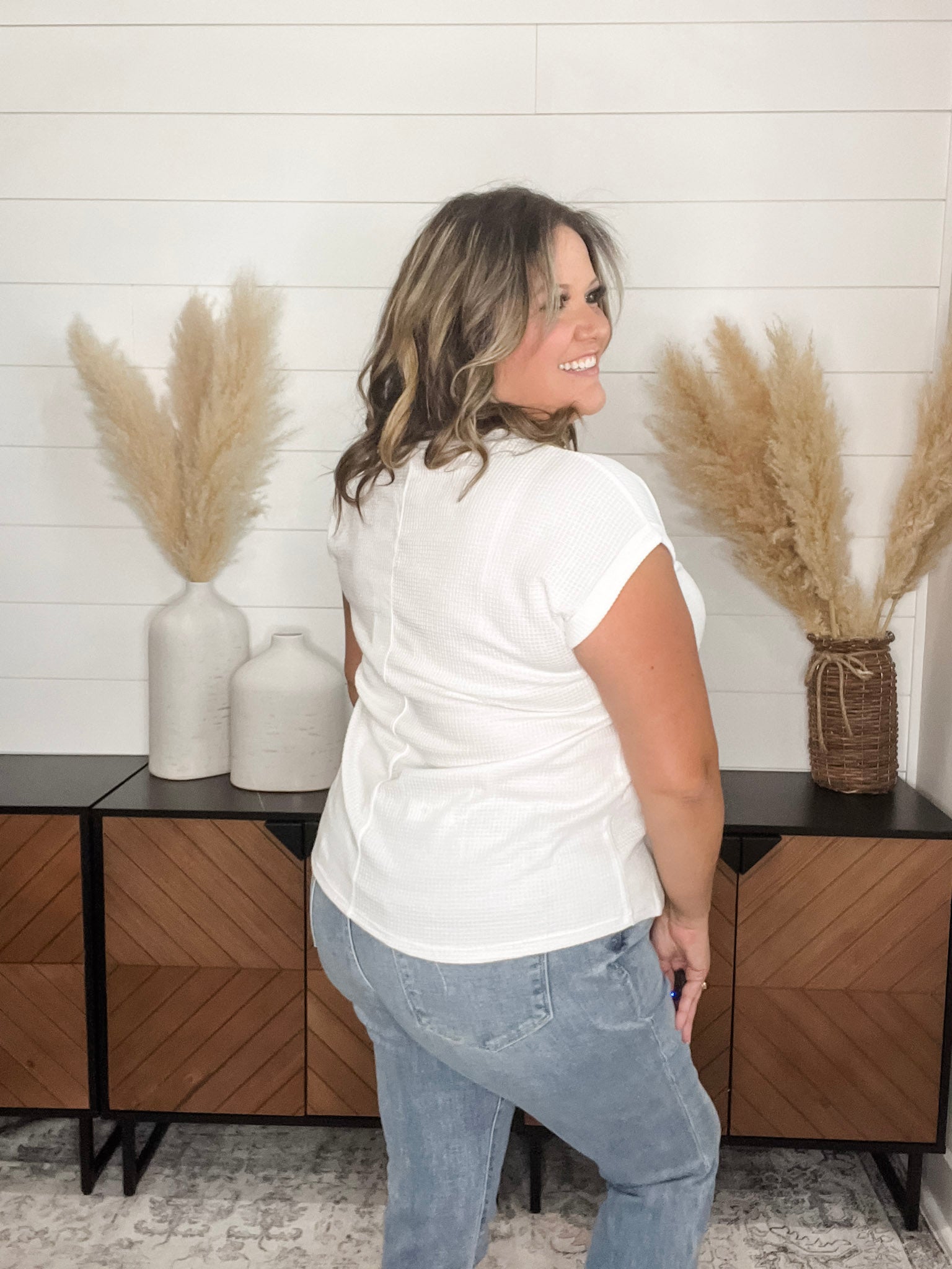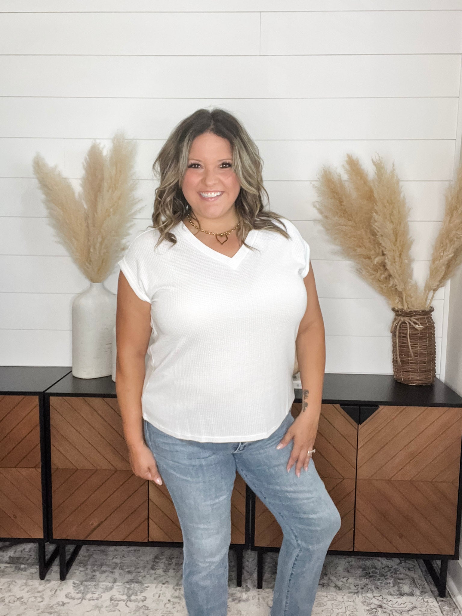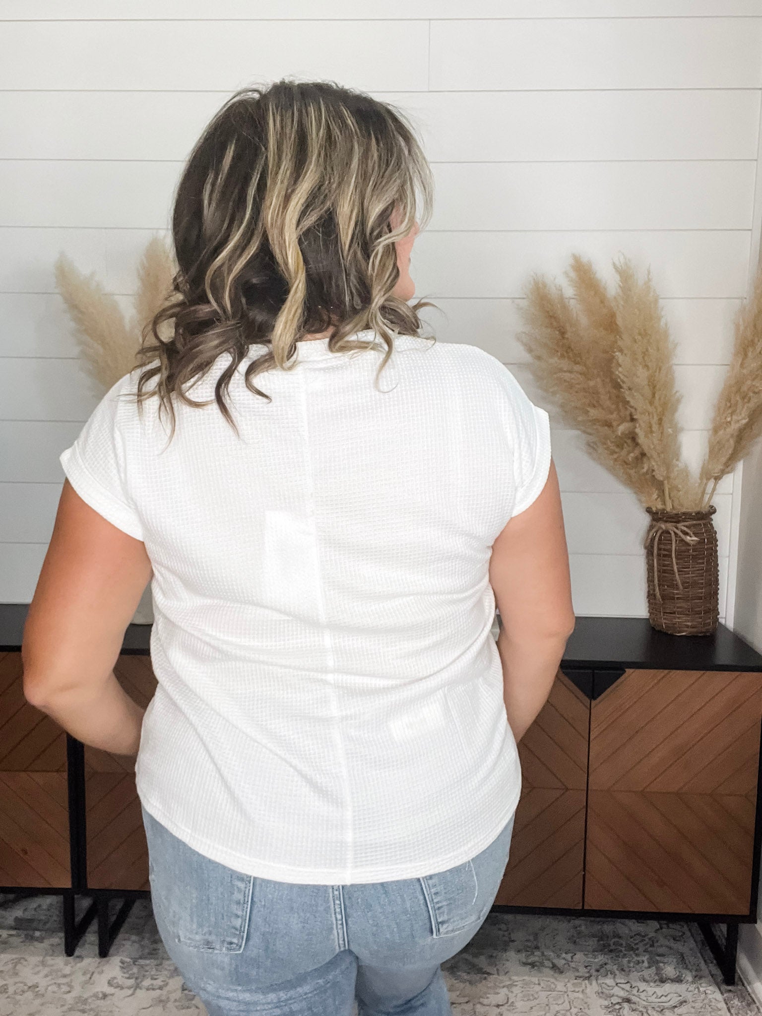 This playful "Mathematics" waffle texture V-neck short sleeve top in ivory features charming cuffed sleeves and a cozy waffle knit. Its solid color and true-to-size fit make it an easy favorite for casual days with a touch of fun.