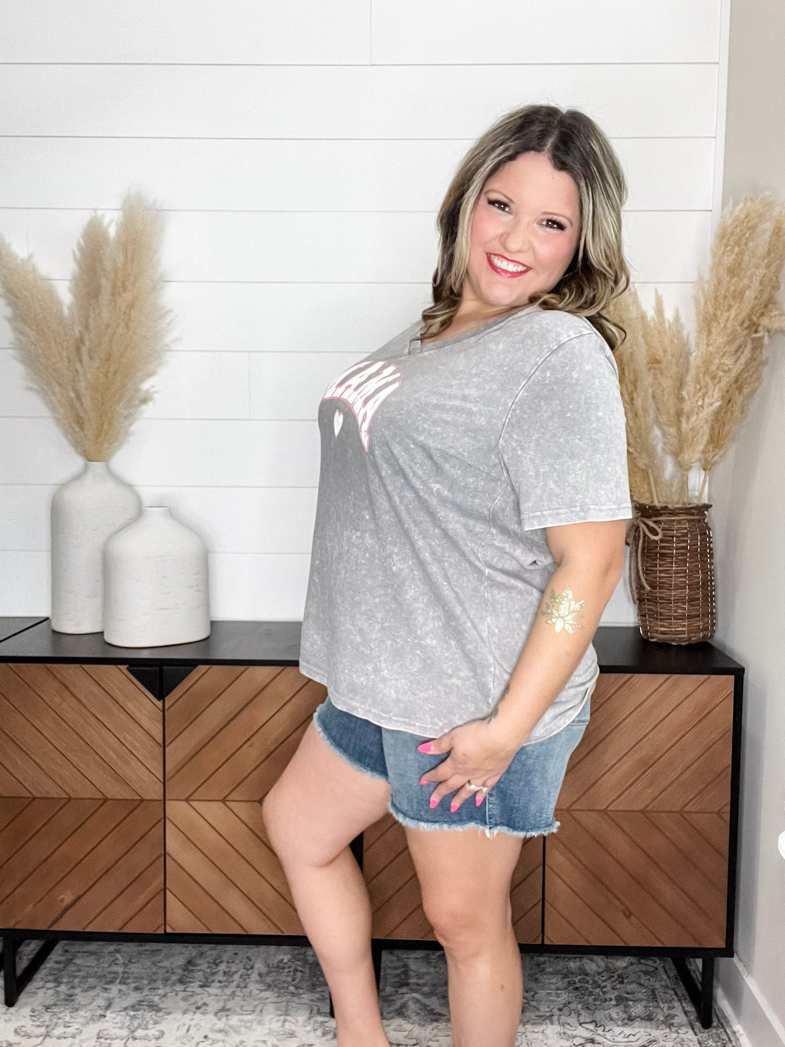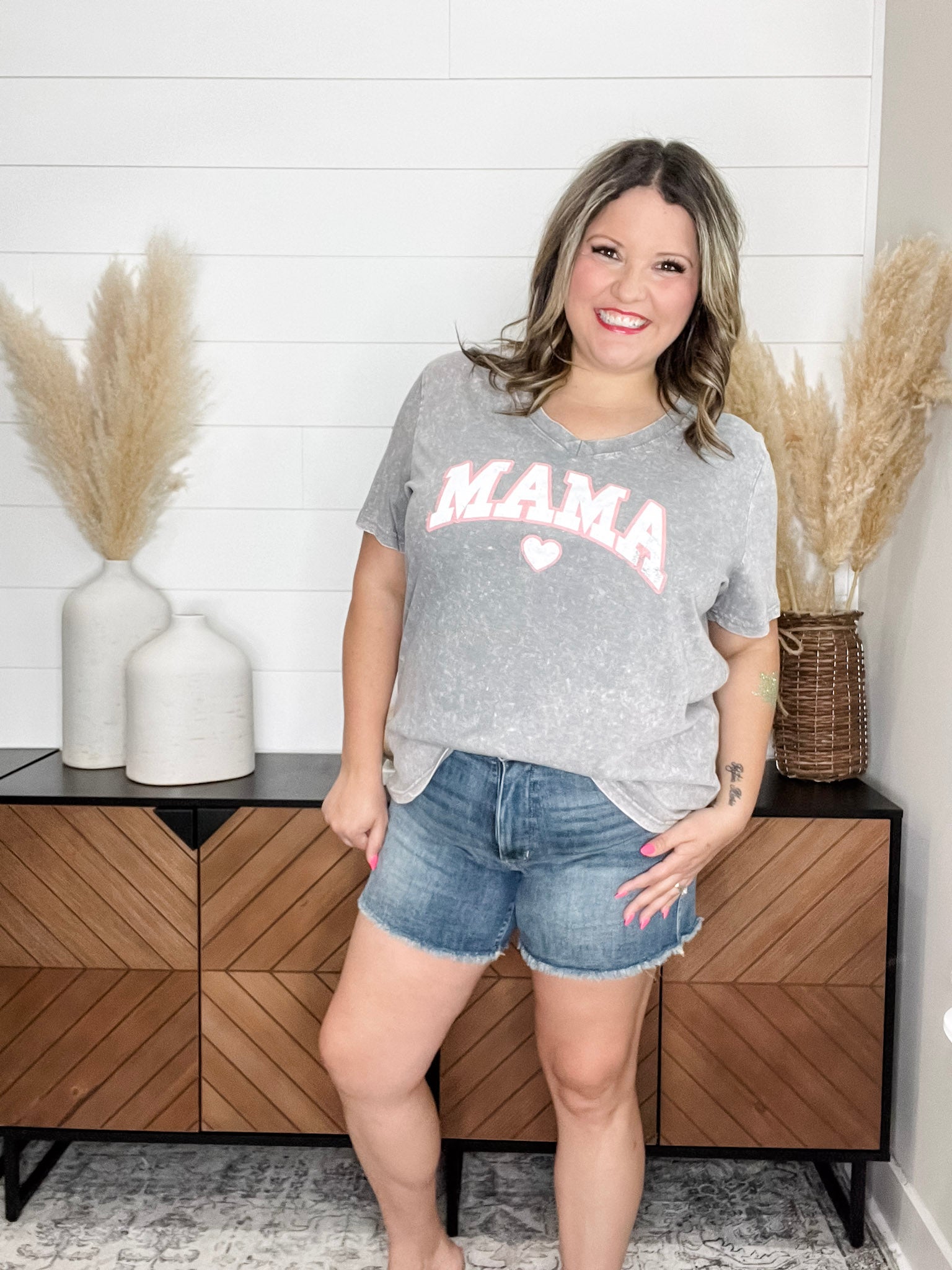 Experience ultimate comfort and style with our Mineral Wash "Mama" Graphic V Neck Tee. Crafted with soft material and a roomy boxy fit, this tee is perfect for pairing with shorts and a front tuck or your favorite jeans. Plus, with its versatile design, you can size down for a more fitted and boxy look. Upgrade your wardrobe with this must-have piece.