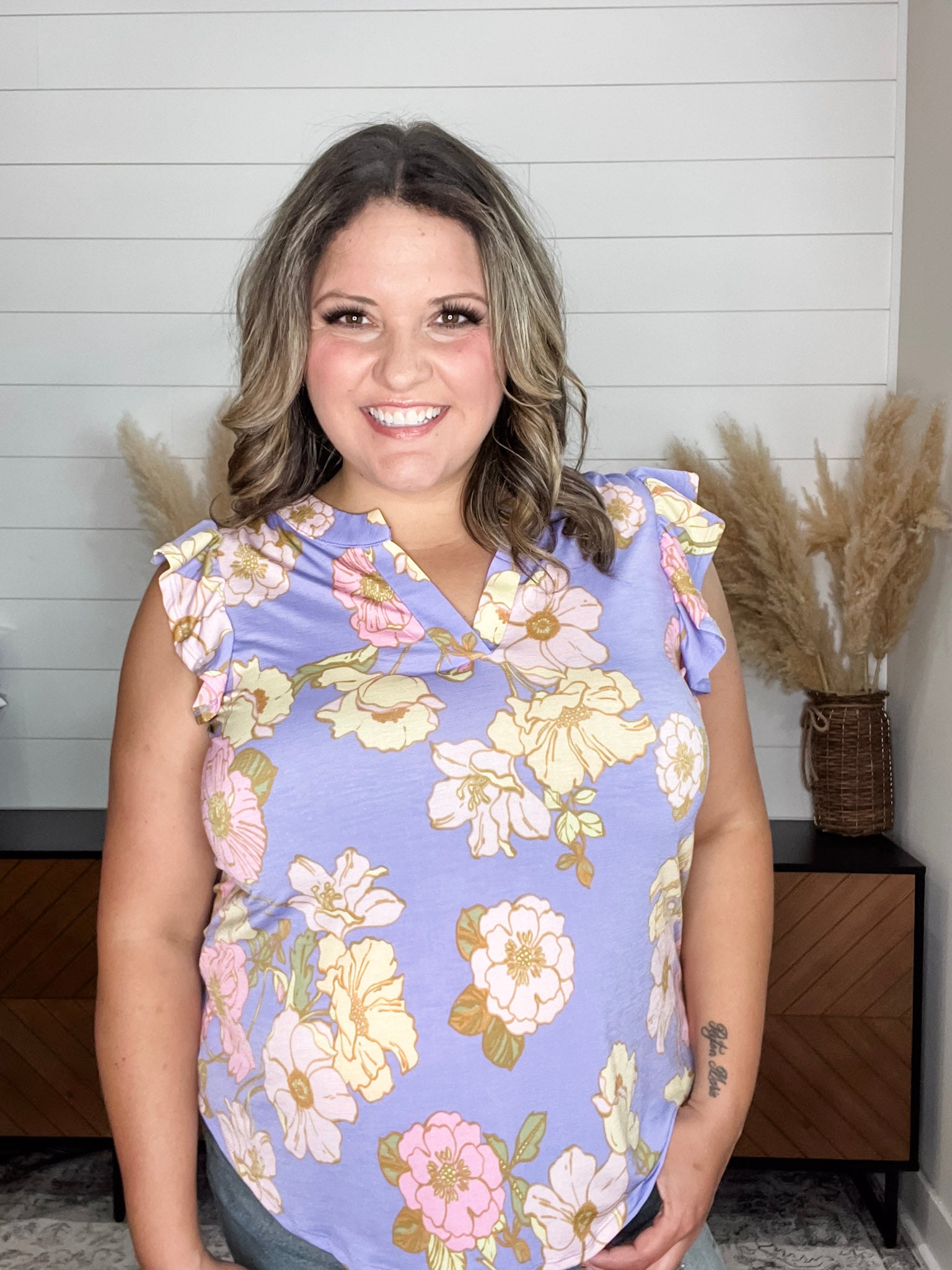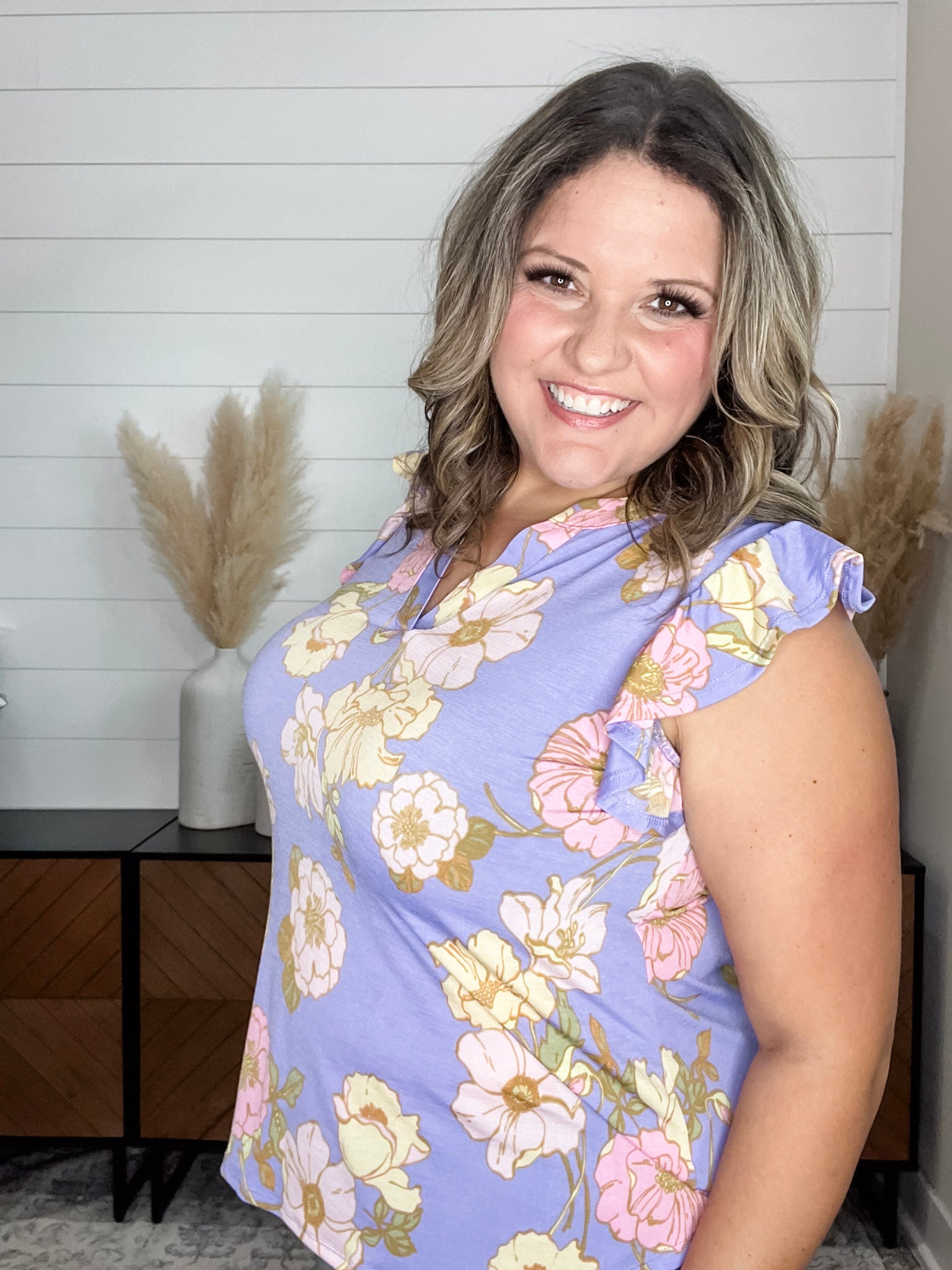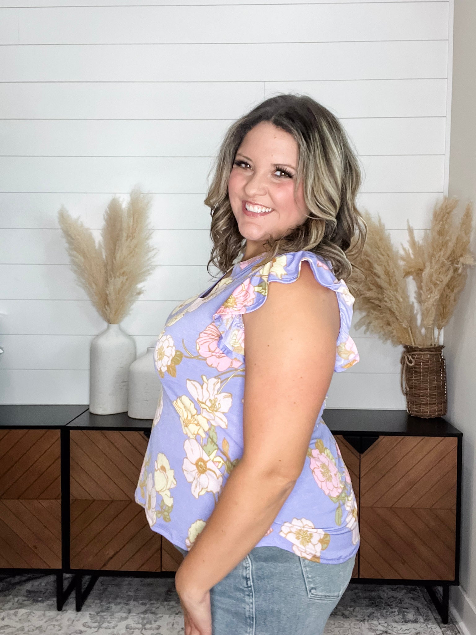 Experience ultimate comfort and style with our "Mood" Ruffle Cap Sleeve Lizzy. Made with slinky stretchy material, this top has a flattering fit that is true to size. The lavender base and delicate floral design add a touch of elegance to any outfit. Get ready to feel confident and chic with this must-have wardrobe essential.