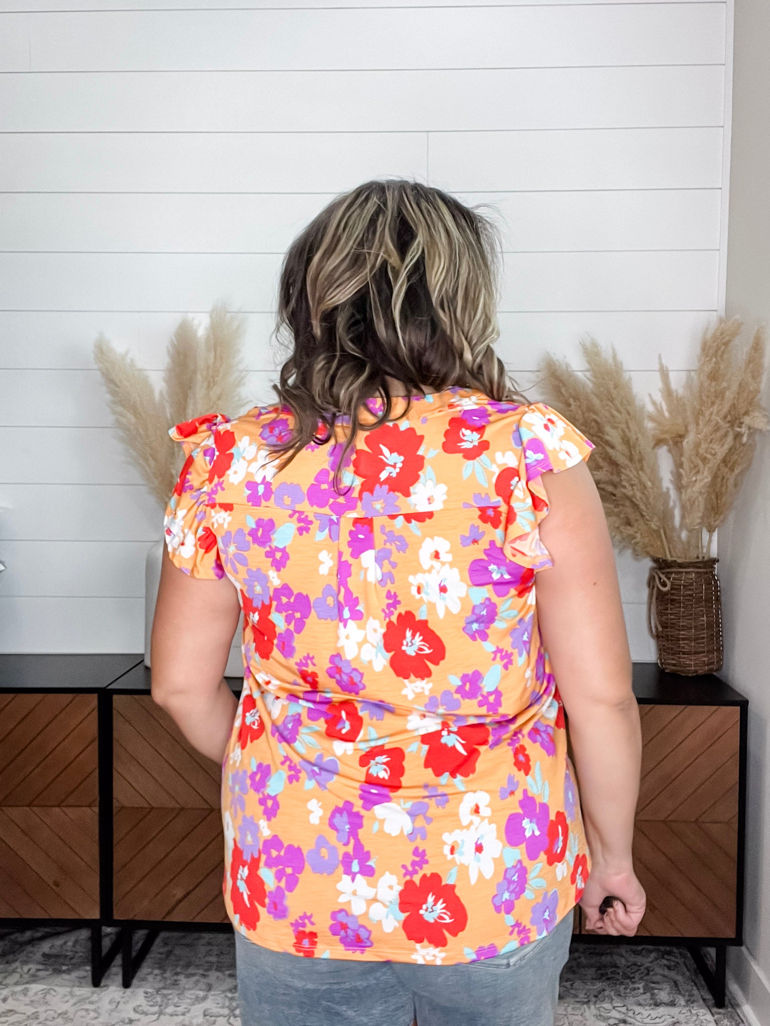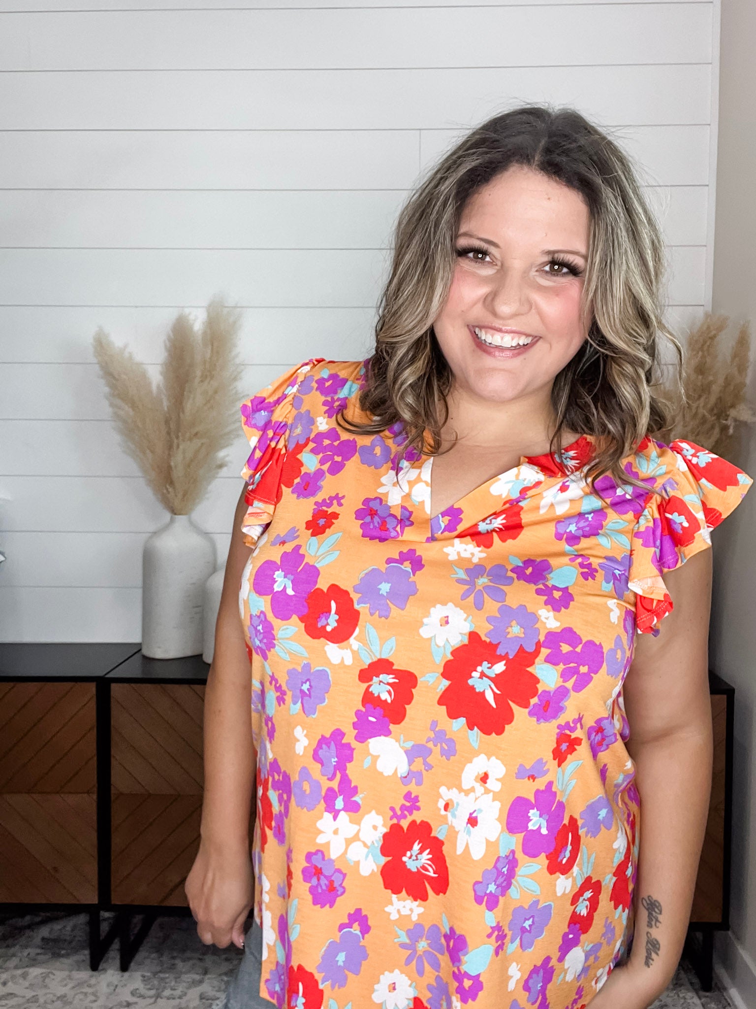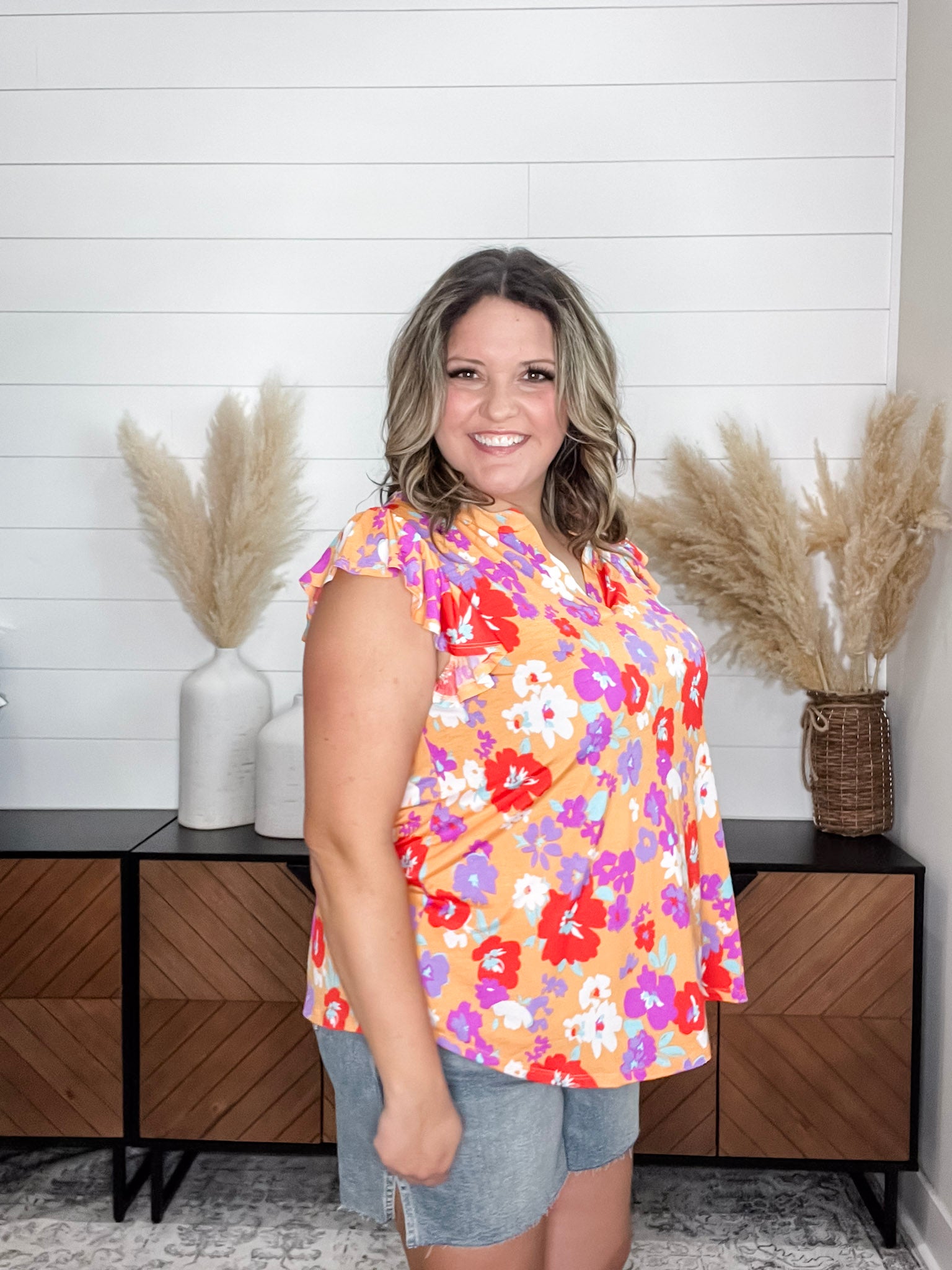 The "Moxley" Ruffle Cap Sleeve Lizzy exudes elegance with its slinky and stretchy fabric, providing a comfortable and true to size fit. The tangerine base and floral design add a pop of color while the large bust-friendly design offers a flattering silhouette. Perfect for any formal occasion.