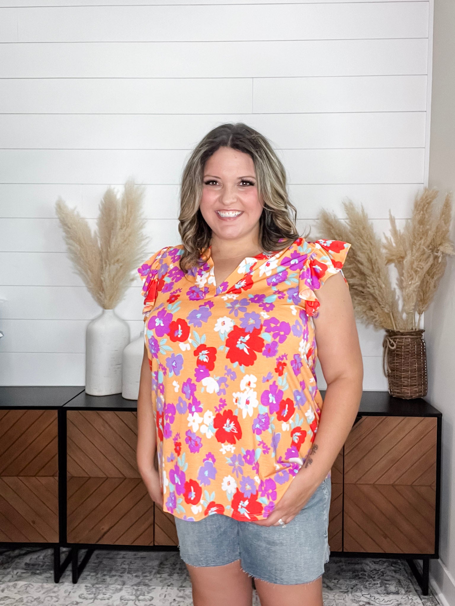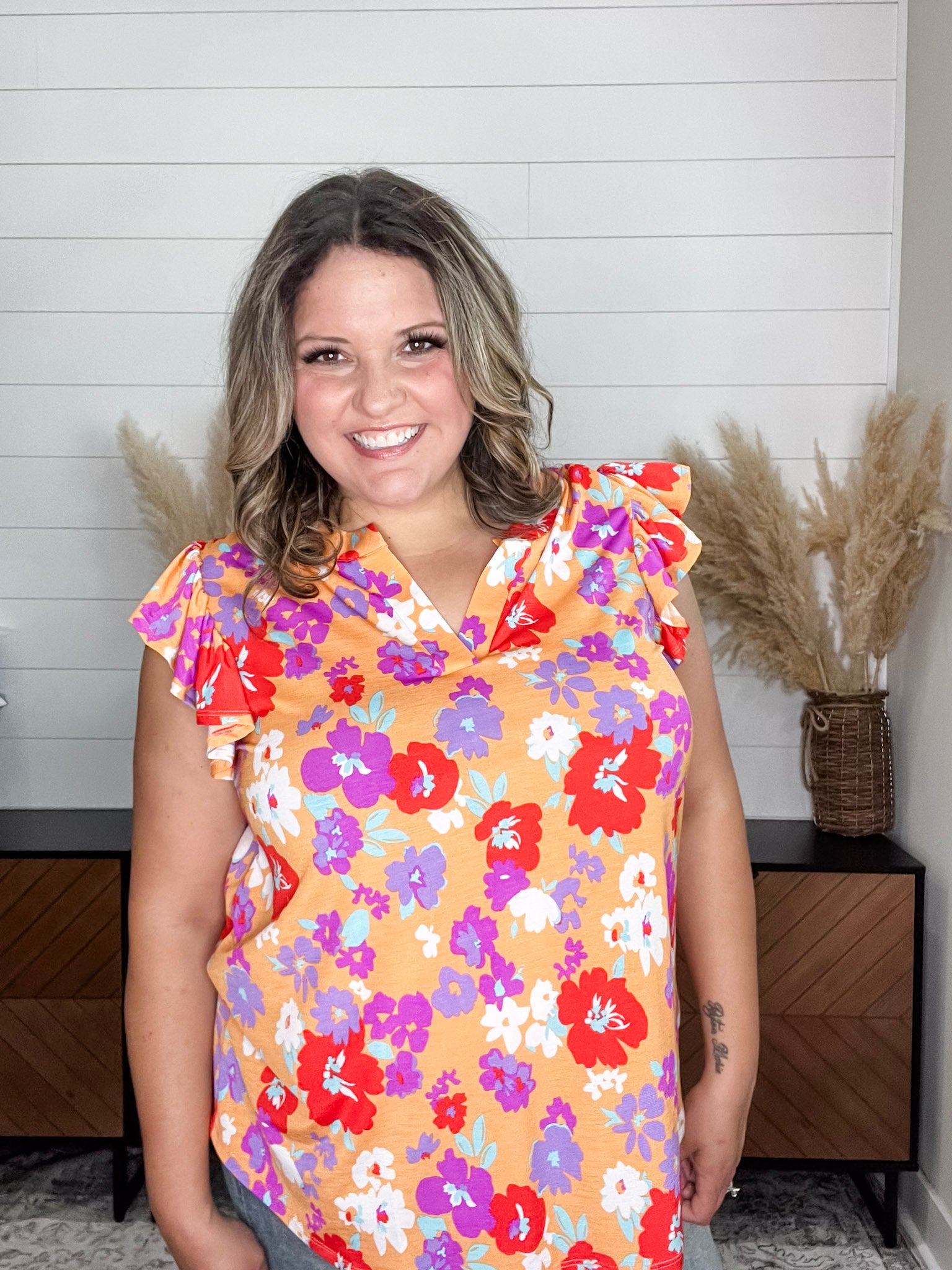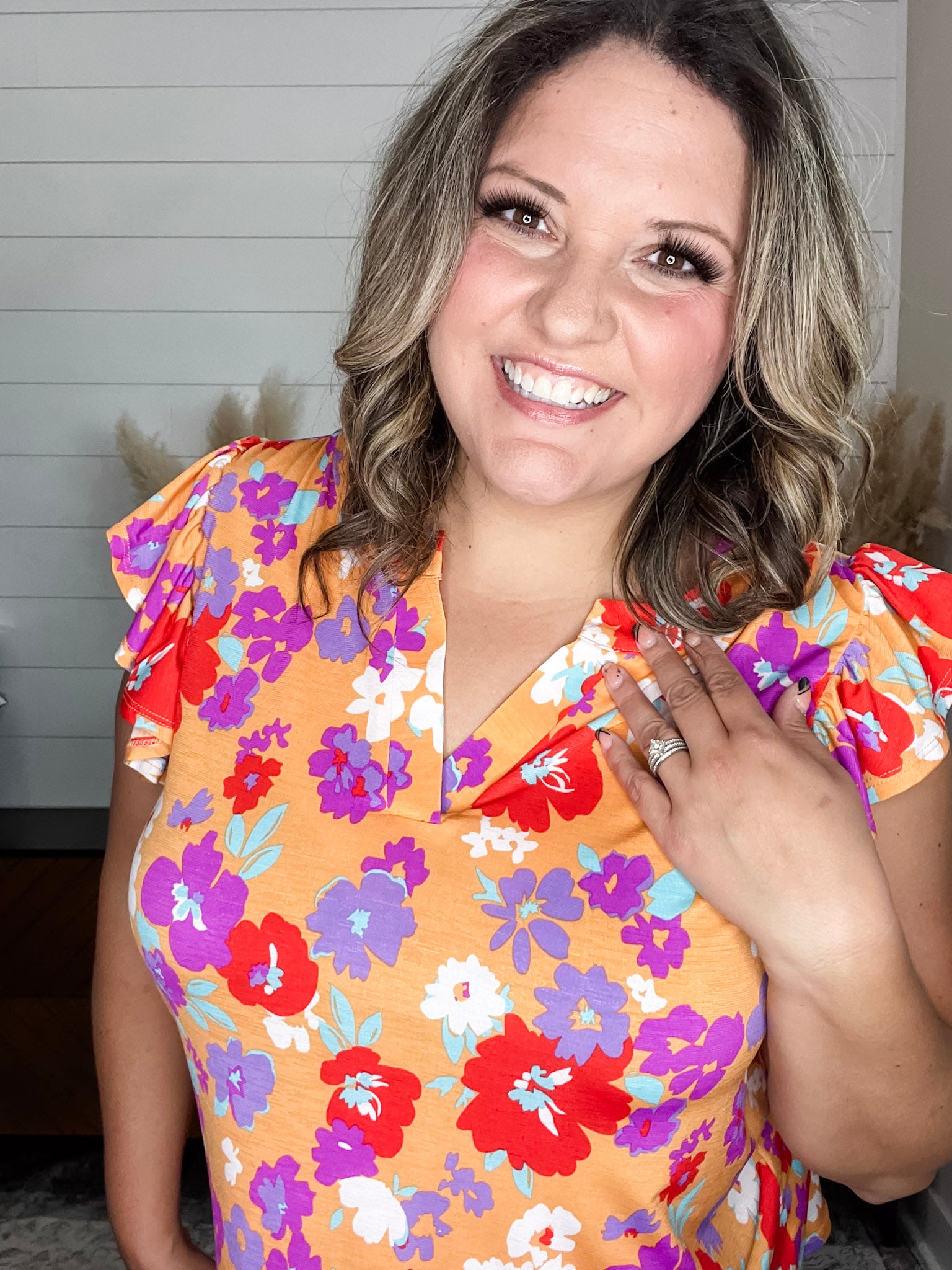 The "Moxley" Ruffle Cap Sleeve Lizzy exudes elegance with its slinky and stretchy fabric, providing a comfortable and true to size fit. The tangerine base and floral design add a pop of color while the large bust-friendly design offers a flattering silhouette. Perfect for any formal occasion.