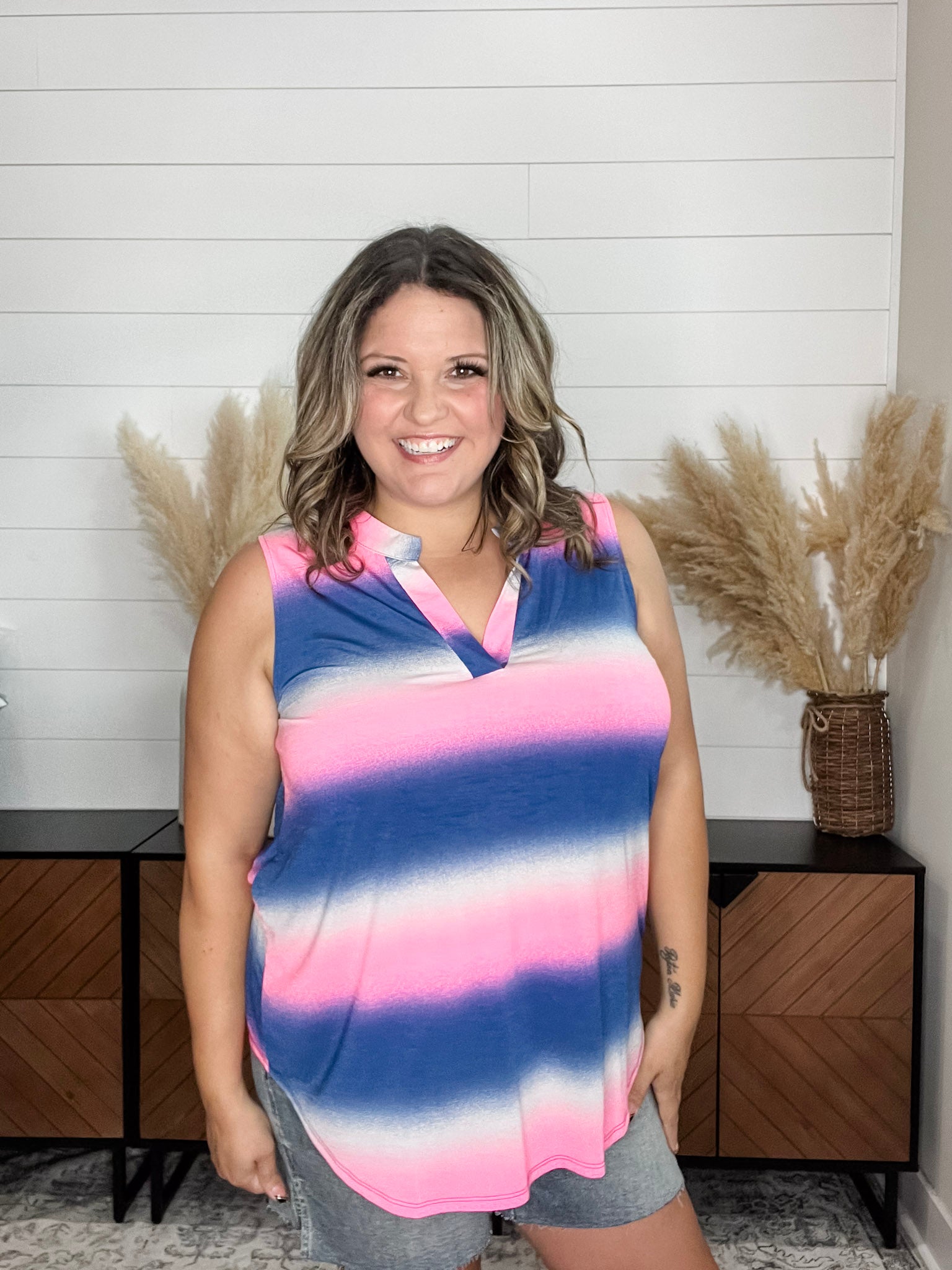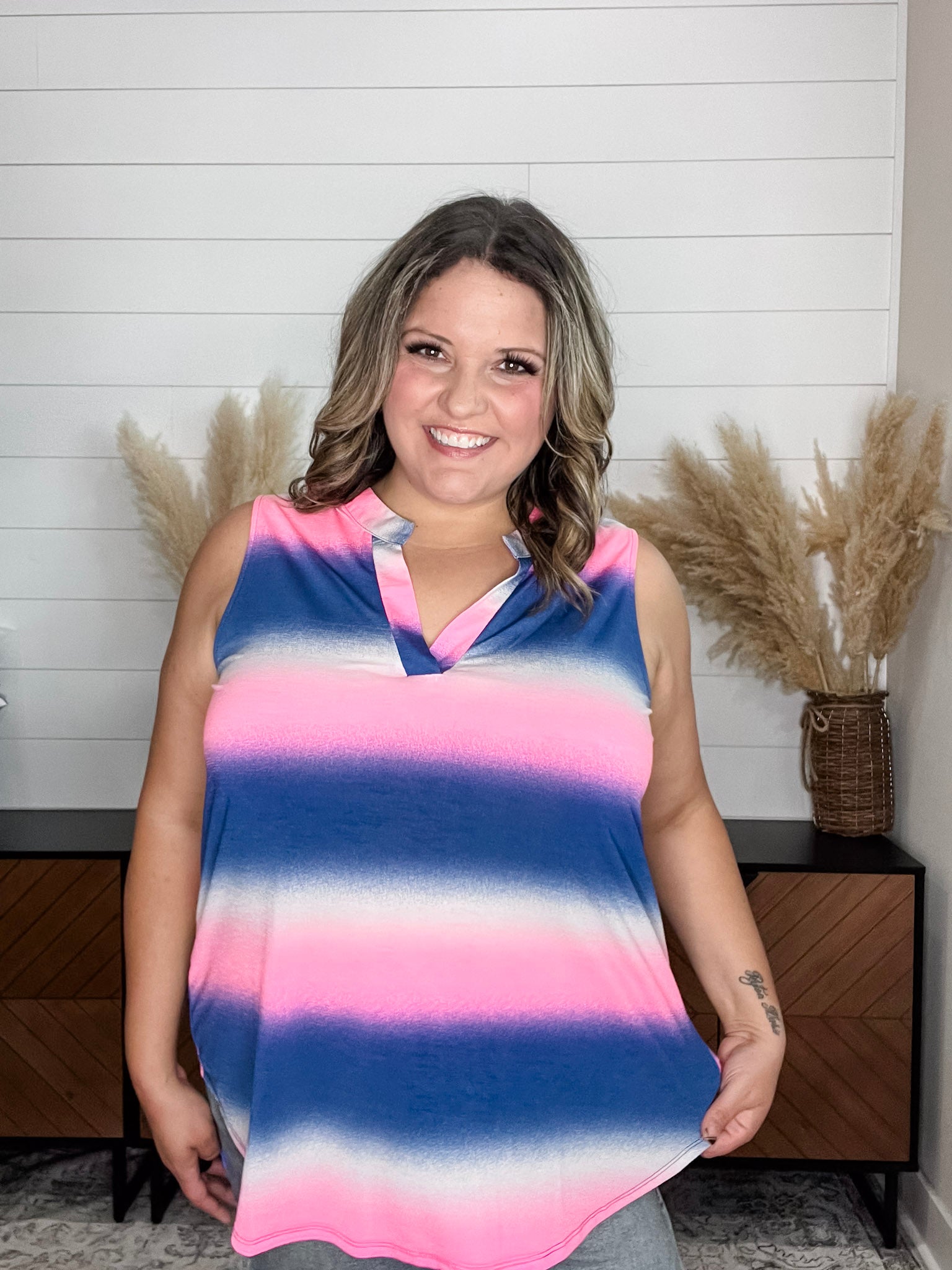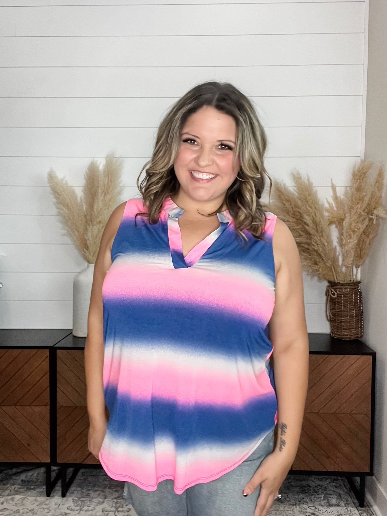 The "Napa" Sleeveless Lizzy is designed for comfort and style. Its slinky stretchy fabric provides a perfect fit that is true to size. With its large bust friendly design, this sleeveless top is perfect for everyday wear or a night out on the town.
