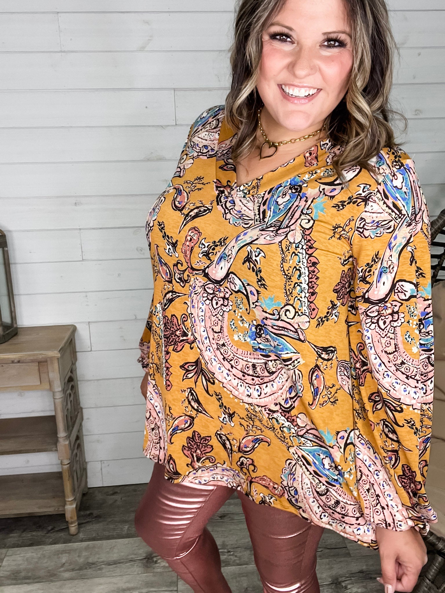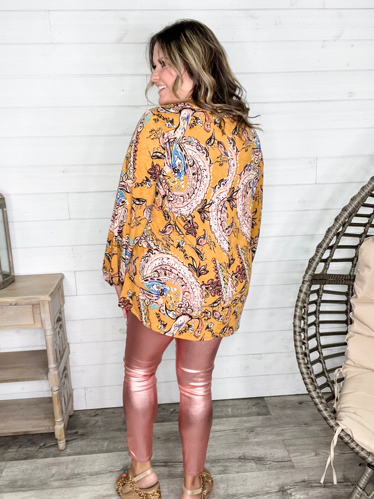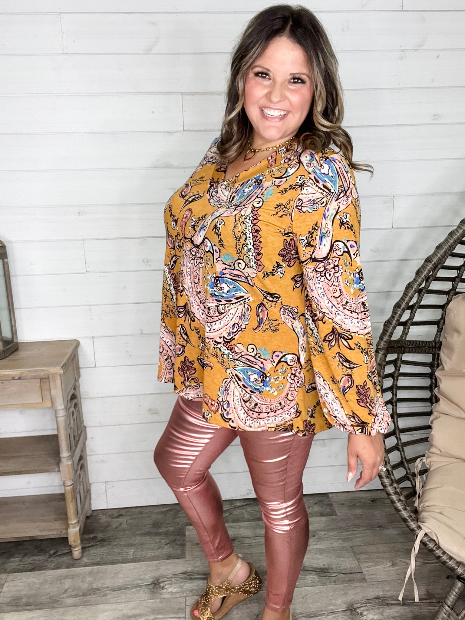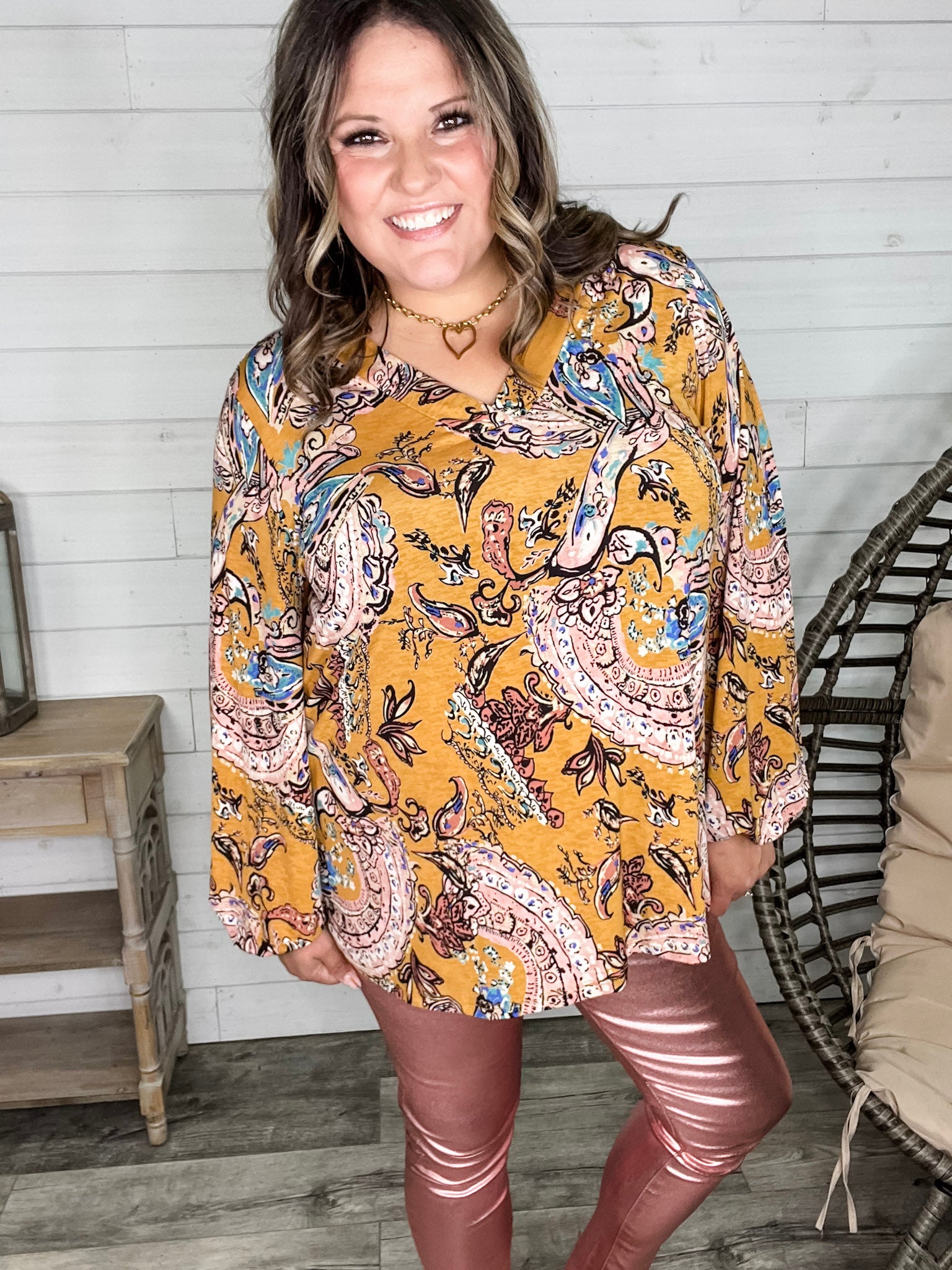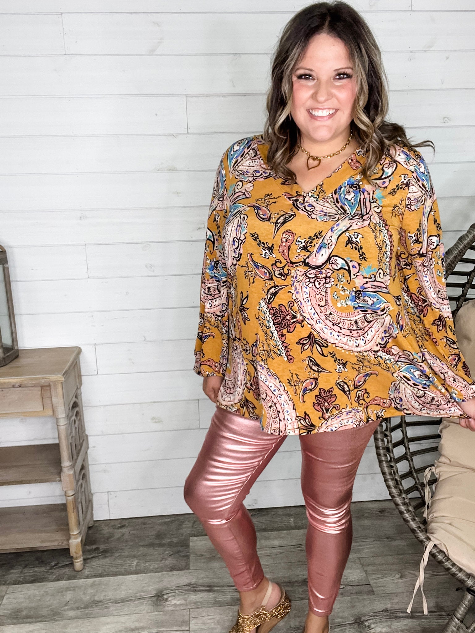 The "Nova" Long Balloon Sleeve Paisley V Neck is a playful and stretchy top that hugs your curves with a slinky fit. Its unique balloon sleeves add a fun twist, while the paisley pattern brings a touch of boho charm. For the perfect fit, we recommend sizing down one. Perfect for turning heads with effortless style!