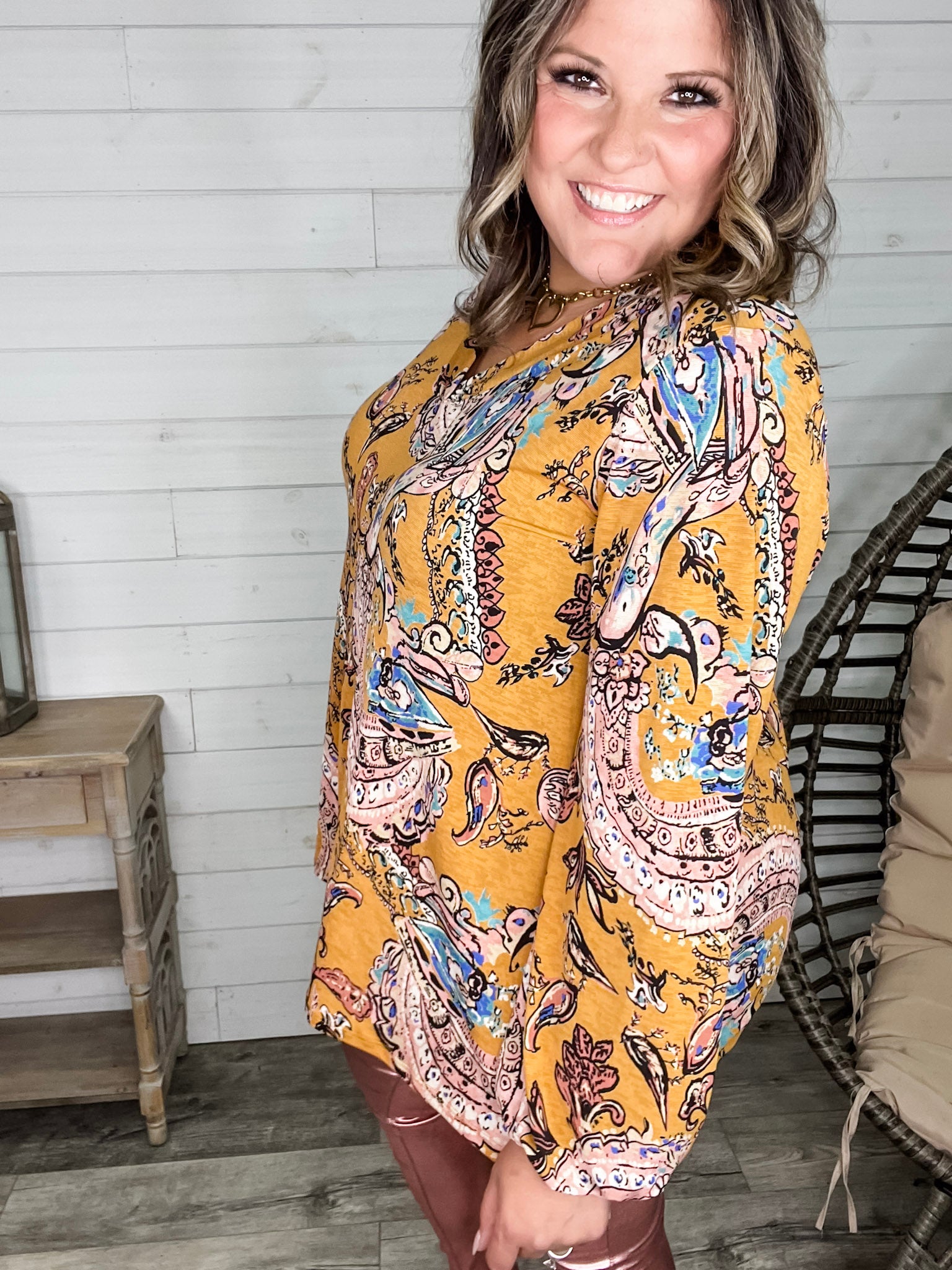 "Nova" Long Balloon Sleeve Paisley V Neck