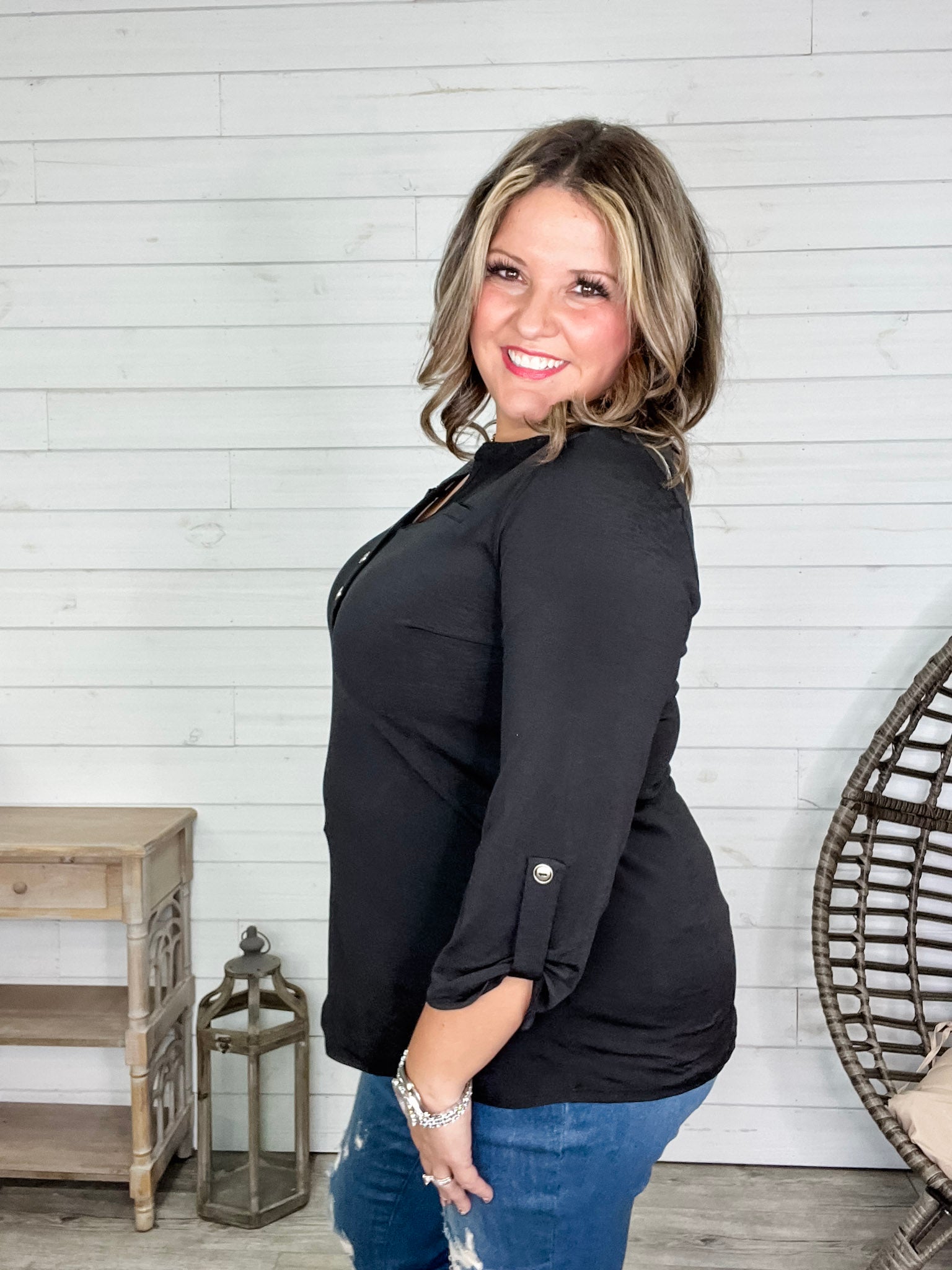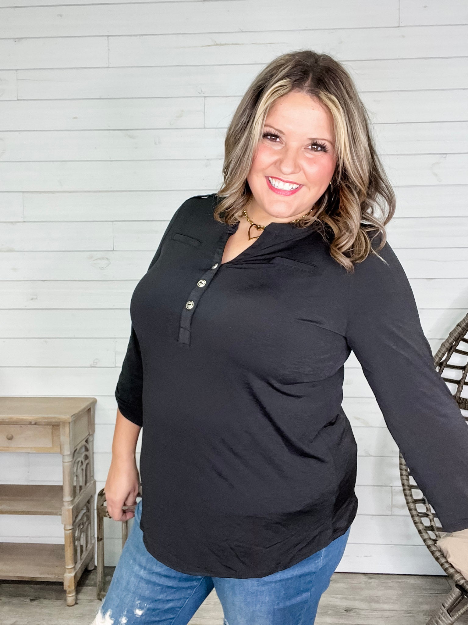 "Obsolete" 3/4 Sleeve Button Front Lizzy Luxe (Black)
